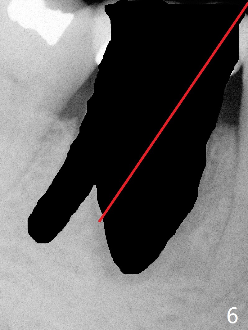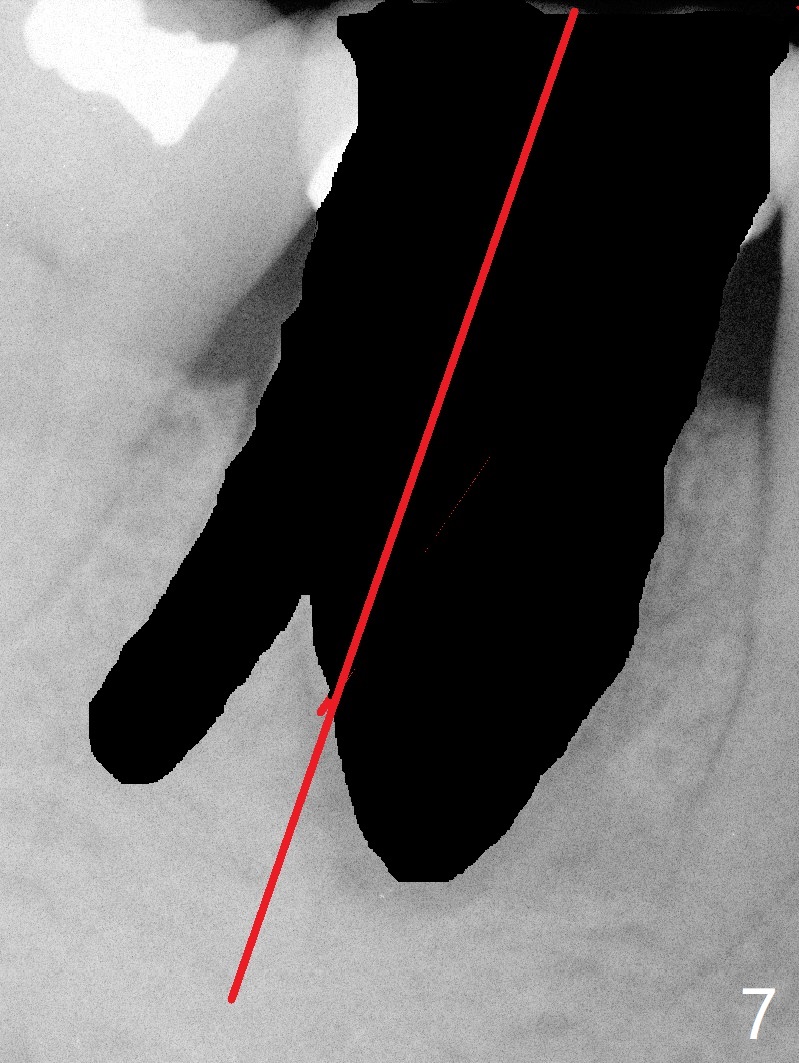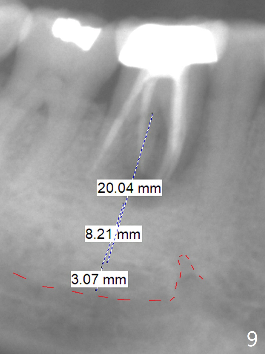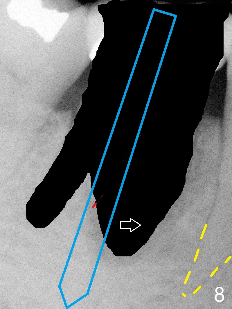A 55-year-old woman has severe bone loss (Fig.1 with buccal and lingual fistulae) around the mesial (M in Fig.2) and distolingual (DL) roots. If there is a septum after extraction (Fig.3 S), osteotomy will be established in the septum to enhance primary stability (Fig.4). When the septum cannot be saved (Fig.5), osteotomy is to be initiated in the septal slope oblique (Fig.6 <). The osteotomy will be straightened once an entry is made (Fig.7). The initial osteotomy is slightly distal, since as osteotomy increases (Fig.8 blue), it tends to shift mesial (arrow). In addition, the apex of the 2nd bicuspid tilts distal (yellow dashed line). Depth of osteotomy is 20 mm (crest, Fig.9) or 18 mm (septum) so that 8 mm of the native bone can be obtained with 3 mm clearance from the Inferior Alveolar Canal (red dashed line). PRFx2 is required (seems not done).