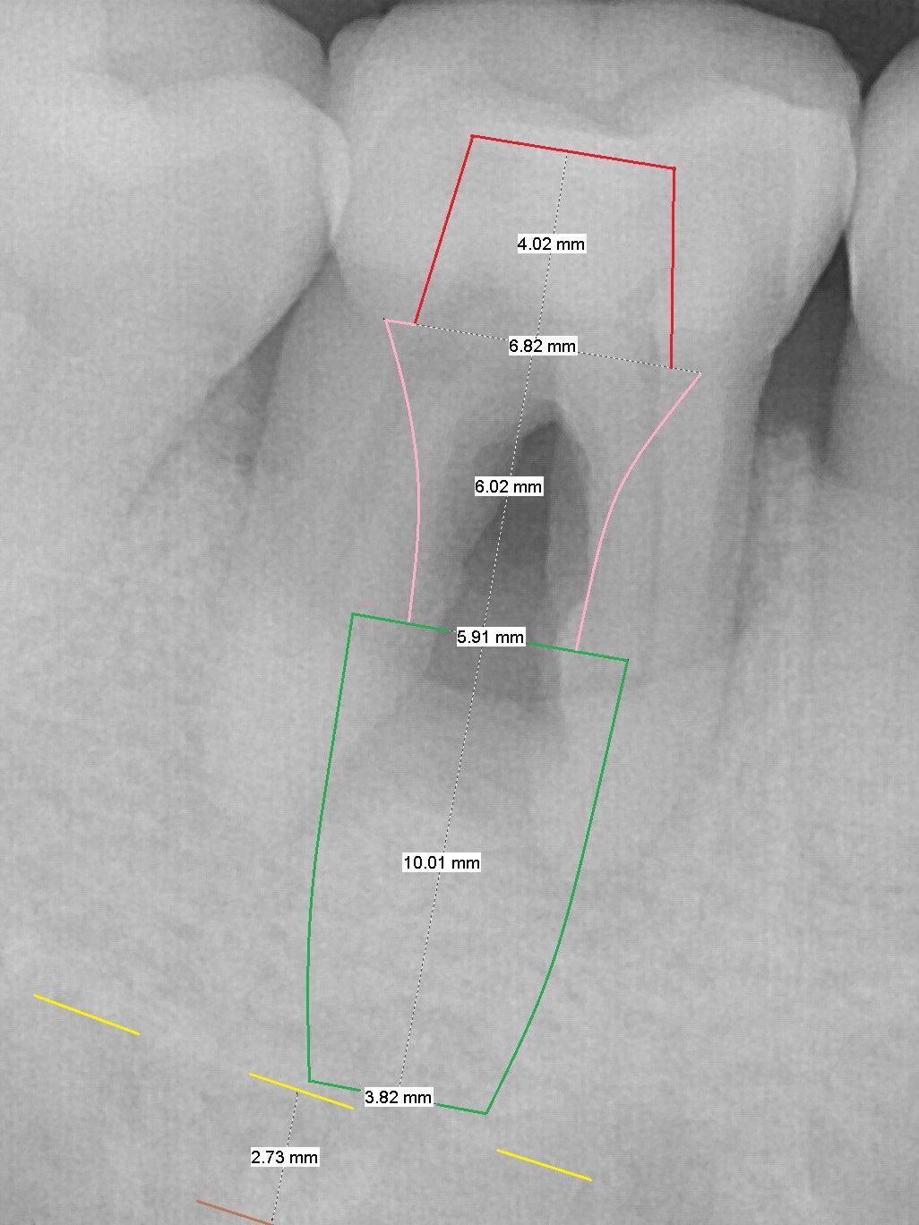 A 45-year-old man had Class I or II furcation involvement at the tooth #30 ten years ago (Fig.1, Classifications of Furcation Involvement - Stedman's Online). He returns recently requesting composite to seal Class IV furcation involvement (Fig.2). It appears that the tooth is unsalvageable (Fig.3 (no Antibiotic)). Since it is difficult to differentiate the upper (yellow dashed line) vs. the lower (brown line) borders of the Inferior Alveolar Canal, the initial depth will be 8 mm. Take panoramic X-ray if necessary. Because of severe bone loss, an abutment with 6 mm cuff is to be used (Pink area).