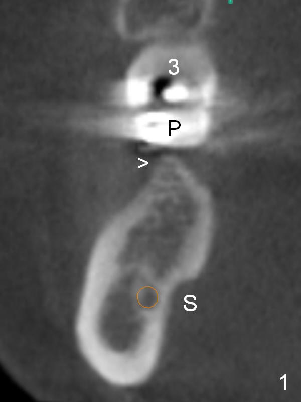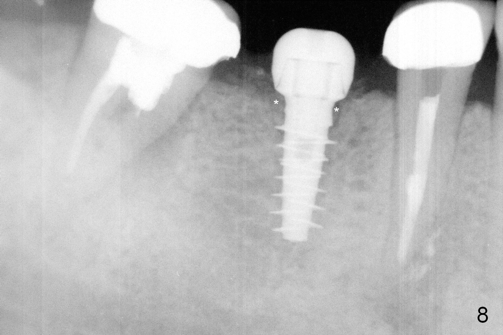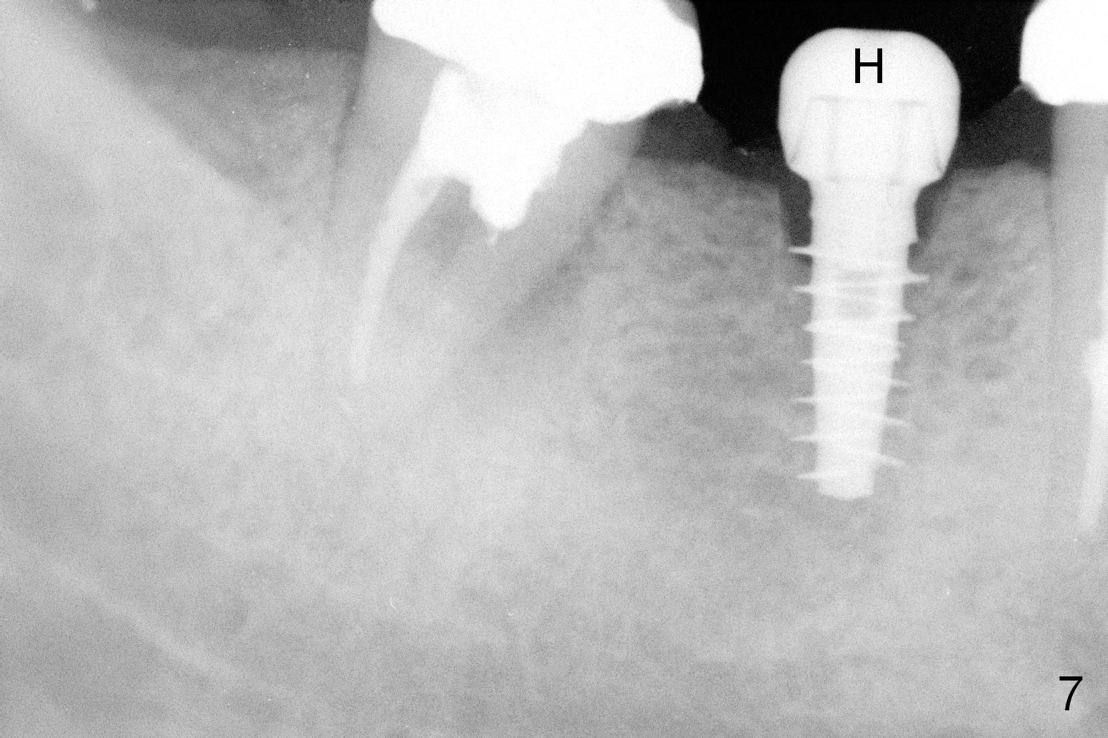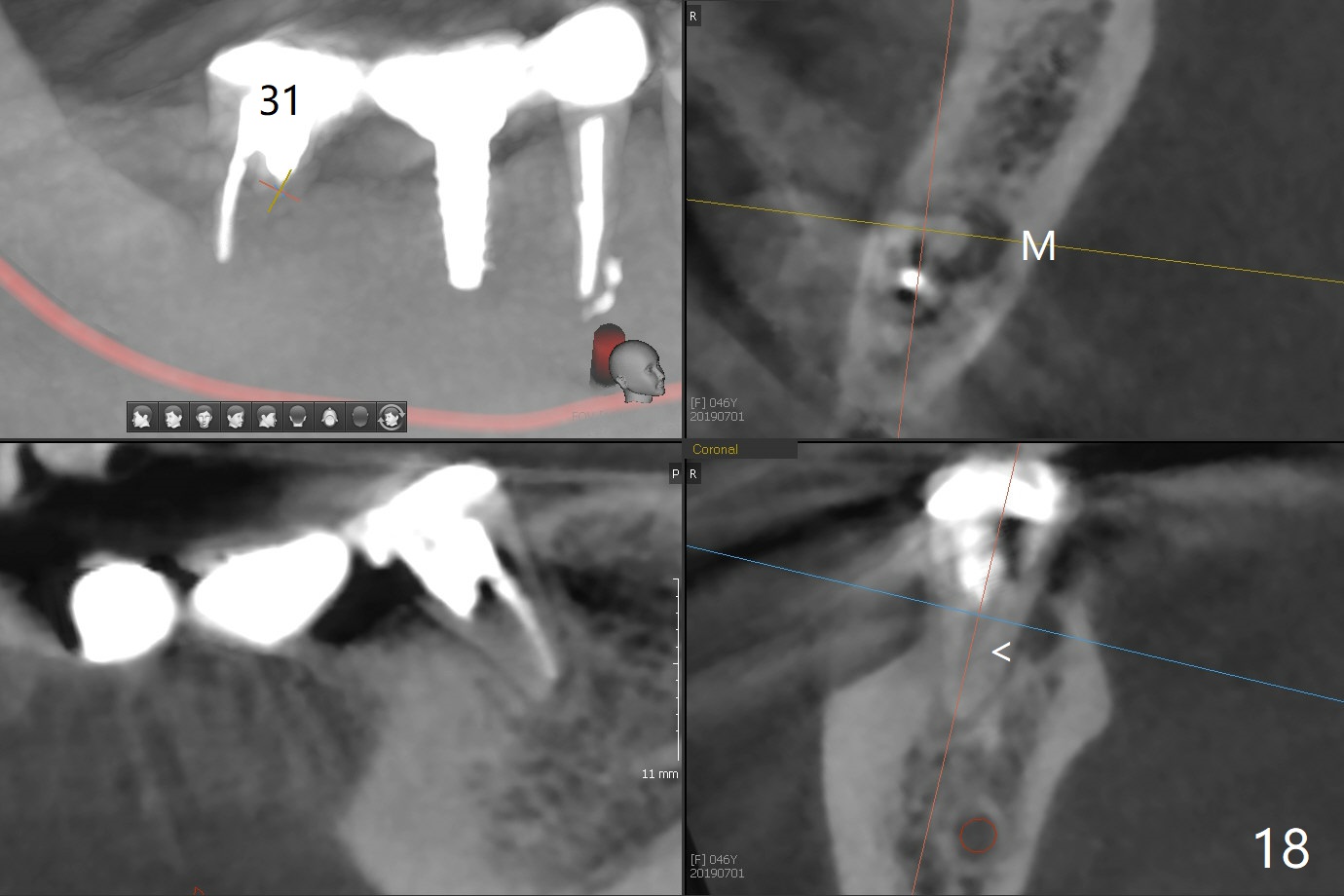 CBCT was taken (Fig.1,2 (P: pontic; S; submandibular fossa)) several months prior to #29 and 31 RCT and #31 porcelain chip (Fig.3). When the bridge is sectioned, the pointed ridge at #30 (Fig.1) is confirmed (Fig.4,5). After flattening the ridge until 6 mm buccolingually (Fig.6 arrowheads), osteotomy is initiated with 1.6 mm drill at 9 mm; there is 2.5 mm clearance from the superior border of the Inferior Alveolar Canal (red dashed line). A 4.5x9(1) mm Magicore is placed with 35 Ncm (insertion torque) after 4.3 mm Magic Drill; a 4.5 mm healing abutment (Fig.7 H). An error occurs because of using 1 mm cuff of the Magicore. Ideally 3 or 4 mm cuff should have been used because of reduction of the ridge by ~ 3 mm (Fig.2). The result of the error is failure of placing the implant at the desirable depth (<9 mm). The coronal threads are exposed and have to be covered by bone graft (autogenous bone and allograft (.5-1.5 mm) (Fig.8 *), followed by collagen dressing. Extra suturing is done to securely close the wound (Fig.9), followed by periodontal dressing (data not shown).