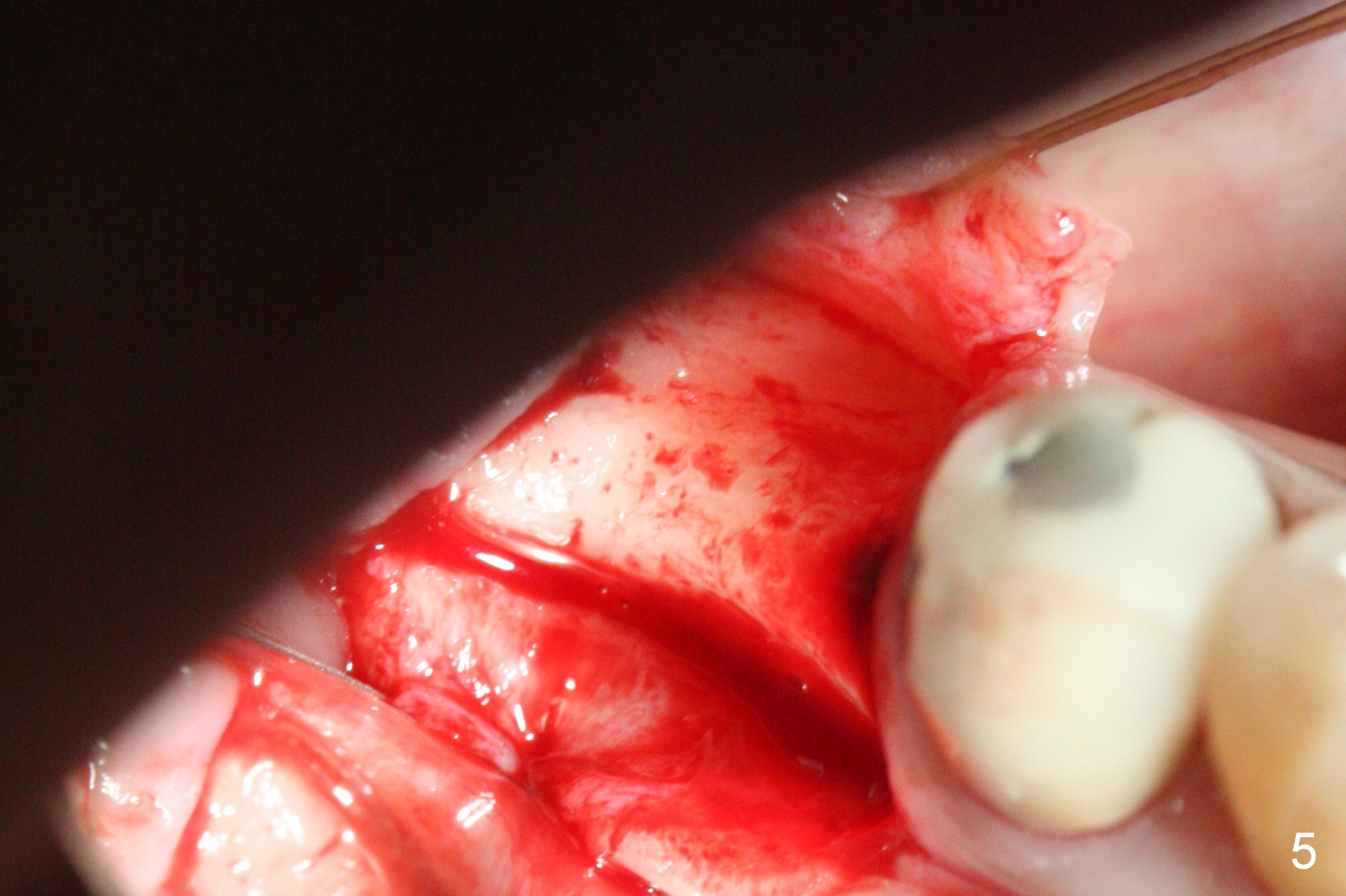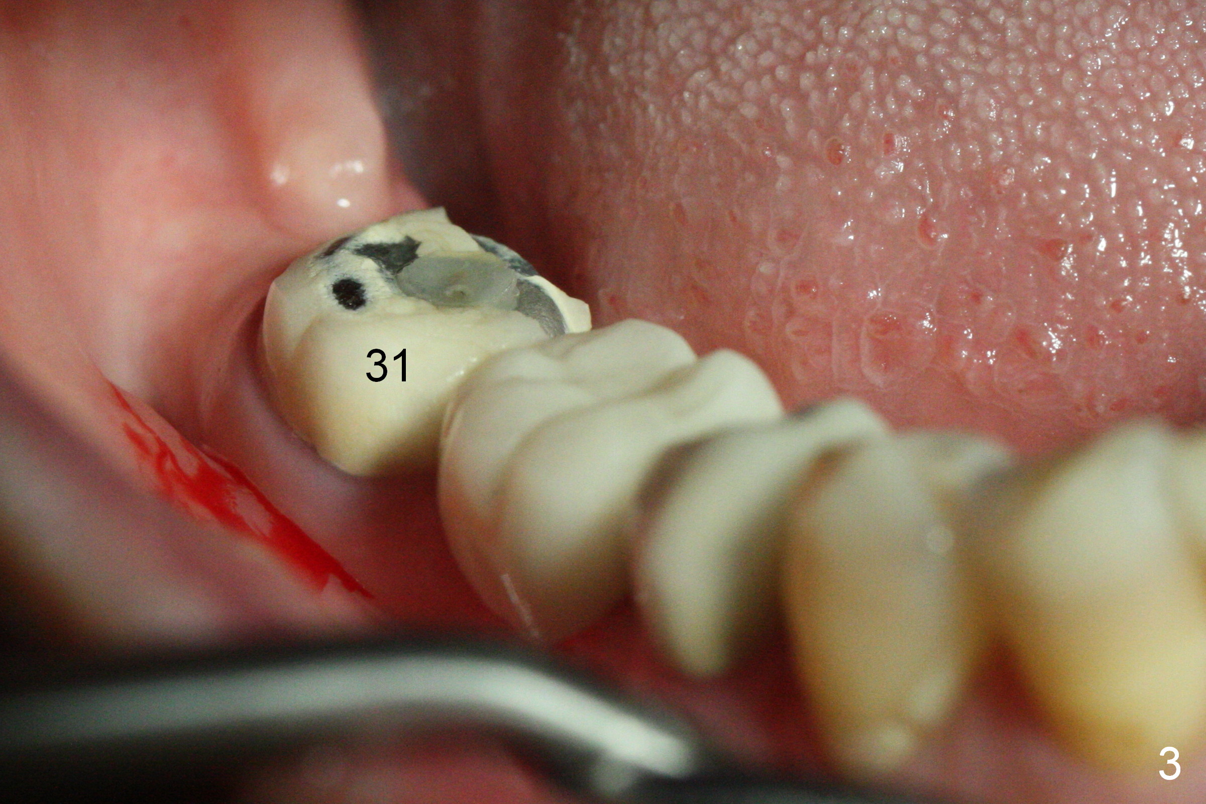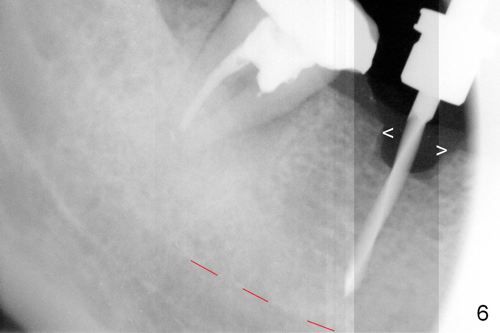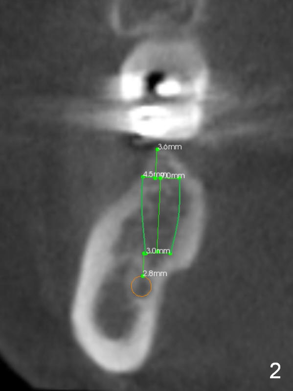 CBCT was taken (Fig.1,2 (P: pontic; S; submandibular fossa)) several months prior to #29 and 31 RCT and #31 porcelain chip (Fig.3). When the bridge is sectioned, the pointed ridge at #30 (Fig.1) is confirmed (Fig.4,5). After flattening the ridge until 6 mm buccolingually (Fig.6 arrowheads), osteotomy is initiated with 1.6 mm drill at 9 mm; there is 2.5 mm clearance from the superior border of the Inferior Alveolar Canal (red dashed line). A 4.5x9(1) mm Magicore is placed with 35 Ncm (insertion torque) after 4.3 mm Magic Drill; a 4.5 mm healing abutment (Fig.7 H). An error occurs because of using 1 mm cuff of the Magicore. Ideally 3 or 4 mm cuff should have been used because of reduction of the ridge by ~ 3 mm (Fig.2). The result of the error is failure of placing the implant at the desirable depth (<9 mm). The coronal threads are exposed and have to be covered by bone graft (autogenous bone and allograft (.5-1.5 mm) (Fig.8 *), followed by collagen dressing. Extra suturing is done to securely close the wound (Fig.9), followed by periodontal dressing (data not shown).