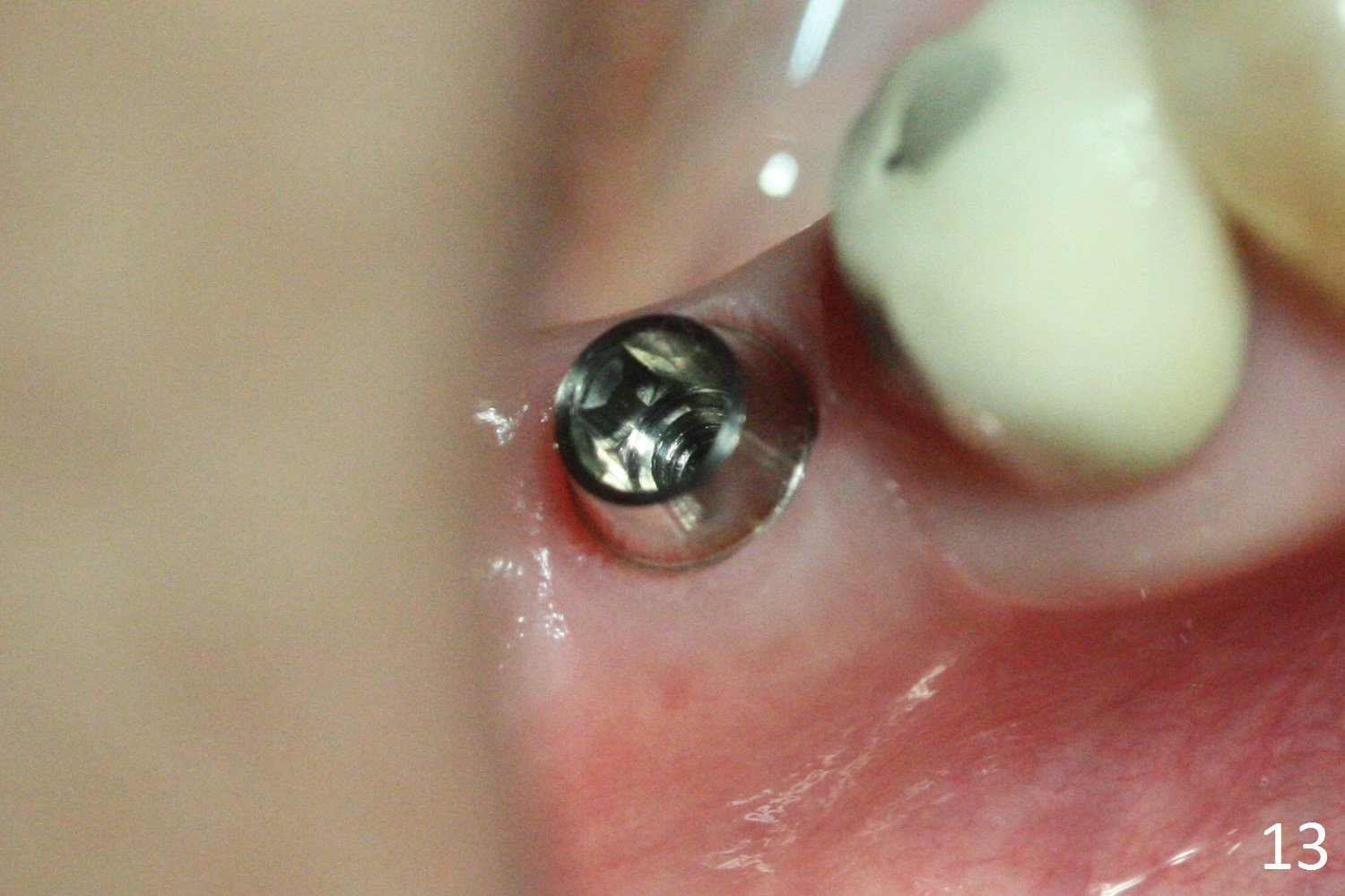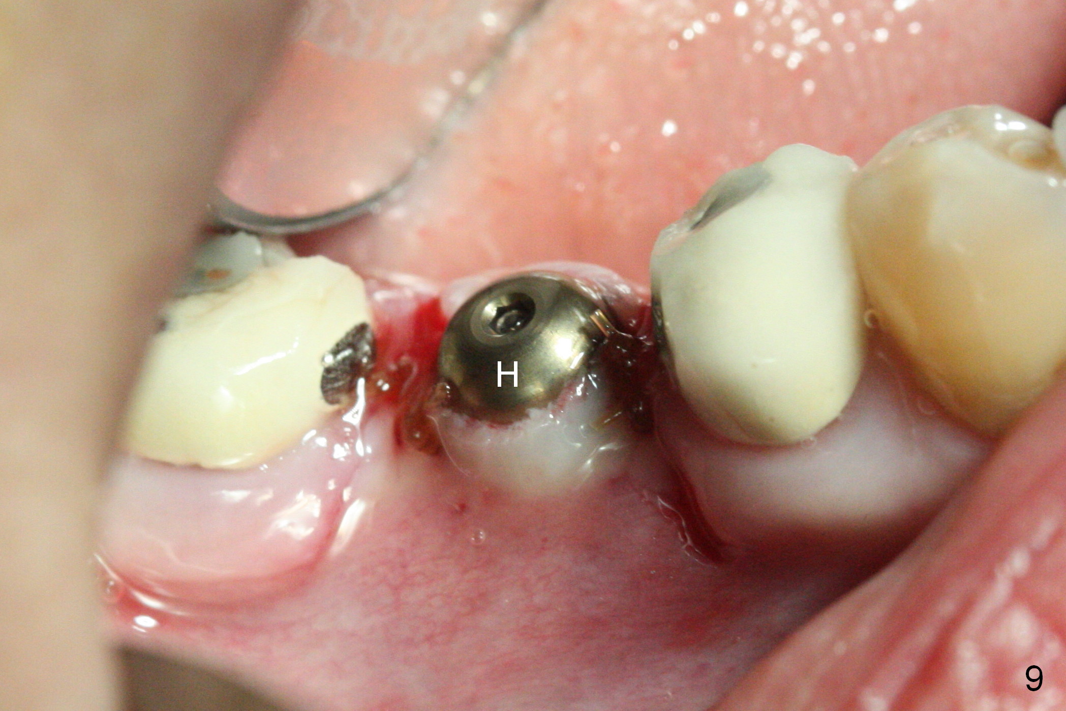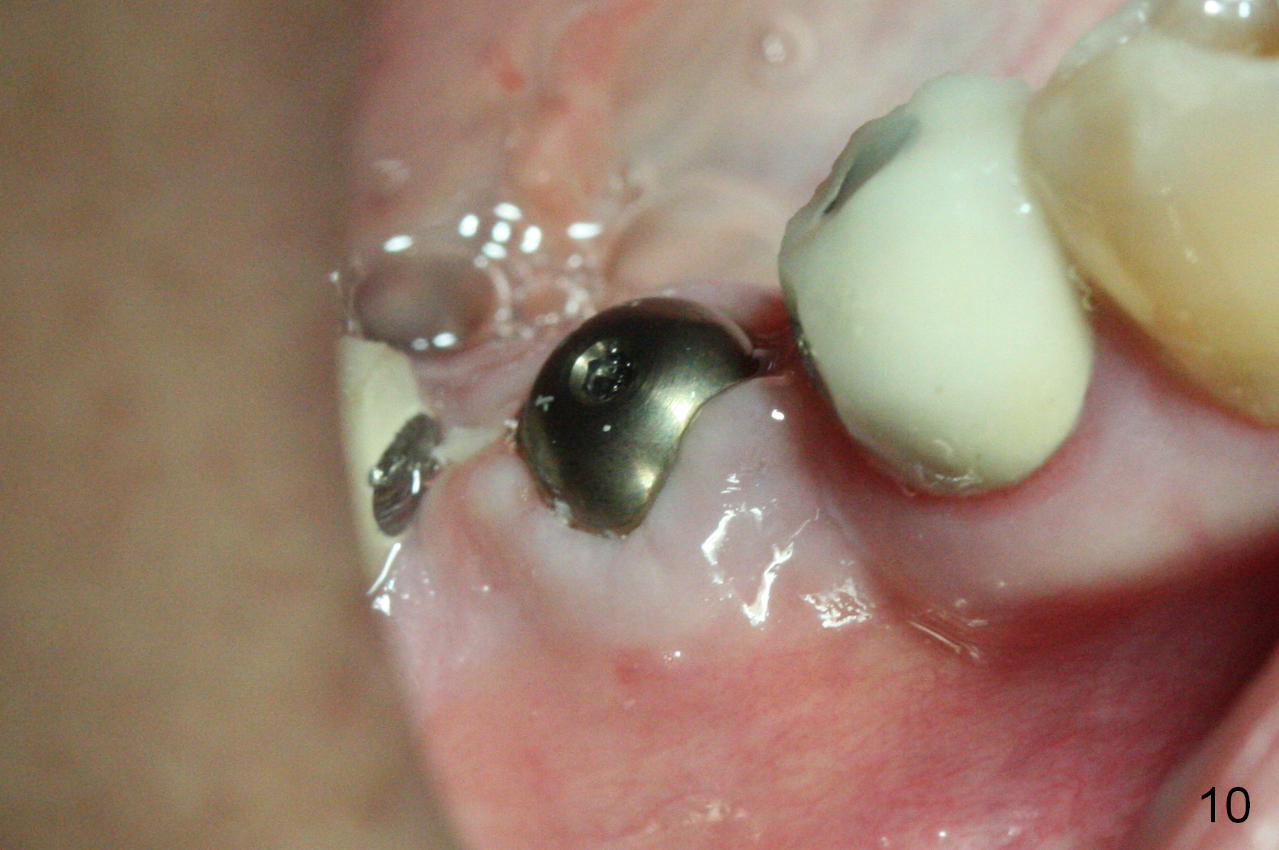 The wound is healing 8 days postop (Fig.10). Because of the short cuff (subgingival margin), screw retention type of restoration will be used, in contrast to cement type of the 2nd case. In fact, FC one is used.