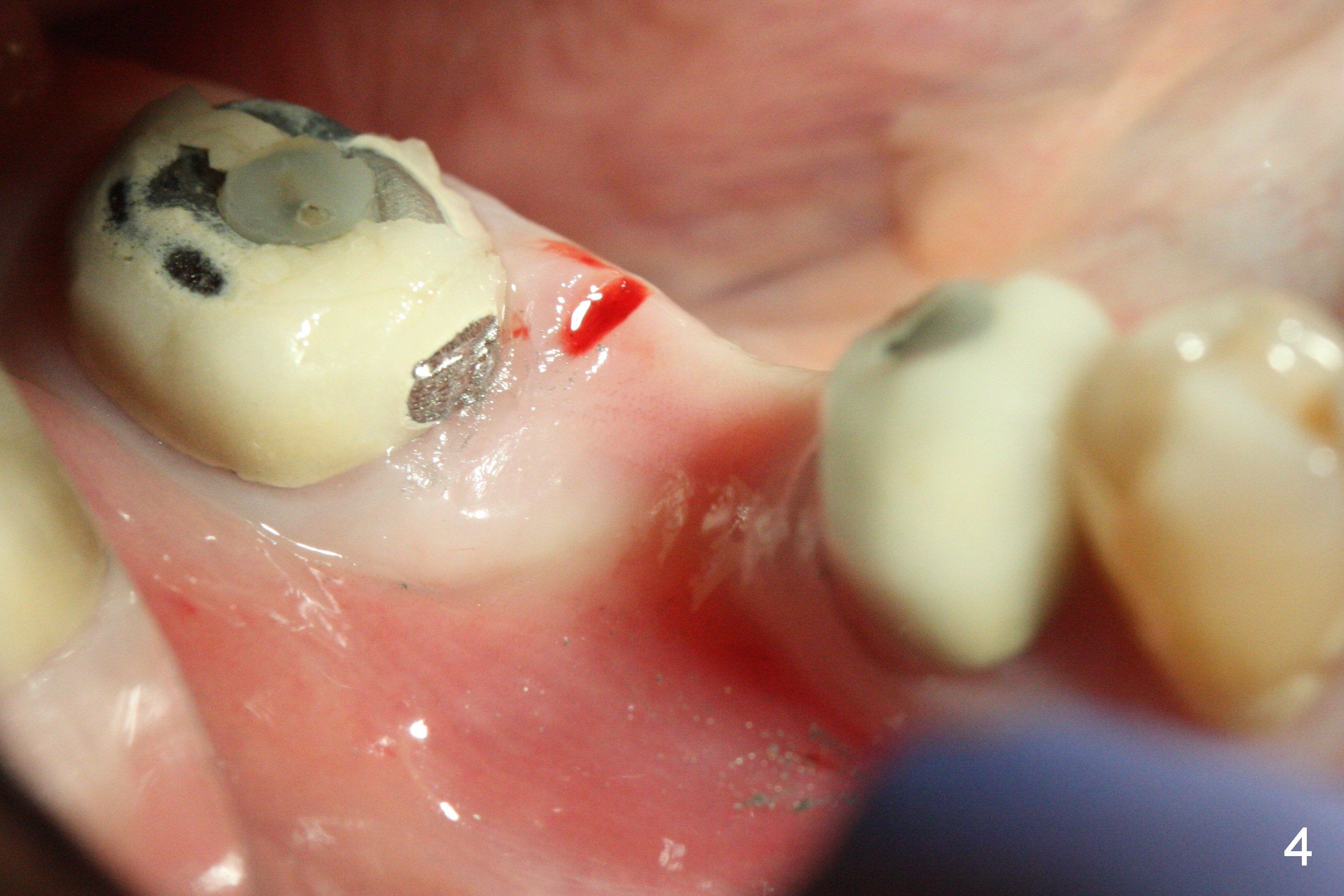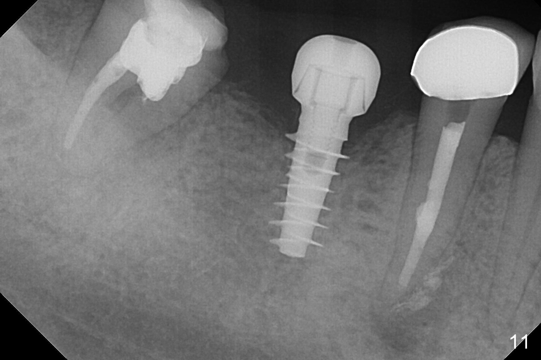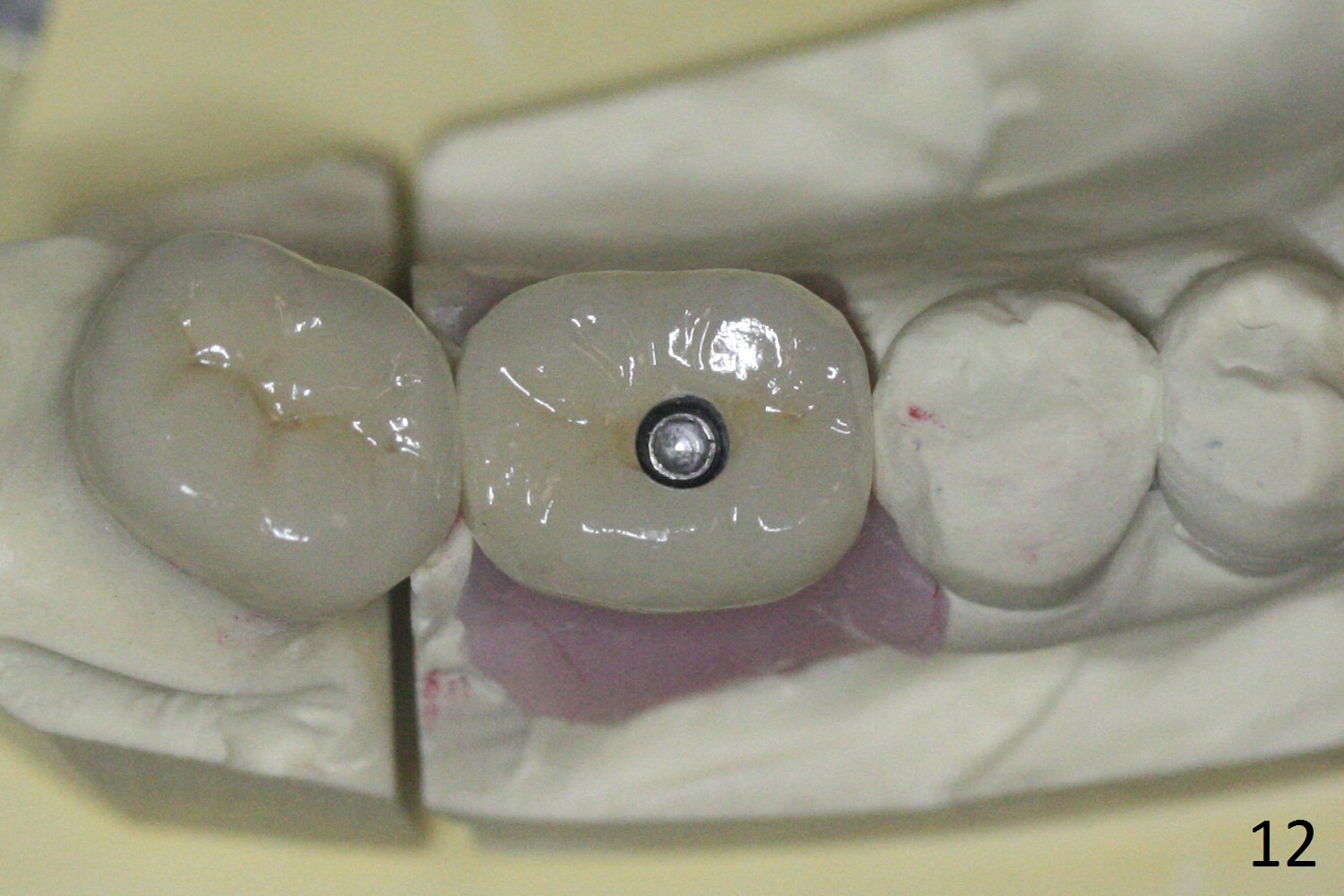 The wound is healing 8 days postop (Fig.10). Because of the short cuff (subgingival margin), screw retention type of restoration will be used, in contrast to cement type of the 2nd case. In fact, FC one is used.