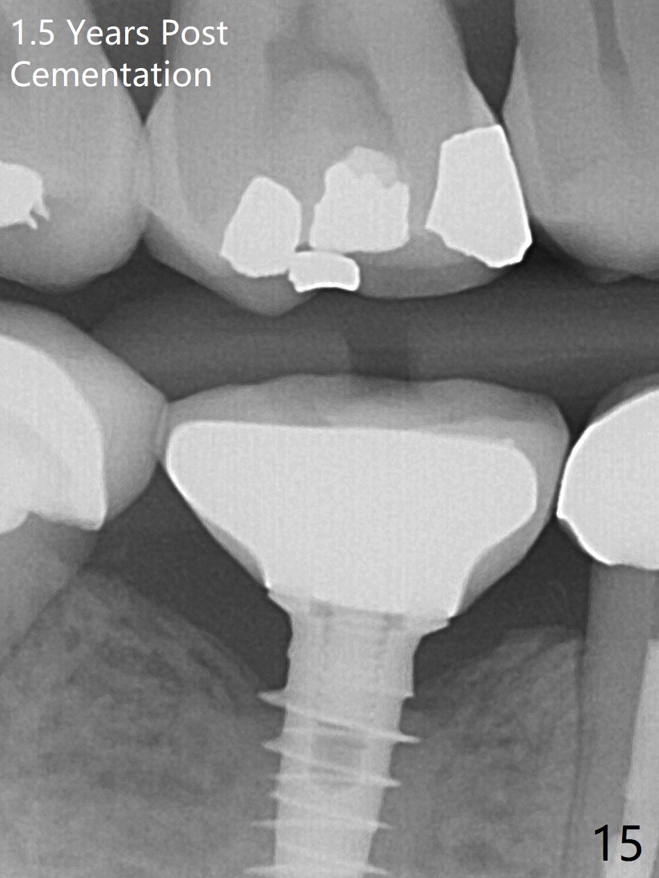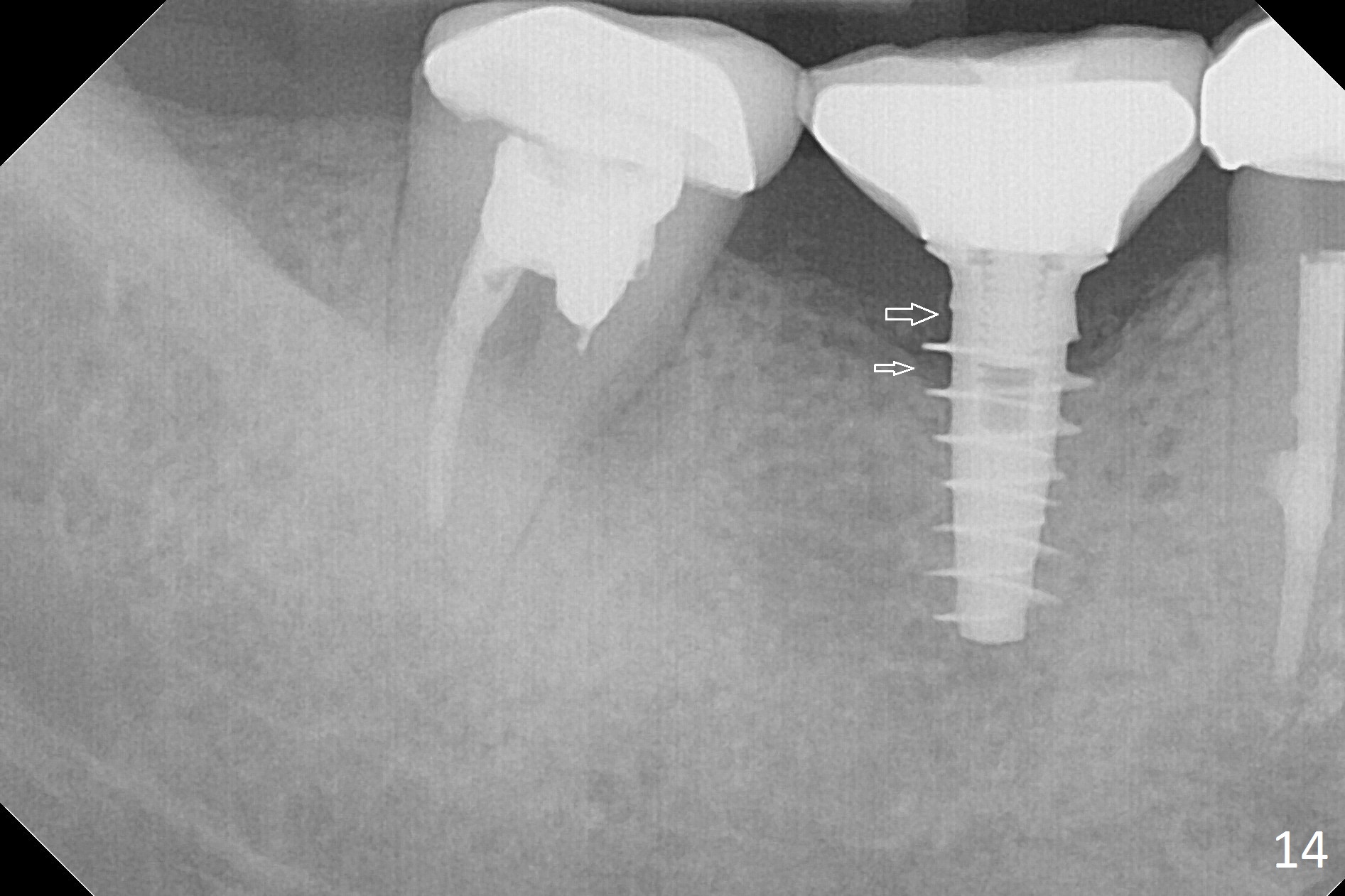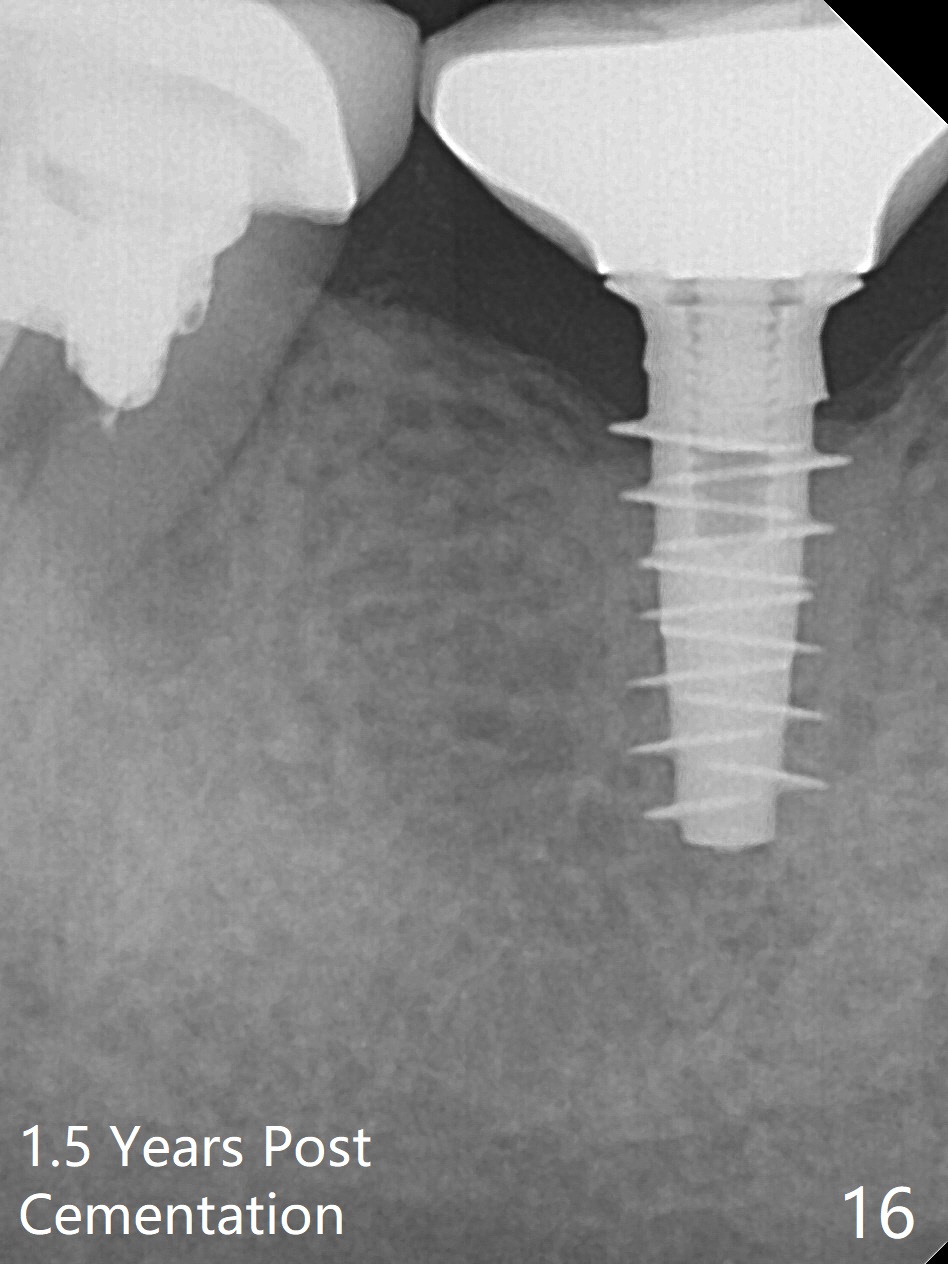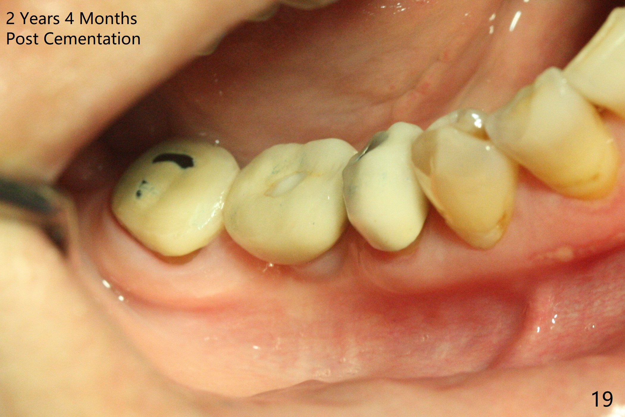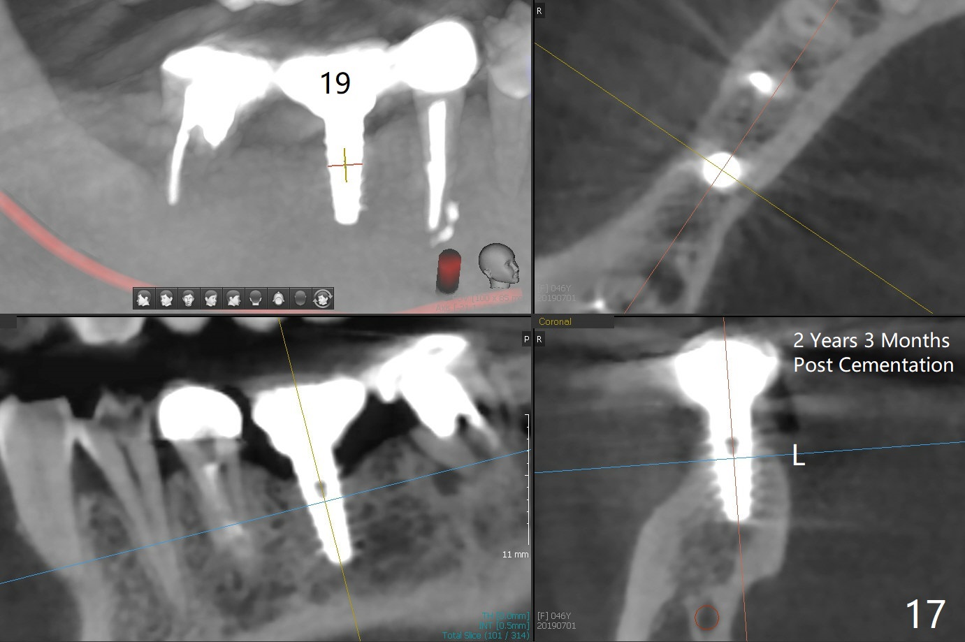 Splinted provisional is fabricated #30 and 31 one month postop. The patient returns for final restoration (single units) nearly 4 months postop (Fig.11). Since the margin is subgingival, a screw type crown is fabricated for #30 (Fig.12). The buccal gingiva looks convex after healing cap removal (Fig.13, as compared to Fig.4 (concave)). PA is taken immediately post tightening and cementation (Fig.14, 5 months postop). It appears that new bone has grown between the most coronal threads (arrows). The bone density immediately around the implant appears to increase 1.5 years post cementation (Fig.15,16). She returns because of failure of 18-20 bridge (implants will be placed at 18/19). The implant at #30 is in fact not placed deep enough; the coronal threads seem to be exposed, although there is no periimplantitis (Fig.17 CT). The tooth #31 is symptomatic; the mesial canal is missing (Fig.18 M, <). The gingiva around the crowns at #30 and 31 remains healthy 2 years 4 months post cementation (Fig.19). Metal exposure of the crown at #31 is intentional. Occlusal reduction is done to alleviate periapical re-infection (Fig.18).