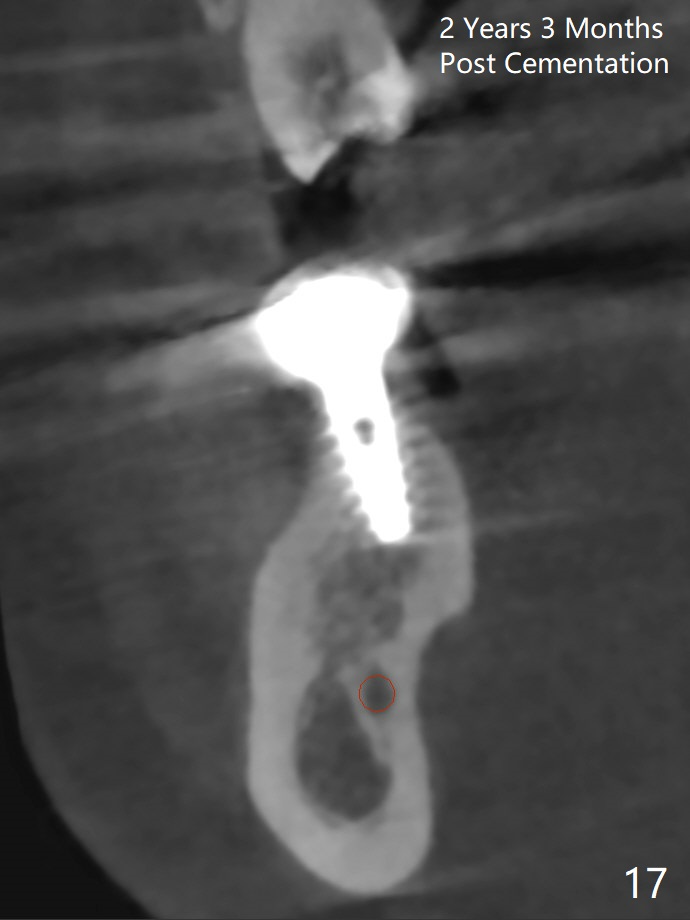 CBCT was taken (Fig.1,2 (P: pontic; S; submandibular fossa)) several months prior to #29 and 31 RCT and #31 porcelain chip (Fig.3). When the bridge is sectioned, the pointed ridge at #30 (Fig.1 >) is confirmed (Fig.4,5). After flattening the ridge until the ridge is 6 mm wide buccolingually (Fig.6 arrowheads), osteotomy is initiated with 1.6 mm drill at 9 mm; there is 2.5 mm clearance from the superior border of the Inferior Alveolar Canal (red dashed line). A 4.5x9(1) mm Magicore is placed with 35 Ncm (insertion torque) after 4.3 mm Magic Drill; a 4.5 mm healing abutment (Fig.7 H). An error occurs because of using 1 mm cuff of the Magicore. Ideally 3 or 4 mm cuff should have been used because of reduction in the ridge by ~ 3 mm. She returns because of failure of 18-20 bridge (implants will be placed at 18/19). The implant at #30 is in fact not placed deep enough; the coronal threads seem to be exposed, although there is no periimplantitis (good oral hygiene, Fig.17).