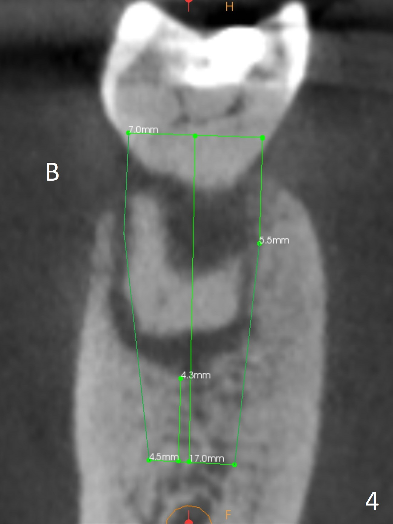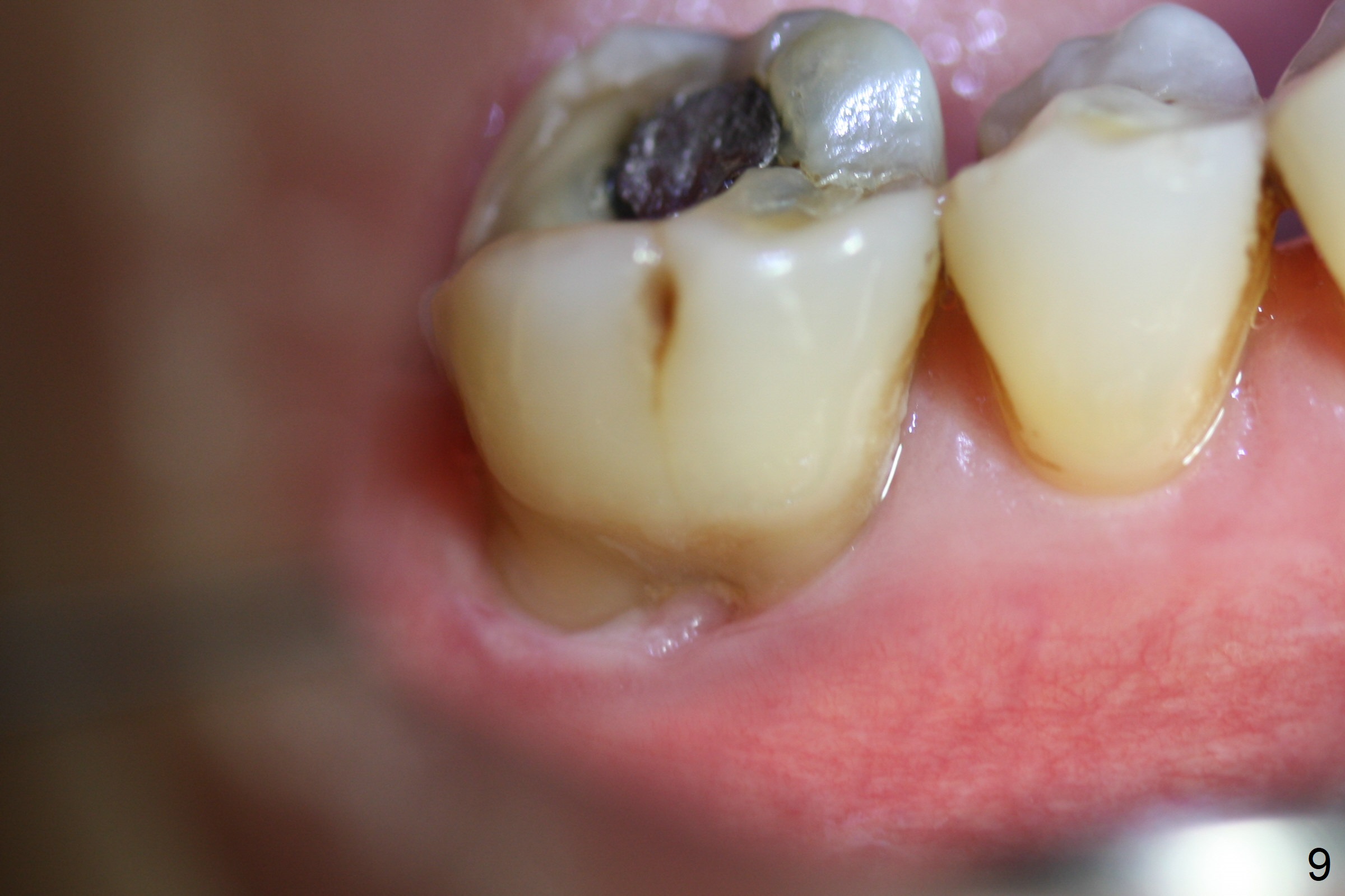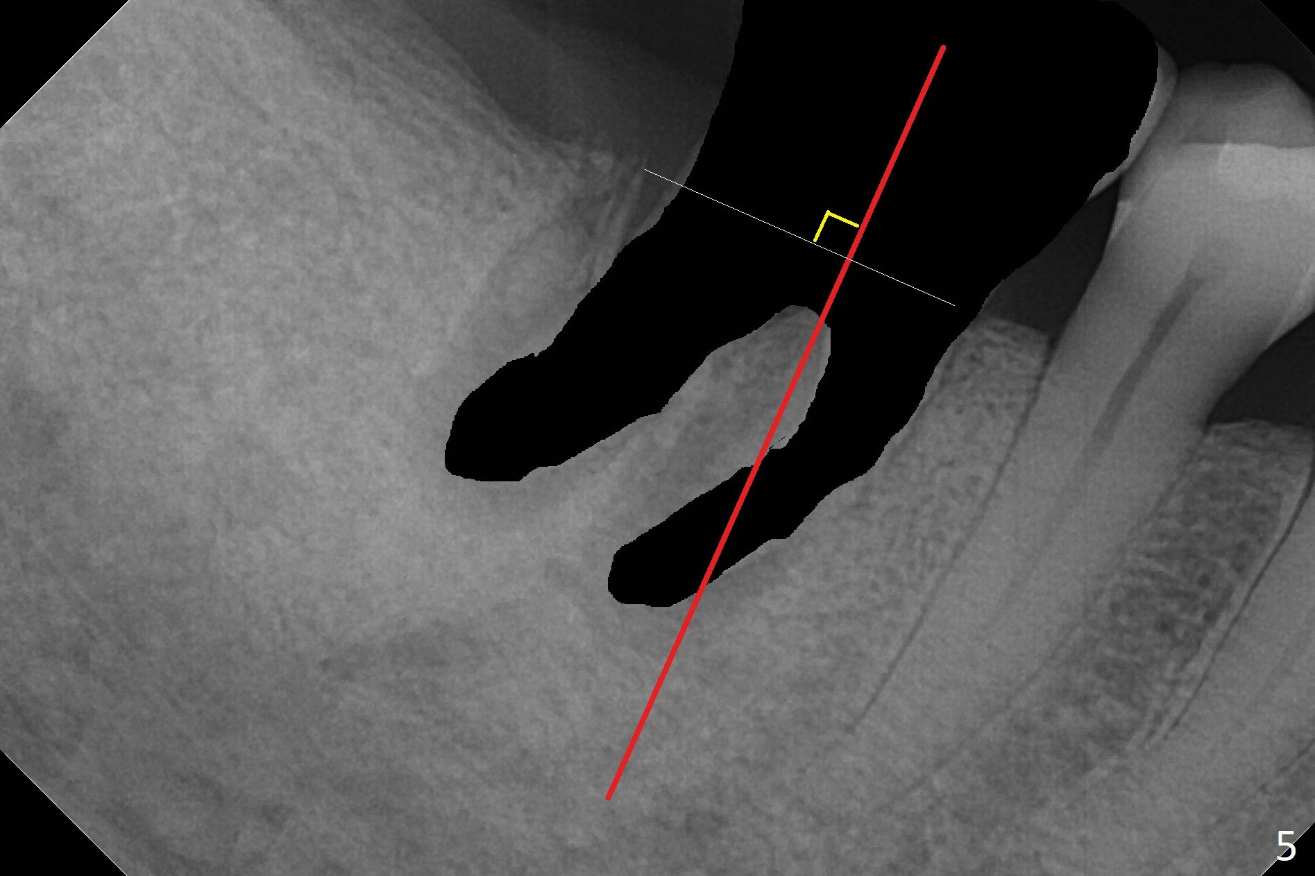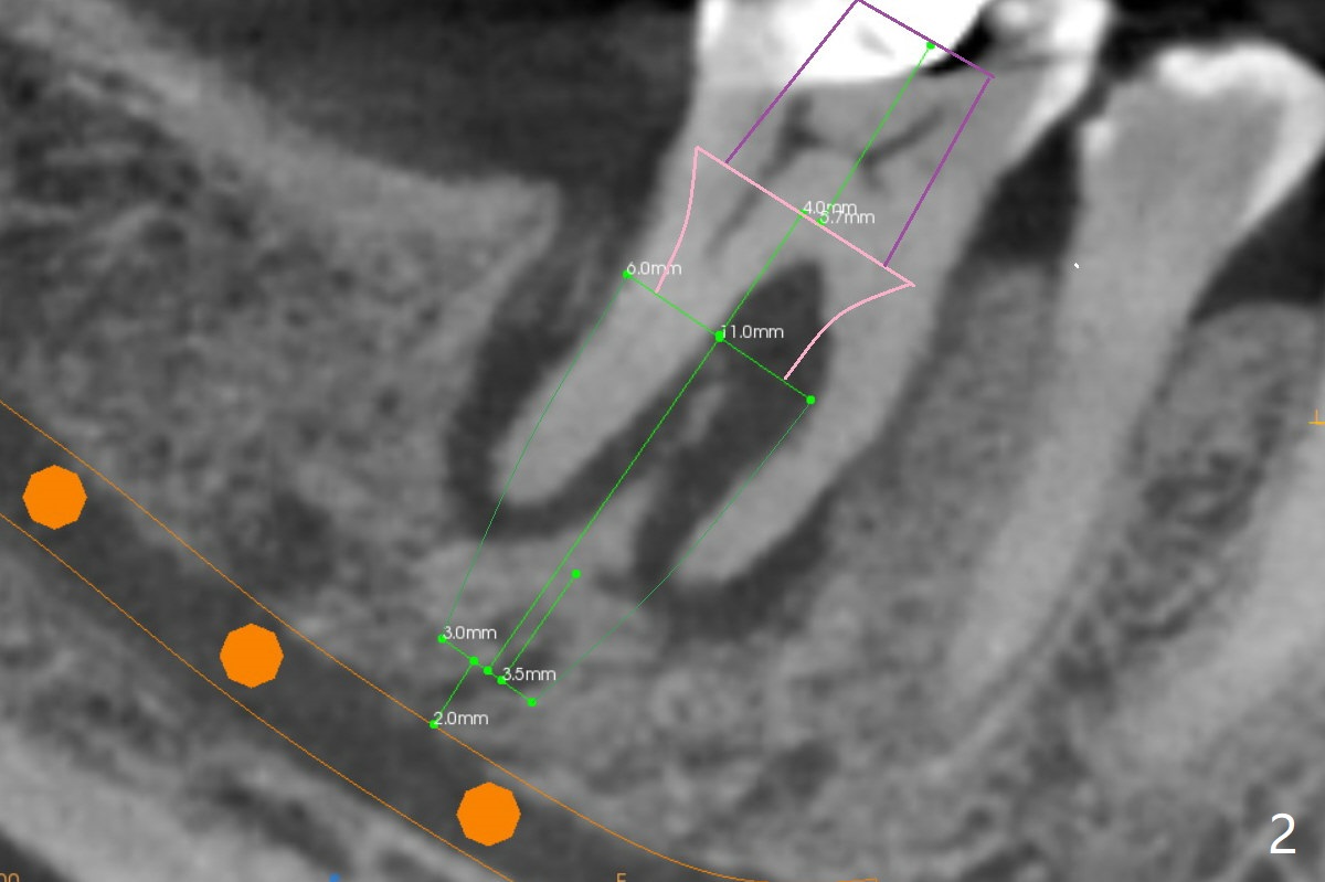 A 71-year-old woman (bruxer) wants to remove the tooth #30 (occlusal trauma, possible root fracture) for implant following the one at #14 (Fig.1). IBS abutment screw tends to loosen in functioning if the implant is placed too deep and/or off the longitudinal axis. If these two conditions are not controlled well, switch to a large tissue-level implant. A drawback of placing the implant in the septum is that the mesial margin of the abutment (Fig.2 pink) is subcrestal. If the implant is placed in the mesial socket (Fig.5 red line), the imagined abutment margin plane (white line) is parallel to the mesiodistal crests. Initial osteotomy entry point in the mesial socket and trajectory should be adjusted intraop (compare Fig.6 and 7) so that the apex of the implant will not be too close to the apex of the tooth #29 (to avoid truncating the neurovascular supply to the tooth (Fig.6 red arrowheads)) at the same time the abutment inclination is not too compromised (Fig.7). To prevent pressure upon the buccal (Fig.4 B) plate, osteotomy should be slightly lingual and/or the diameter of the implant is to be < 7 mm. Use a 3 mm unipost for provisional and probably 5 mm one for definitive restoration. Apply bonding to the post if the implant is 6 mm or less. The provisional margin should be wide and deep for deep margin and easy impression later. Use IS drills with 4 mm stopper for osteotomy if the septum is absent. Prepare Rongeur and surgical handpiece to remove the remaining septum if needed. Be wary of the distally curved root tip of #29. In fact there is a mesiodistal crack line (Fig.8 arrowheads) with buccal recession (Fig.9, 2 weeks preop).