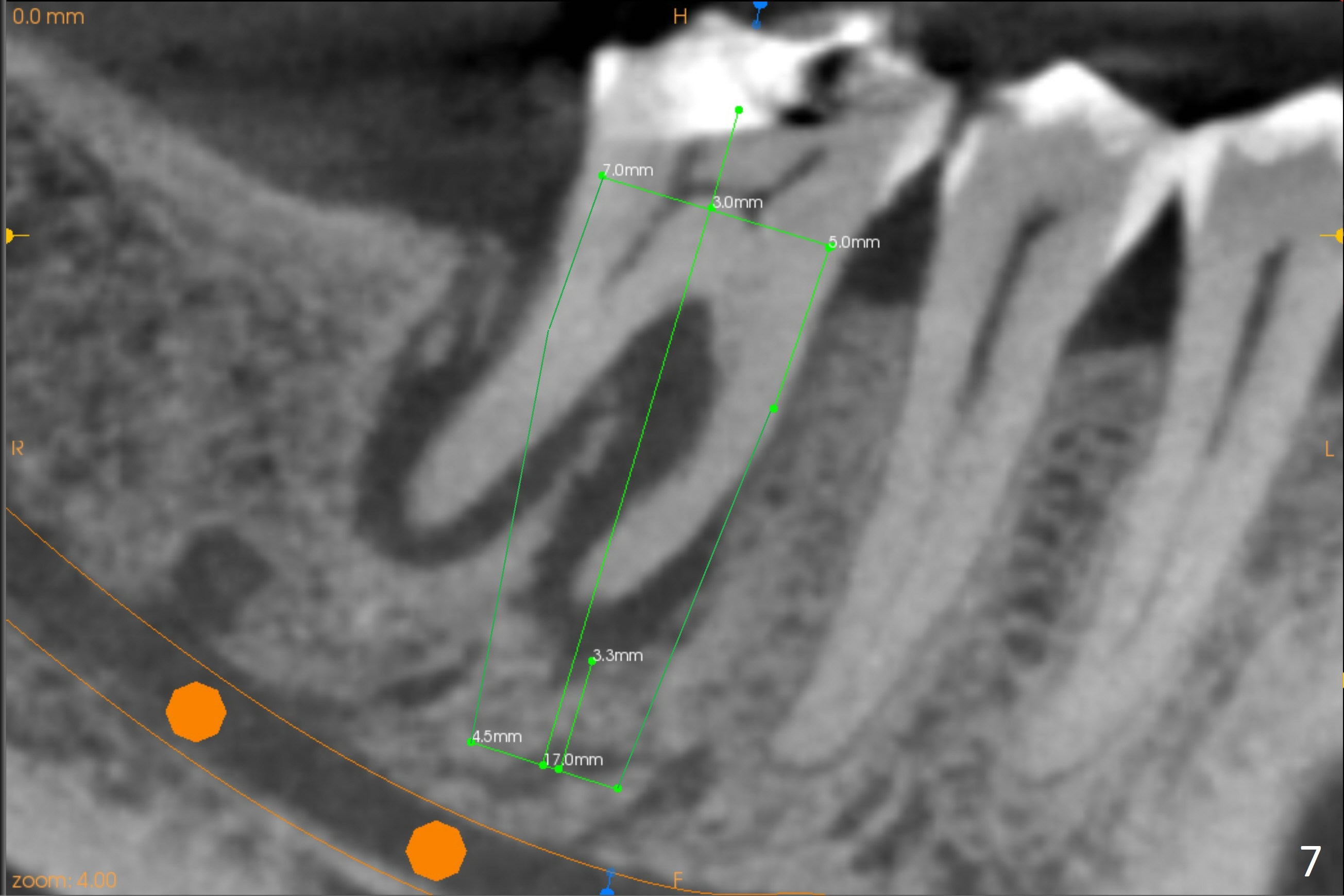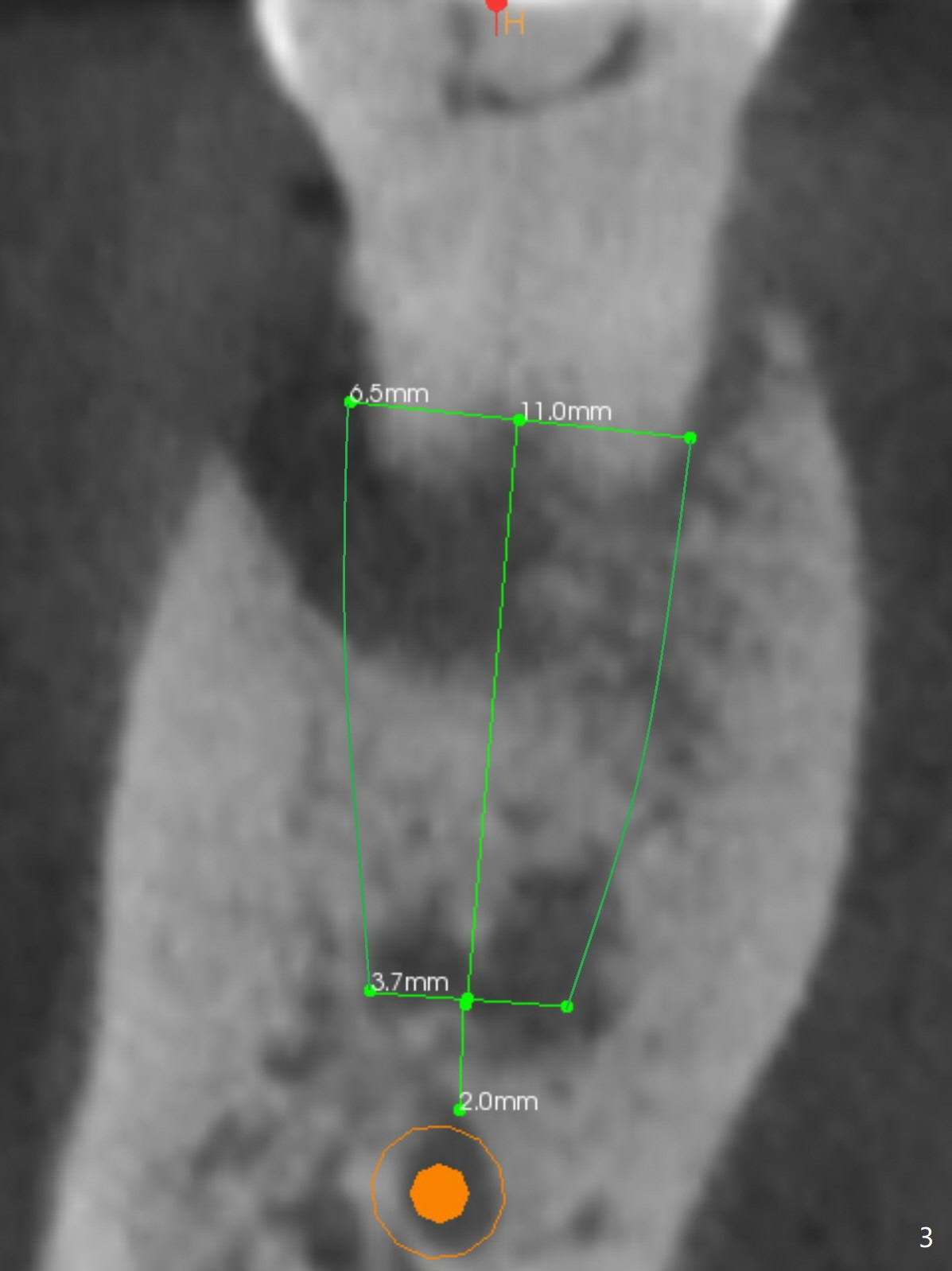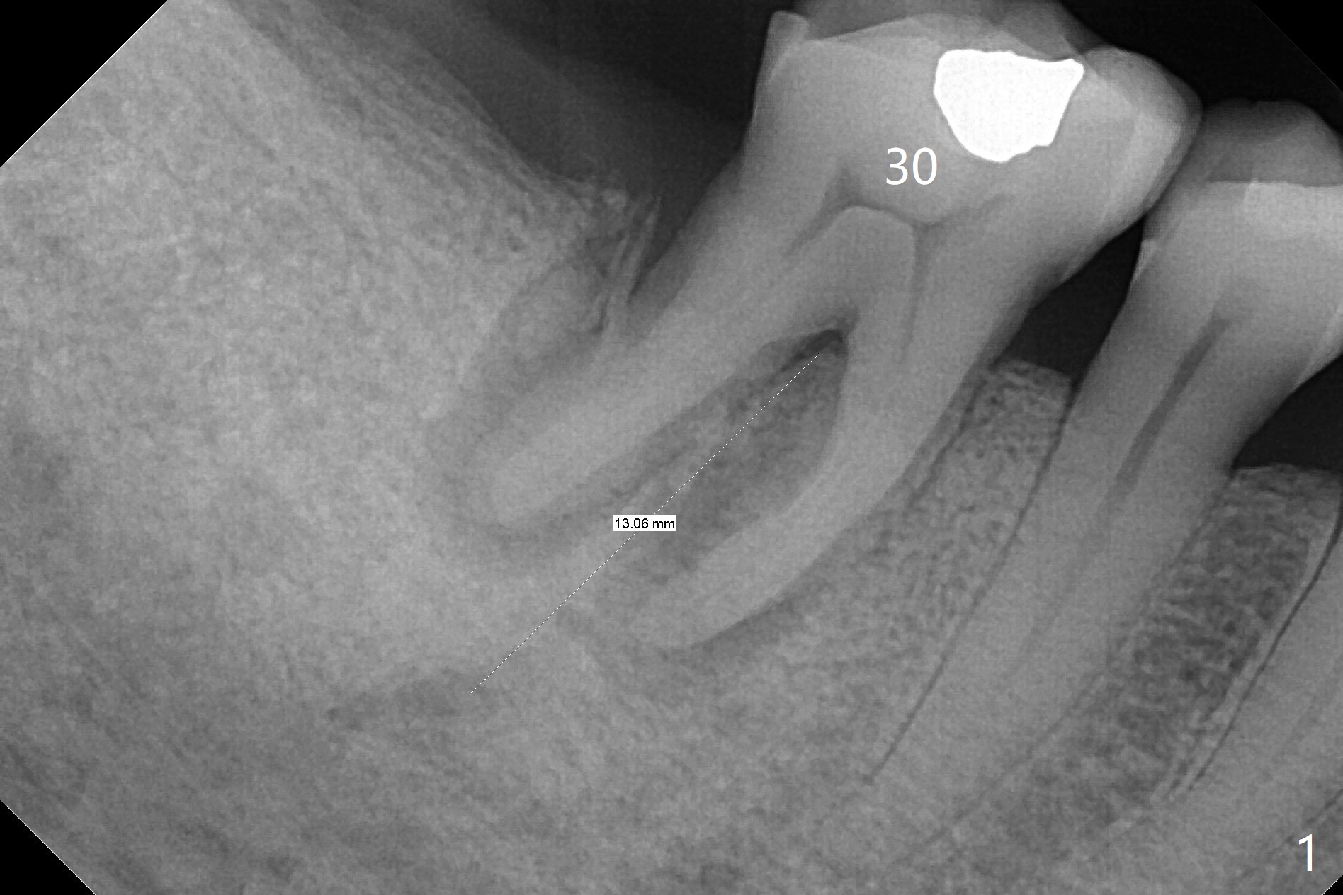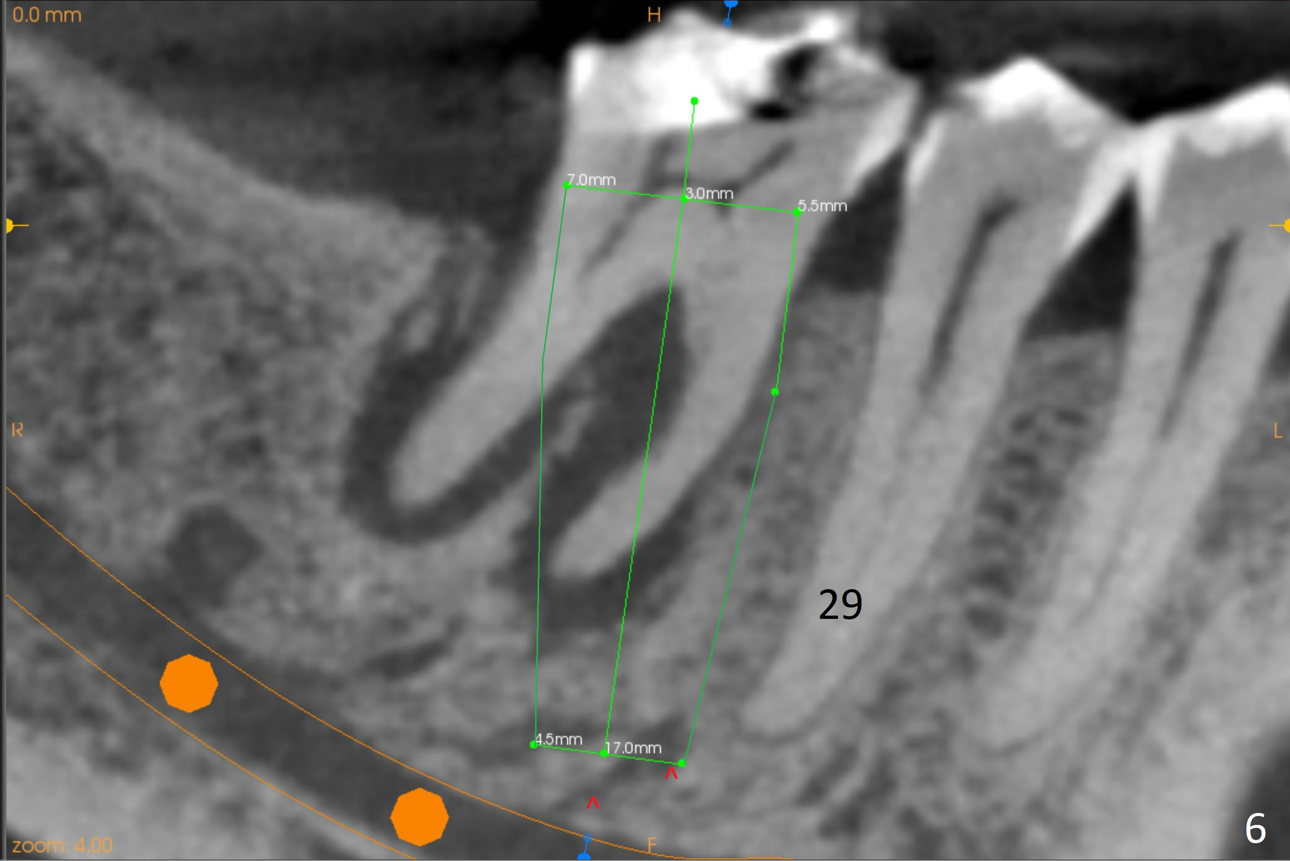 A 71-year-old woman (bruxer) wants to remove the tooth #30 (occlusal trauma, possible root fracture) for implant following the one at #14 (Fig.1). IBS abutment screw tends to loosen in functioning if the implant is placed too deep and/or off the longitudinal axis. If these two conditions are not controlled well, switch to a large tissue-level implant. A drawback of placing the implant in the septum is that the mesial margin of the abutment (Fig.2 pink) is subcrestal. If the implant is placed in the mesial socket (Fig.5 red line), the imagined abutment margin plane (white line) is parallel to the mesiodistal crests. Initial osteotomy entry point in the mesial socket and trajectory should be adjusted intraop (compare Fig.6 and 7) so that the apex of the implant will not be too close to the apex of the tooth #29 (to avoid truncating the neurovascular supply to the tooth (Fig.6 red arrowheads)) at the same time the abutment inclination is not too compromised (Fig.7). To prevent pressure upon the buccal (Fig.4 B) plate, osteotomy should be slightly lingual and/or the diameter of the implant is to be < 7 mm. Use a 3 mm unipost for provisional and probably 5 mm one for definitive restoration. Apply bonding to the post if the implant is 6 mm or less. The provisional margin should be wide and deep for deep margin and easy impression later. Use IS drills with 4 mm stopper for osteotomy if the septum is absent. Prepare Rongeur and surgical handpiece to remove the remaining septum if needed. Be wary of the distally curved root tip of #29. In fact there is a mesiodistal crack line (Fig.8 arrowheads) with buccal recession (Fig.9, 2 weeks preop).
