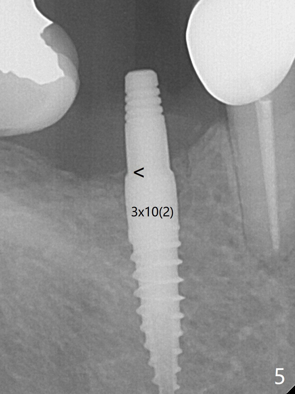 Clinically a few threads are exposed buccally. When a definitive implant with the same dimension is inserted with 45 Ncm, it looks seated too deep (Fig.4,5). The latter is noted after suturing. The implant is backed up for a few turns so that the length of the abutment appears a little more reasonable. Introspectively, a 4 mm cuff should have been used after ridge reduction. Although there is no bone loss 4 months postop (Fig.6), the abutment margin (Fig.7 arrow) is subgingival (red dashed line: gingival margin). Diode laser is used for gingivectomy prior to impression. The bone density around the implant increases 11 months post cementation (Fig.8 *), probably related to recurrent #18 infection. The patient uses floss after meal to remove food impaction. Narrow Ridge Last Next Xin Wei, DDS, PhD, MS 1st edition 11/09/2017, last revision 03/16/2019
