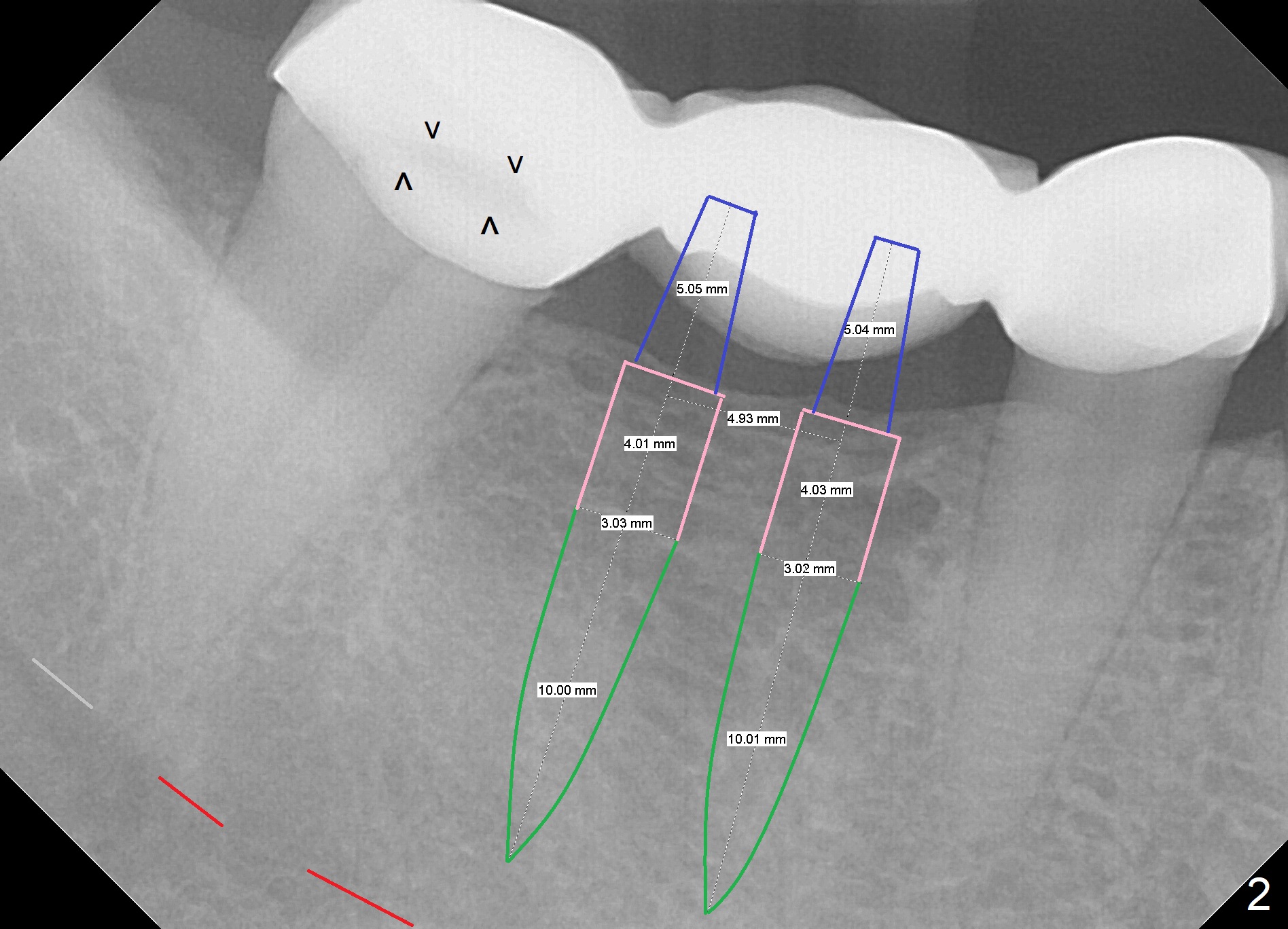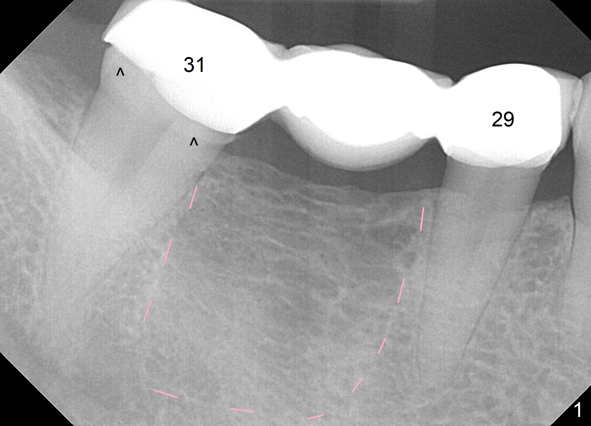 A 38-year-old woman has a loose FPD in the lower right quadrant (Fig.1). The retainer at #31 appears to have open margin (Fig.1 ^) or the abutment has caries (Fig.2 arrowheads). The FPD will be sectioned between #29 and 30. The abutment at #31 needs at least a crown, while an implant will be placed at #30. The bone density at the site is low (Fig.1 pink dashed line). The latter may be due to narrow bone buccolingually. If the ridge atrophy is moderate (e.g. 4 mm (implant positioners)), bone expansion will be executed (Bone Expander Kit or IBS Kit) and a 3.8, 4.1 or 4.5 mm implant will be placed. If the atrophy is severe, the ridge top will be reduced until the ridge is ~ 4 mm, two of 2.5 or 3.0 mm 1-piece implants will be placed (Fig.2). A splinted provisional will be fabricated at #30 and 31.