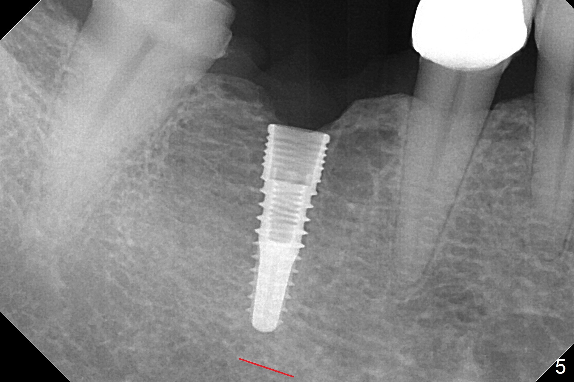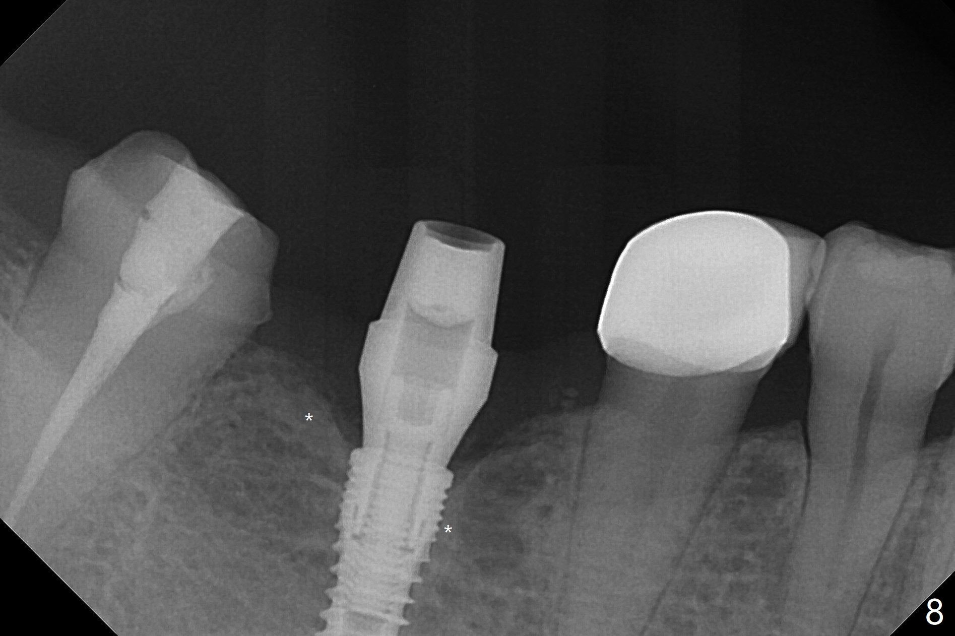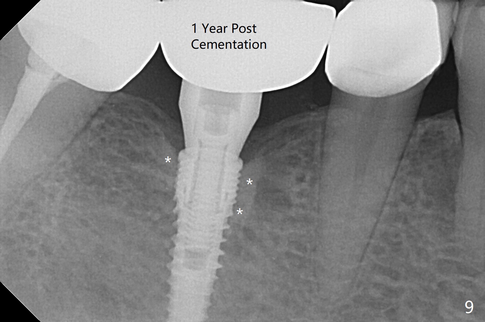 The apparently narrow ridge at #30 before bridge sectioning (Fig.1) is confirmed with incision (Fig.2). Following ridge reduction, osteotomy is initiated with 2 mm pilot drill (Fig.3). When a 3.8x12 mm SM narrow implant is placed with 40 Ncm, there is 1-2 mm cortical bone buccolingually (Fig.4,5). The thick cortices do not seem to be easy to be bent, i.e., expanded. RCT is finished at #31 one month post implant placement (Fig.6,7), the flattened ridge appears to have started to undergo remodeling. Ridge reduction makes it possible for the implant to remain subcrestal postop (Fig.4). The bone surrounding the implant may reduce the likelihood of implant fracture. The crowns at #30 and 31will be fabricated together with light occlusion at #30. In fact the splinted provisional dislodges. There appears dense bone formation 3 months postop (Fig.8 *). The drawback of using a SM narrow implant is that a narrow abutment has to be used (4.8x4(4.5) mm). The implant crown is dislodged immediately after the patient finishes lunch. Following recementation, the occlusion is reduced. In fact, UF or IBS has no such drawback: the implant could be small, but the abutment could be large. One year post cementation, the crown at #31 needs recementation (Fig.9); the bone density next to the coronal implant increases (*).