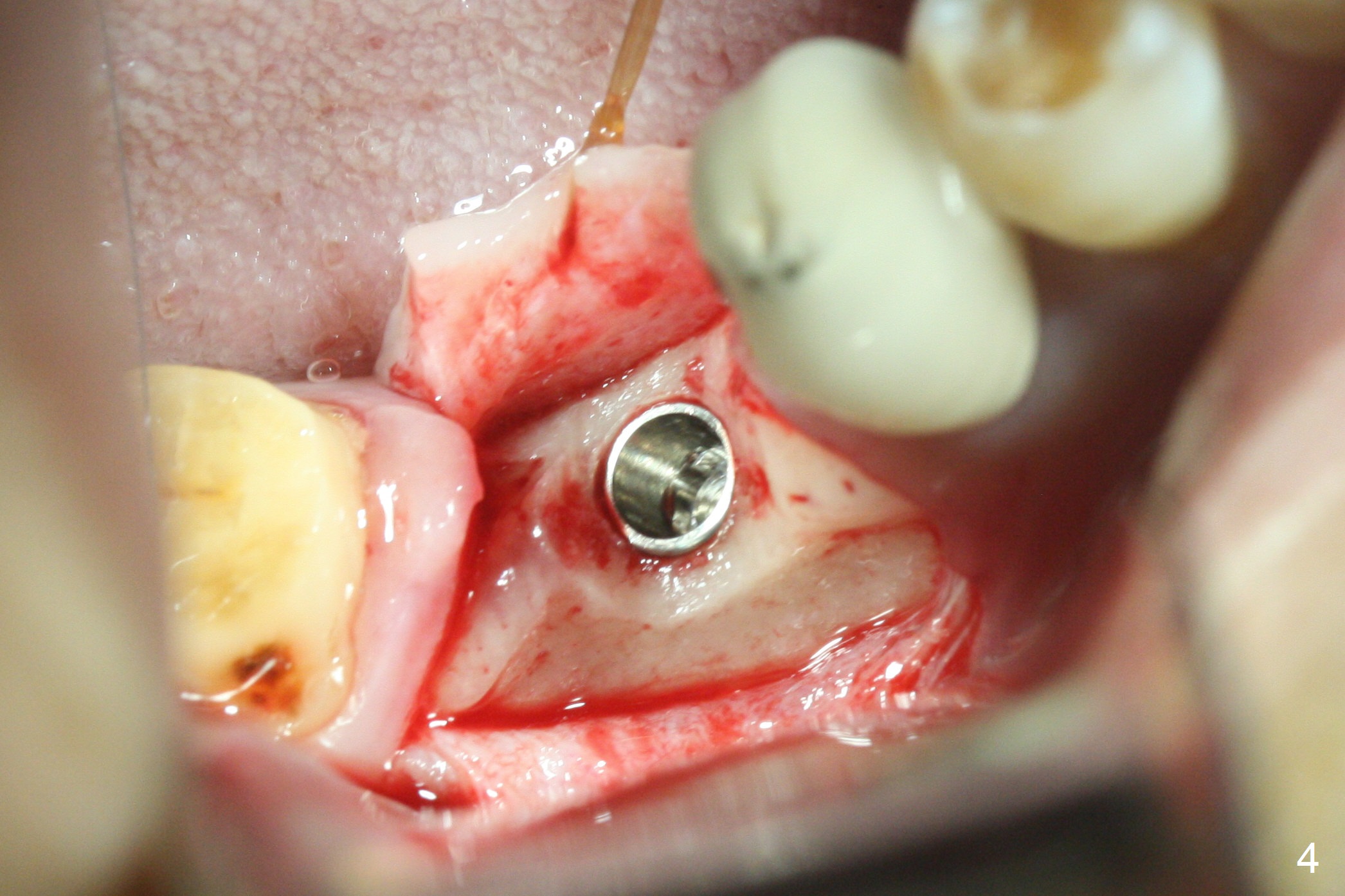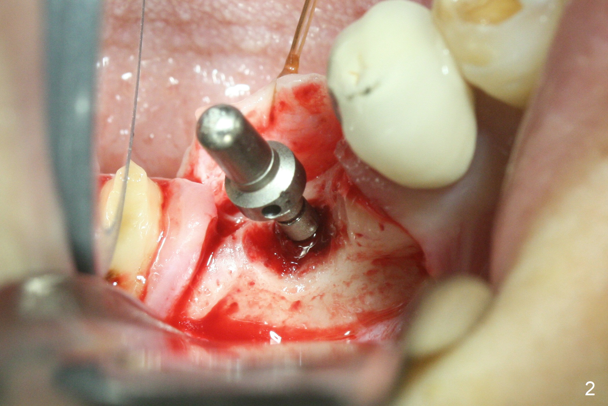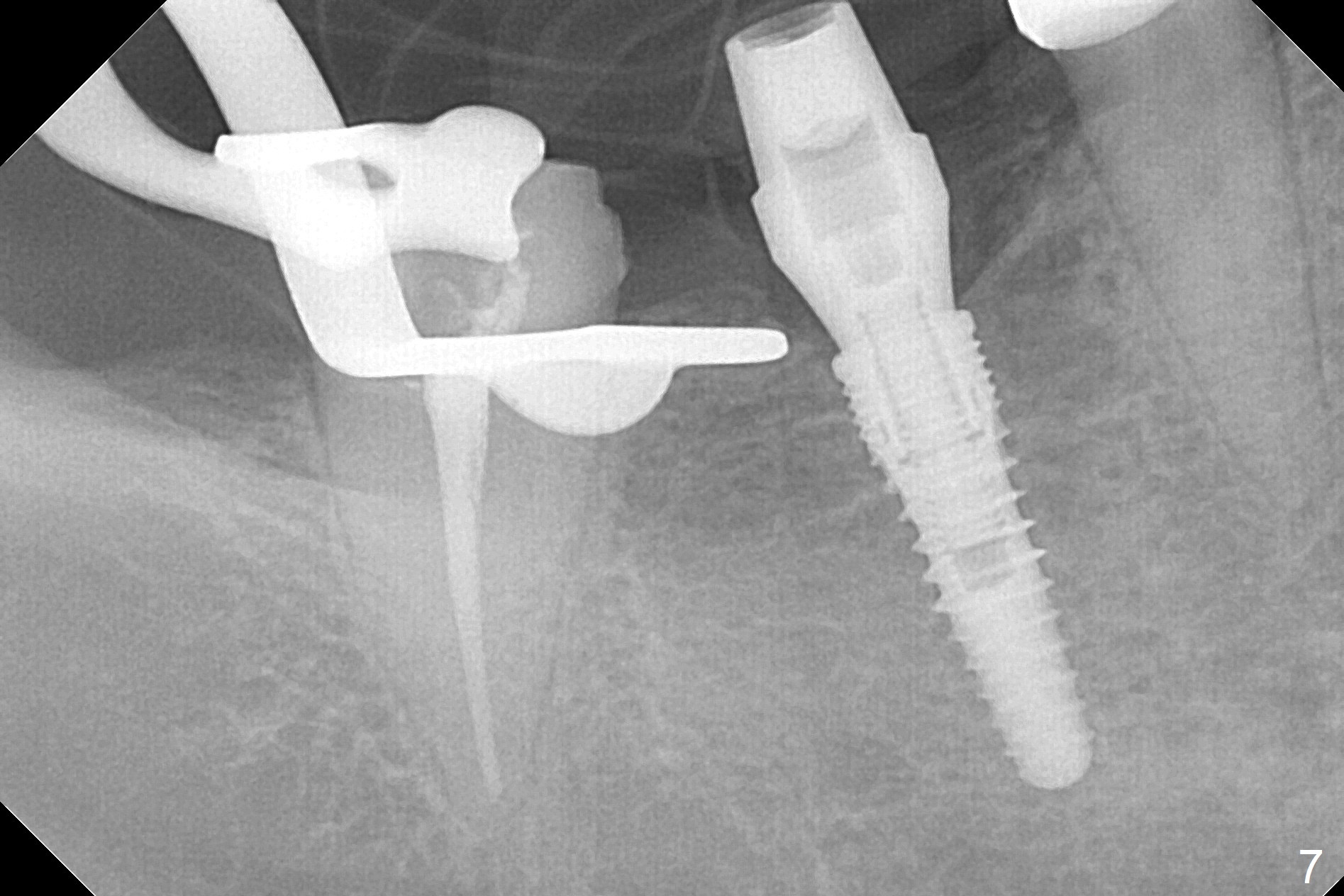 The apparently narrow ridge at #30 before bridge sectioning (Fig.1) is confirmed with incision (Fig.2). Following ridge reduction, osteotomy is initiated with 2 mm pilot drill (Fig.3). When a 3.8x12 mm SM narrow implant is placed with 40 Ncm, there is 1-2 mm cortical bone buccolingually (Fig.4,5). The thick cortices do not seem to be easy to be bent, i.e., expanded. RCT is finished at #31 one month post implant placement (Fig.6,7), the flattened ridge appears to have started to undergo remodeling. Ridge reduction makes it possible for the implant to remain subcrestal postop (Fig.4). The bone surrounding the implant may reduce the likelihood of implant fracture. The crowns at #30 and 31will be fabricated together with light occlusion at #30. In fact the splinted provisional dislodges. There appears dense bone formation 3 months postop (Fig.8 *). The drawback of using a SM narrow implant is that a narrow abutment has to be used (4.8x4(4.5) mm). The implant crown is dislodged immediately after the patient finishes lunch. Following recementation, the occlusion is reduced. In fact, UF or IBS has no such drawback: the implant could be small, but the abutment could be large. One year post cementation, the crown at #31 needs recementation (Fig.9); the bone density next to the coronal implant increases (*).