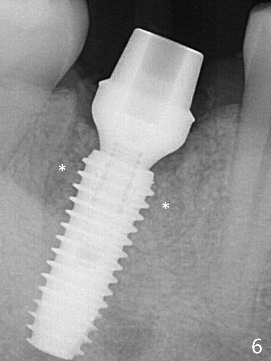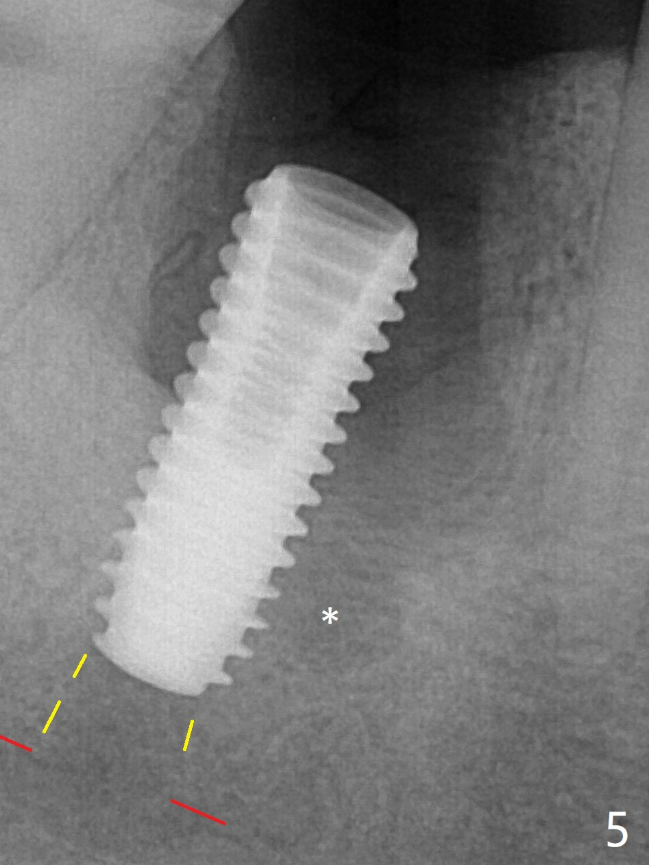 A 5x13 mm implant is placed superficially (Fig.5) with a trace of the previous osteotomy (yellow line) and deep space created by the mesial osteotomy (*). Red dashed line: the superior border of the Inferior Alveolar Canal. Apparently the pathological and iatrogenic defects are filled with allograft (Fig.6 *).