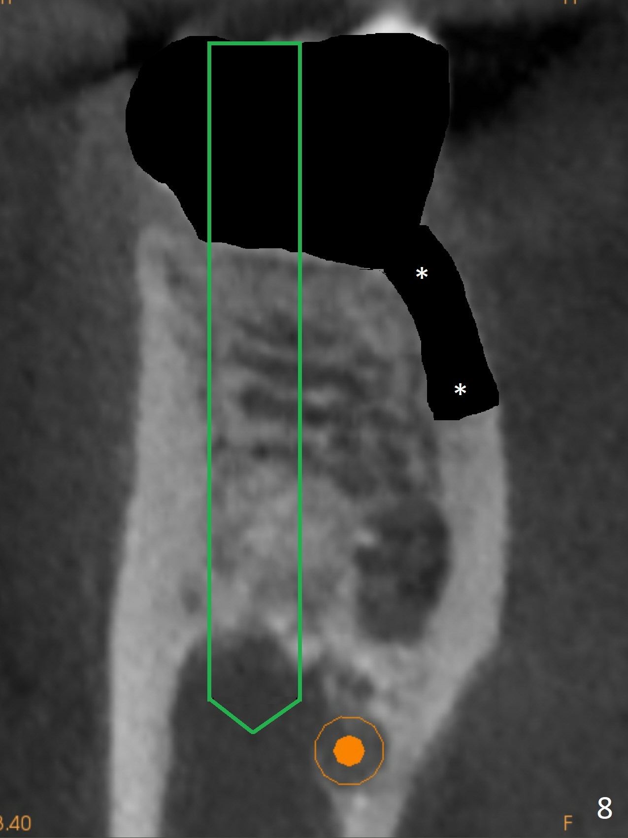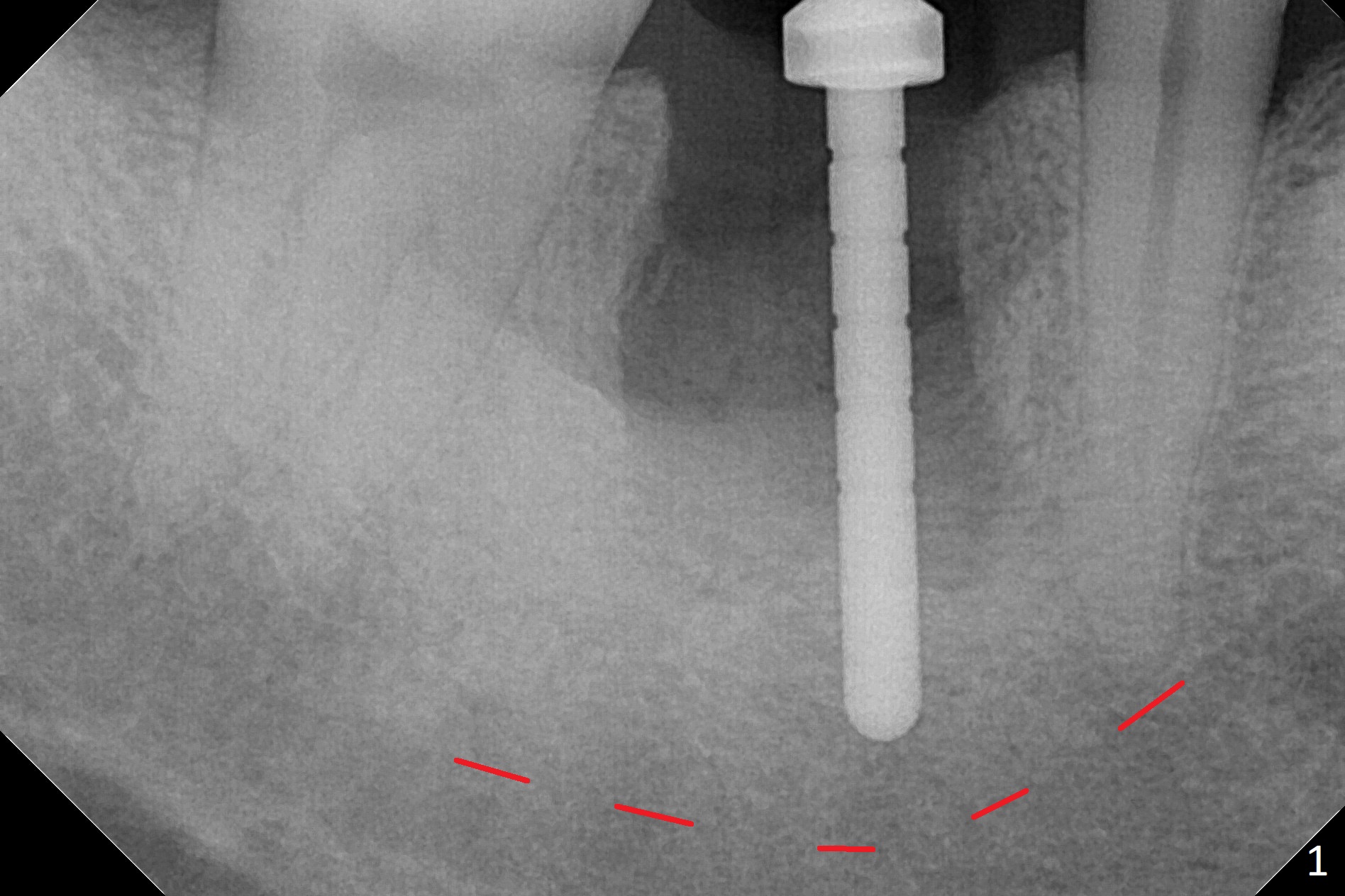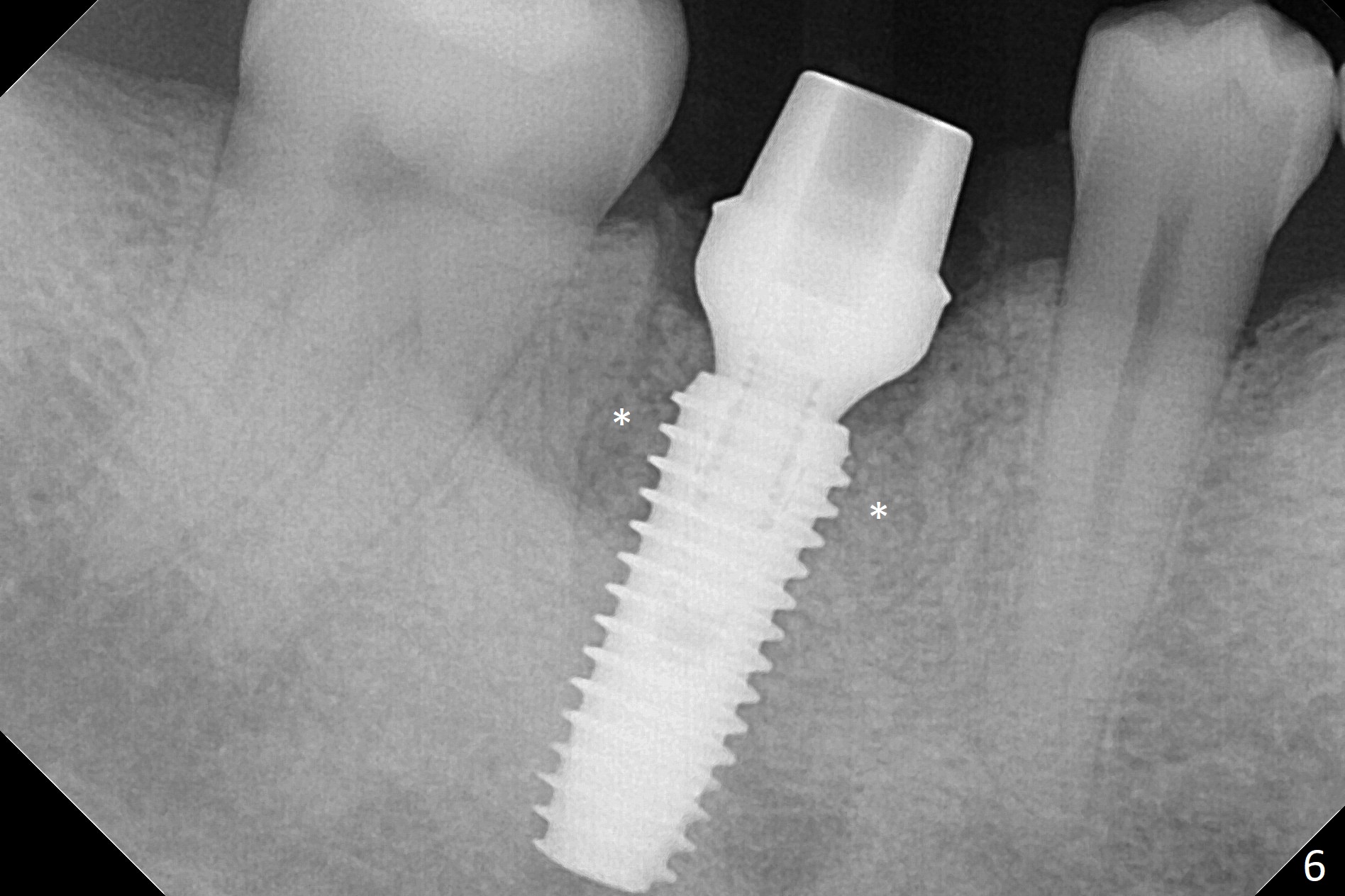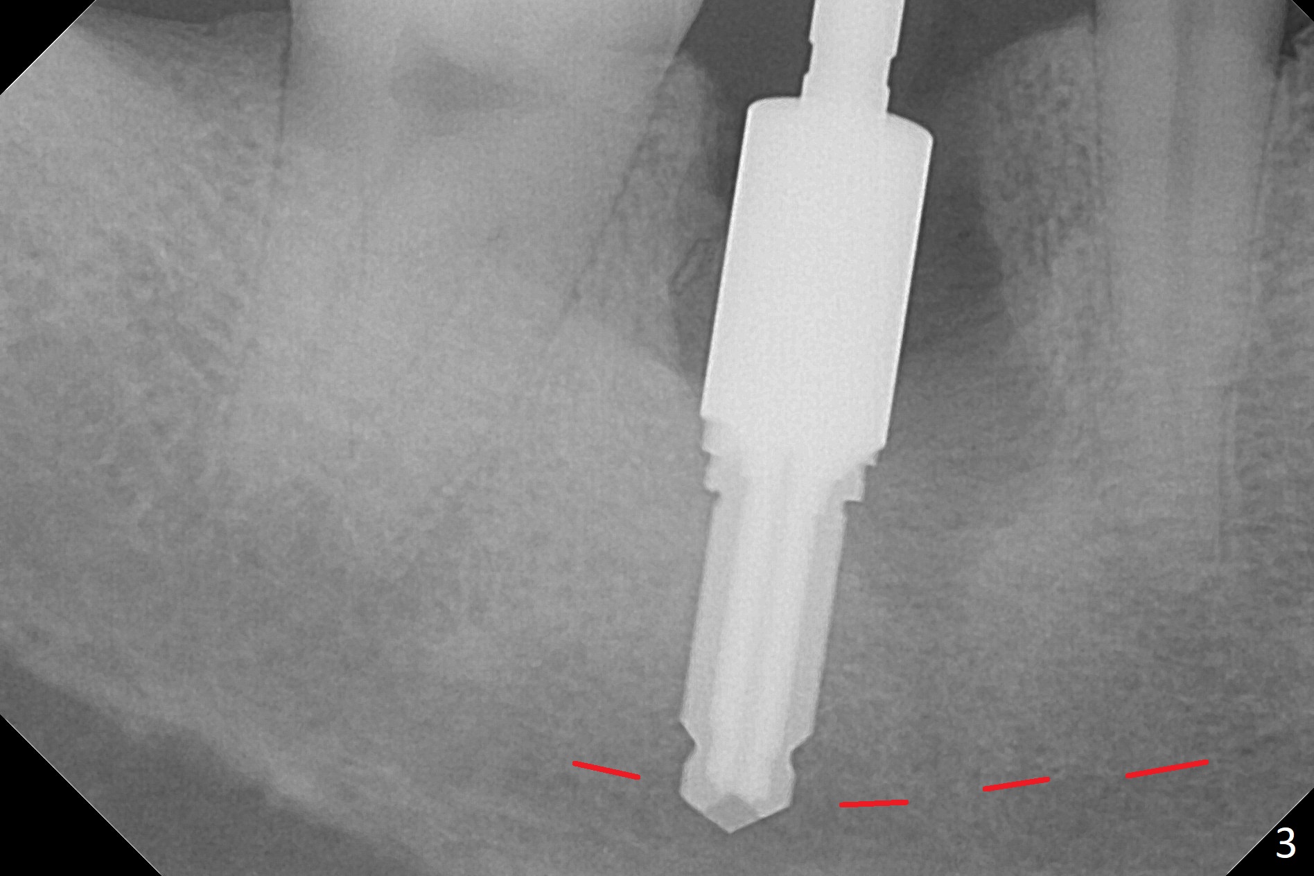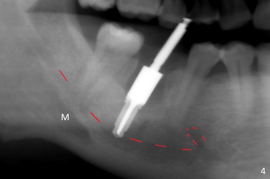 After the tooth #30 is extracted, the socket is 18 mm deep and the lingual plate is 4 mm tall. With hemorrhage, visibility of the socket, especially the bottom, is poor. The septum is almost completely defective. Following removal of the most buccal portion of the septum, osteotomy is initiated as buccal as possible, but it is mesial (Fig.1). In spite of effort to move the osteotomy distal, the osteotomy remains mesial and superficial (Fig.2 with 5 mm tap drill). Pain control is poor with infiltration. It appears that the smaller osteotomy (Fig.2 yellow line) may have extended close to the superior border of the Inferior Alveolar Canal (red line). It appears that there is 8.5 mm bone distal with ~ 2 mm clearance. After mandibular block, a new osteotomy is made distal; when a 3.8 mm drill is being used, there is hemorrhage from the osteotomy with apparent violation of the Canal integrity (Fig.3,4). But hemostasis is achieved with gauze pressure. A 5x13 mm implant is placed superficially (Fig.5) with a trace of the previous osteotomy (yellow line) and deep space created by the mesial osteotomy (*). Apparently the pathological and iatrogenic defects are filled with allograft (Fig.6 *). Guided surgery could have avoided the mesial osteotomy.