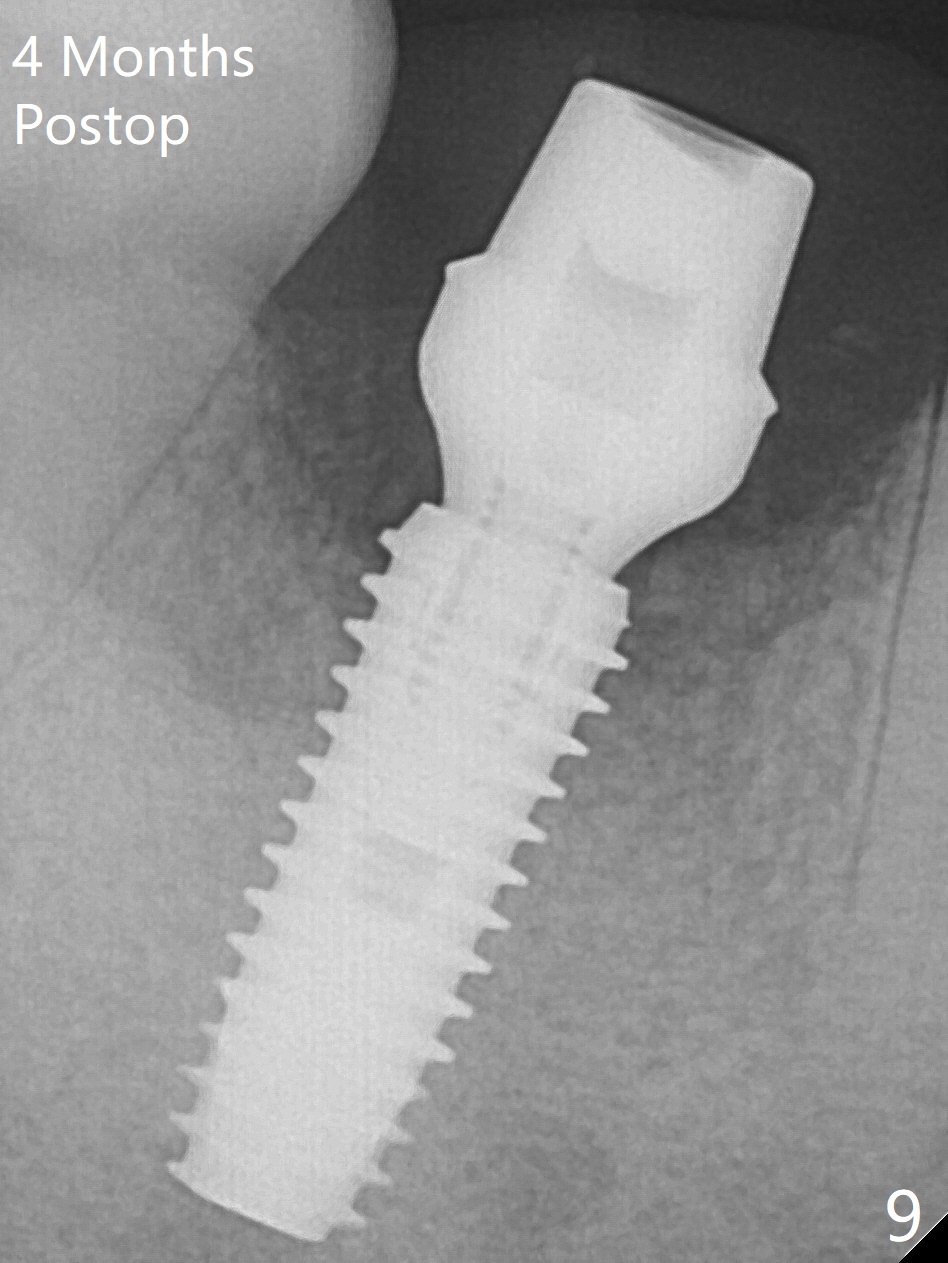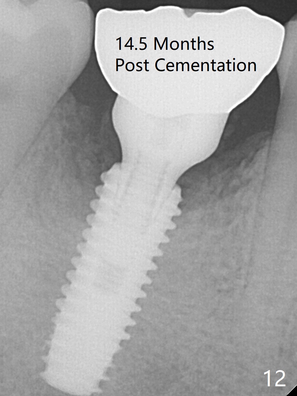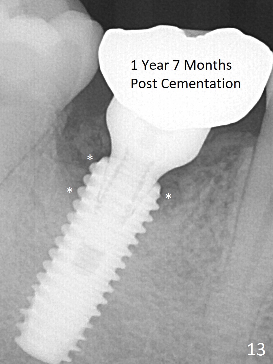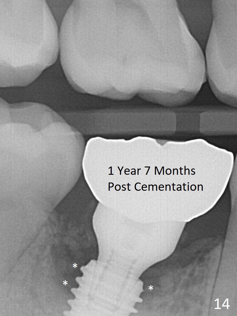 Fortunately no paresthesia is reported postop. Why is the Inferior Alveolar Canal not violated? Fig.7 is a coronal section of CBCT taken for a 40-year-old man at the lower 1st molar (at the septum). At the region, the Canal (brown circle) is close to the lingual plate (L). Because of severe bone loss of the lingual plate of this case (Fig.8 *), osteotomy is intentionally created buccal (green). The deep osteotomy may not contact the Canal, while the hemorrhage may stem from the medullary space (M in Fig.4,7). Bone morphology at the coronal end of the implant apparently changes 4 months postop, suggesting osteointegration (Fig.9). Impression is taken. Bone density around the implant at the crest seems to increase (Fig.10), while there is no soft tissue deficiency 10 months post cementation (Fig.11). The bone appears to regenerate toward the abutment, particularly distally, 14.5 months post cementation (Fig.12). Periimplantitis develops (bleeding on water pik and erythematous and tender buccal gingiva) 1 year 7 months post cementation (Fig.13,14). The 1st three threads are exposed (*). Bone graft with PRF and 6-month membrane or Cytoplast will be needed. Pain disappears 3 days of oral antibiotic. The gingiva looks healthy 1 month later when he returns for bone graft (Fig.15). But the lingual gingival cuff is not so healthy when the crown/abutment is removed (Fig.16 <). Bone graft is not done. For those patients with suboptimal oral hygiene, implants should be placed as low as possible, better with guide for precision.