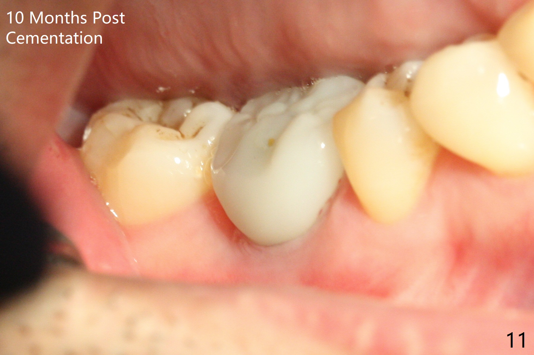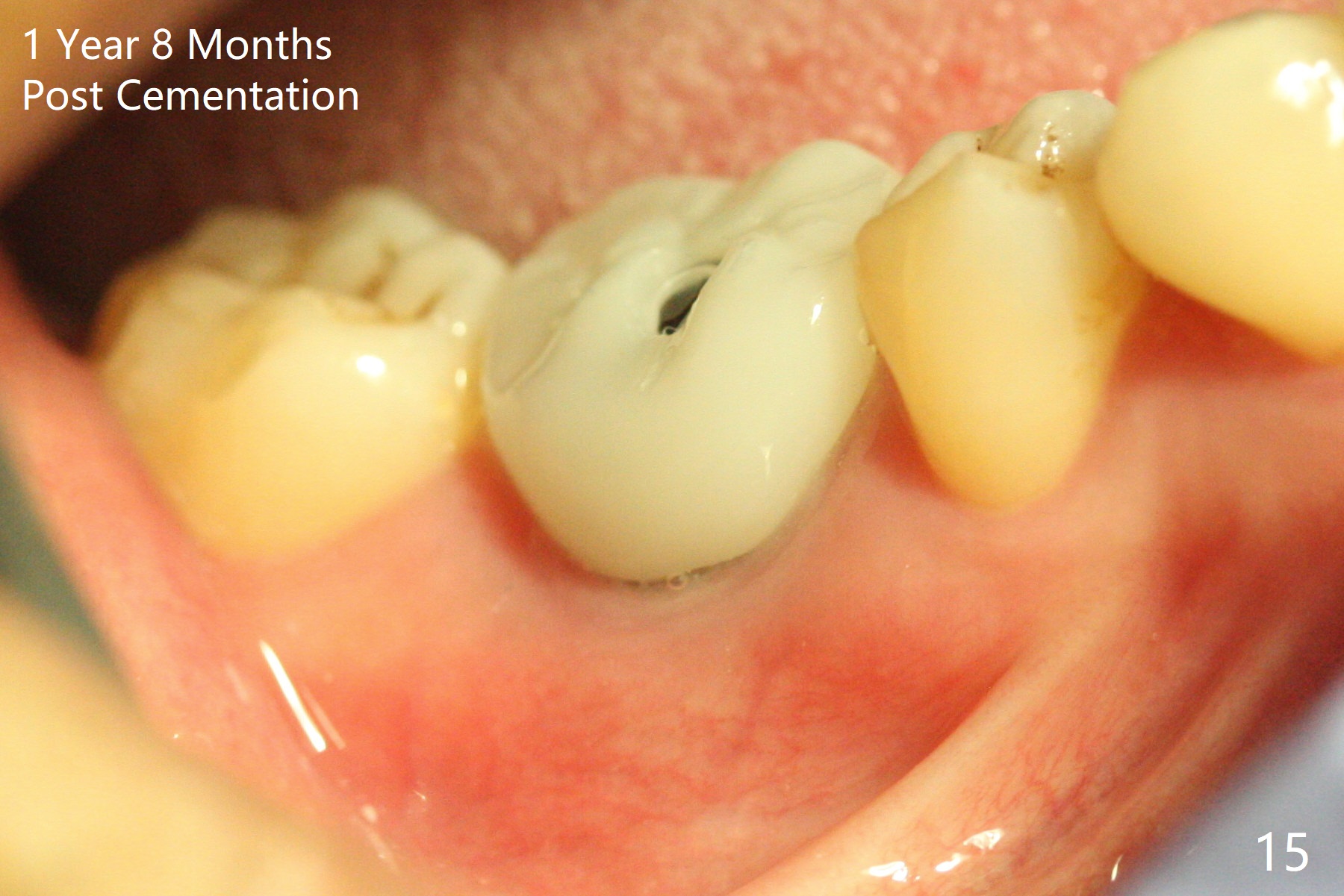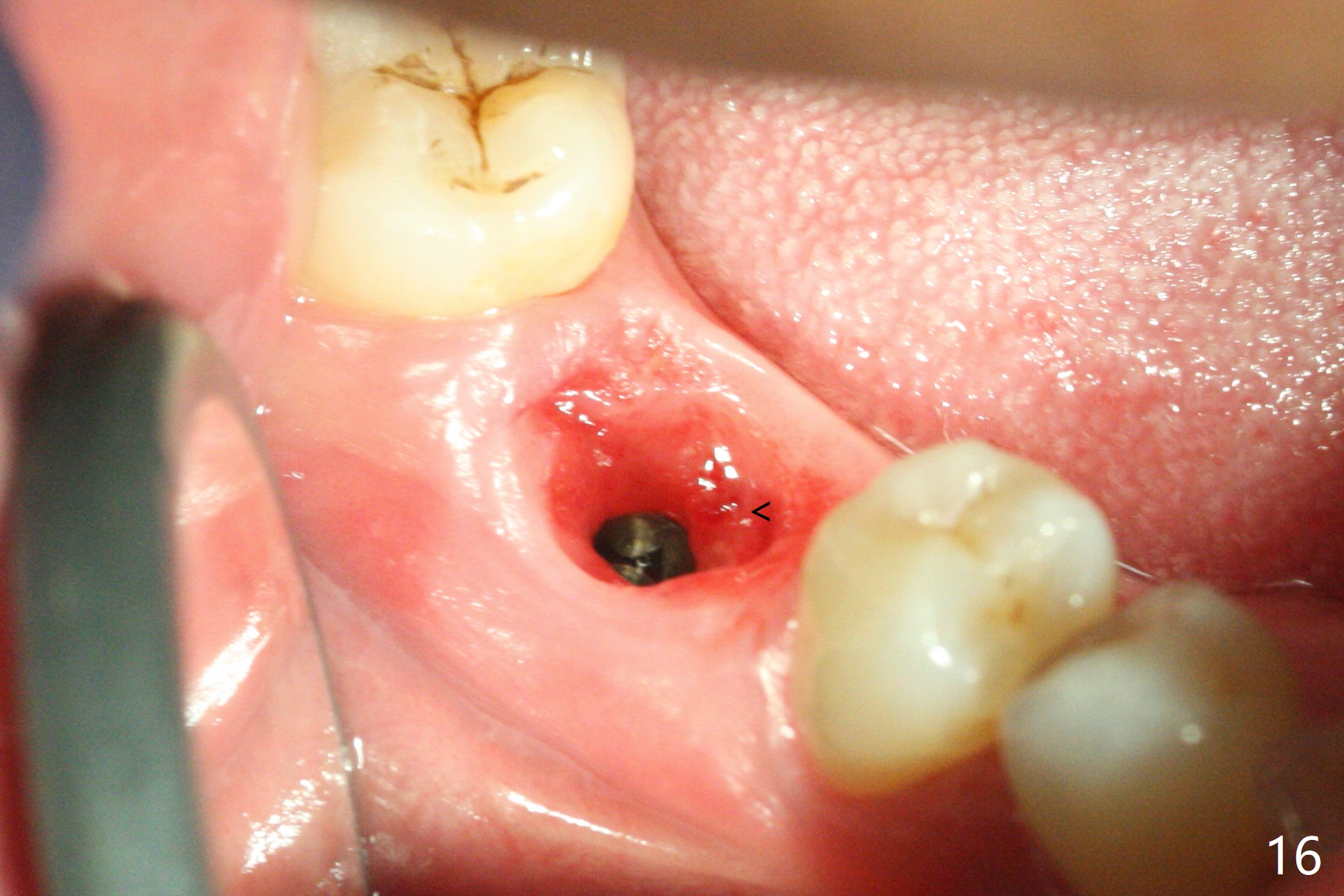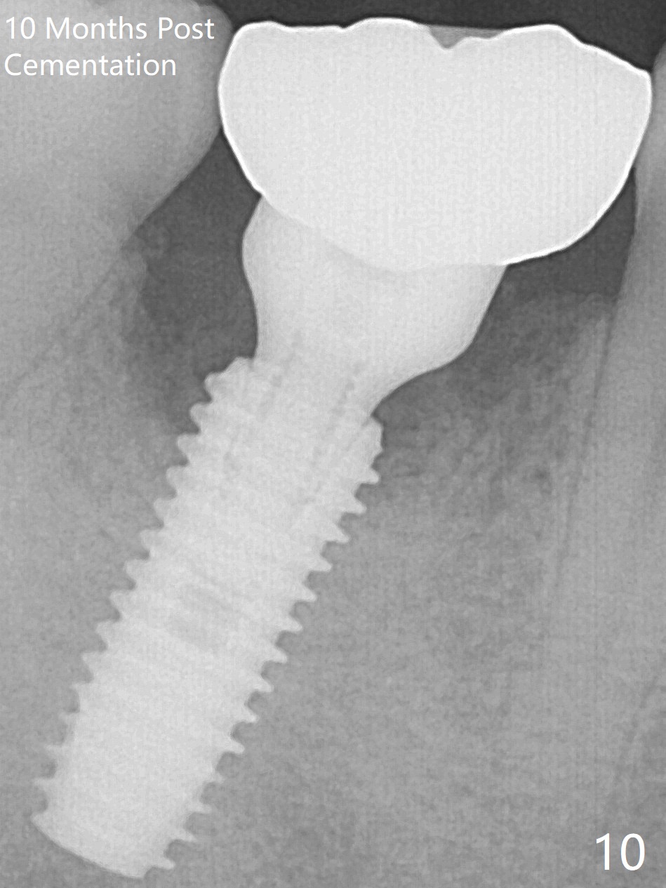 Fortunately no paresthesia is reported postop. Why is the Inferior Alveolar Canal not violated? Fig.7 is a coronal section of CBCT taken for a 40-year-old man at the lower 1st molar (at the septum). At the region, the Canal (brown circle) is close to the lingual plate (L). Because of severe bone loss of the lingual plate of this case (Fig.8 *), osteotomy is intentionally created buccal (green). The deep osteotomy may not contact the Canal, while the hemorrhage may stem from the medullary space (M in Fig.4,7). Bone morphology at the coronal end of the implant apparently changes 4 months postop, suggesting osteointegration (Fig.9). Impression is taken. Bone density around the implant at the crest seems to increase (Fig.10), while there is no soft tissue deficiency 10 months post cementation (Fig.11). The bone appears to regenerate toward the abutment, particularly distally, 14.5 months post cementation (Fig.12). Periimplantitis develops (bleeding on water pik and erythematous and tender buccal gingiva) 1 year 7 months post cementation (Fig.13,14). The 1st three threads are exposed (*). Bone graft with PRF and 6-month membrane or Cytoplast will be needed. Pain disappears 3 days of oral antibiotic. The gingiva looks healthy 1 month later when he returns for bone graft (Fig.15). But the lingual gingival cuff is not so healthy when the crown/abutment is removed (Fig.16 <). Bone graft is not done. For those patients with suboptimal oral hygiene, implants should be placed as low as possible, better with guide for precision.