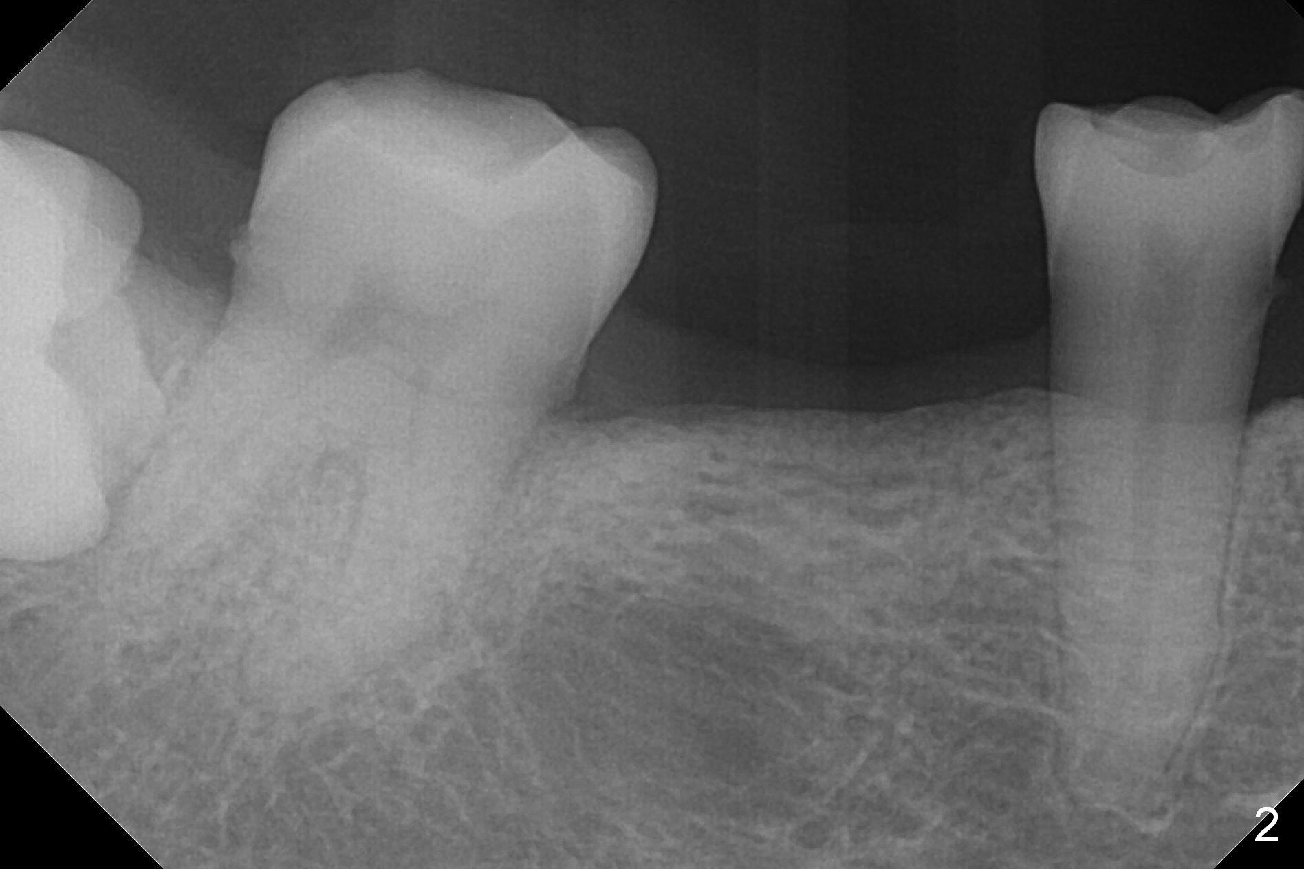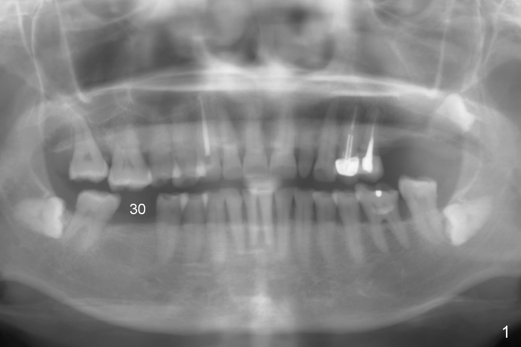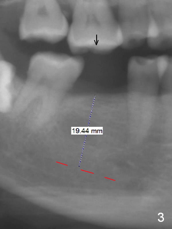 A 57-year-old woman has 3 missing molars, including #30 (Fig.1). Although she looks skinny, clinically the ridge is moderately wide. Magic Split will be used for access (flapless) and bone density testing. From PA, the bone density does not seem to be low (Fig.2). Use the 1.6 mm drill without stopper for further bone density testing. The initial depth will be 15 mm (gingival level, Fig.3). After PA confirmation of the trajectory, use 3.8 mm Magic Drill for 15 mm. Try 4.5x11 mm dummy implant, followed by PA. When an abutment is placed, trim the opposing surpraerupted tooth if necessary (Fig.3 arrow).