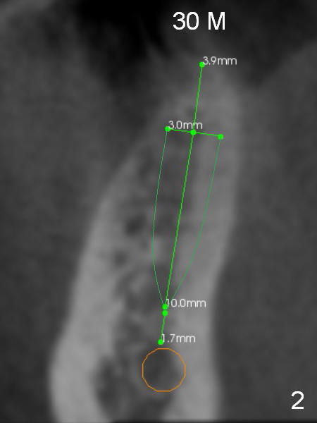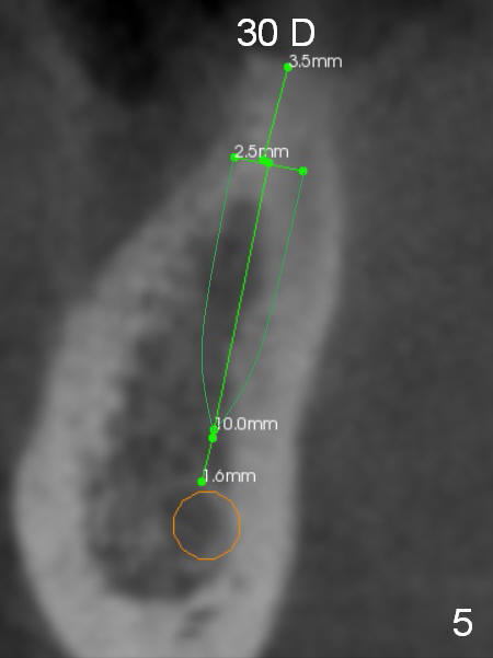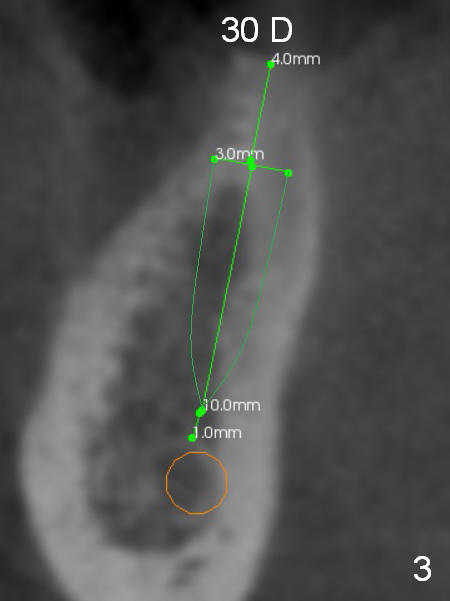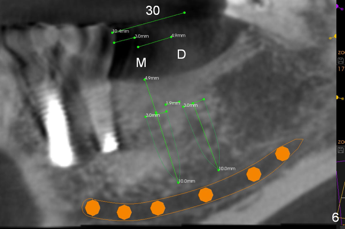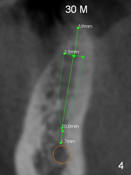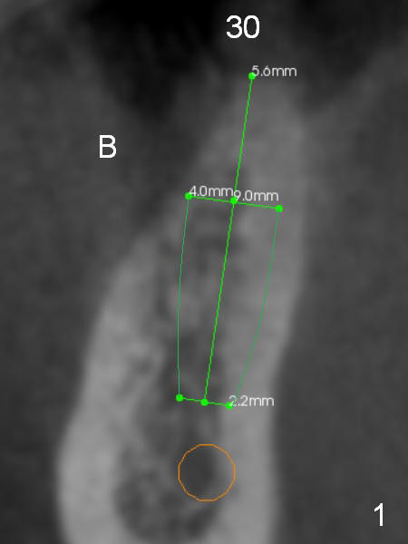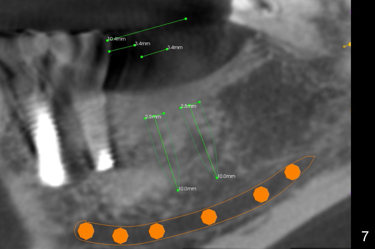 Narrow Ridge at Lower 1st Molar A 56-year-old woman will return for #30 implant placement. The ridge is narrow and pointed at the top. If a 4 mm implant is placed, the ridge has to be reduced for 5.5 mm and the implant will be as short as 9 mm (Fig.1). When 2 of 3 mm 1-piece implants are used, they can be placed higher (Fig.2,3,6). It may be less likely to perforate the buccal plate if 2.5 mm 1-piece implants are placed (Fig.4,5,7). Return to Lower Molar Immediate Implant, IBS Xin Wei, DDS, PhD, MS 1st edition 03/19/2017, last revision 04/03/2018 |