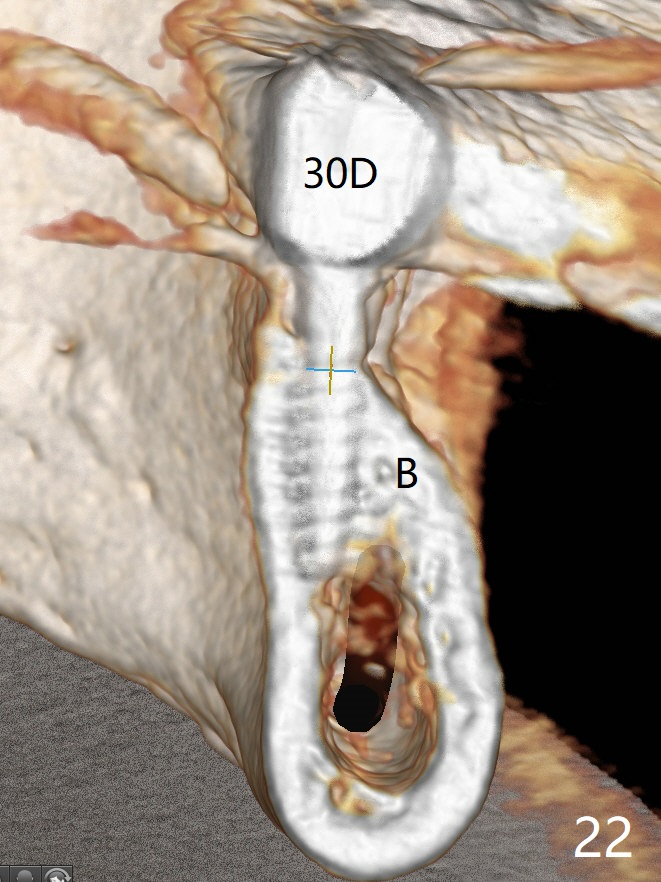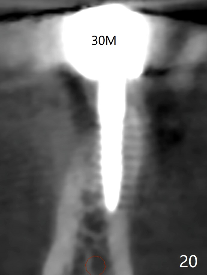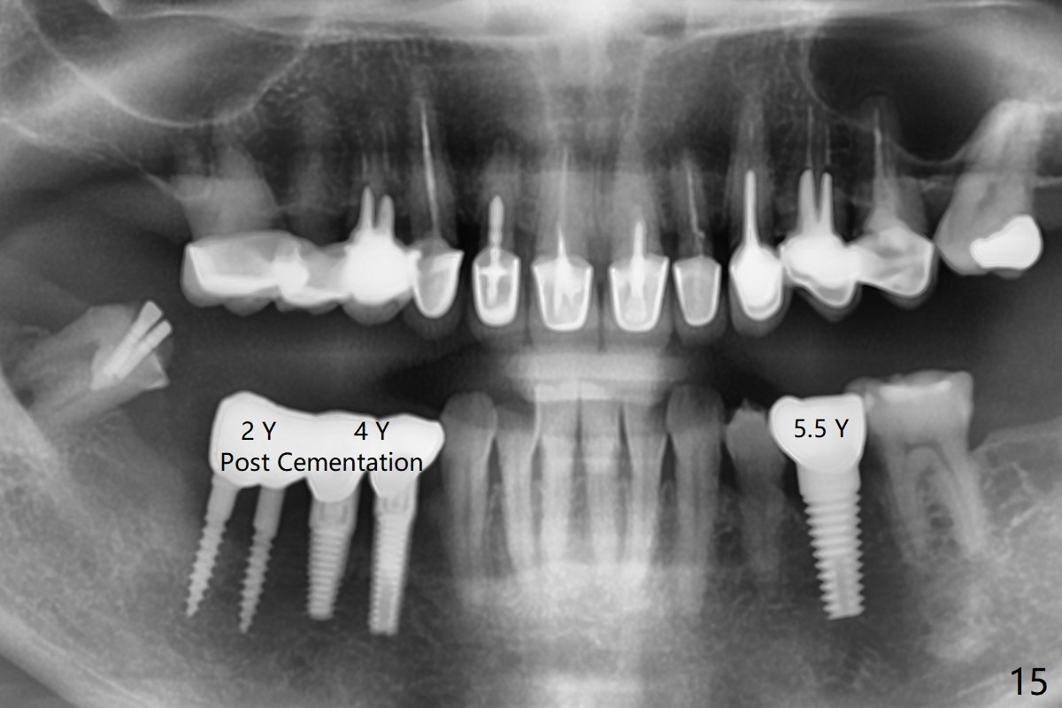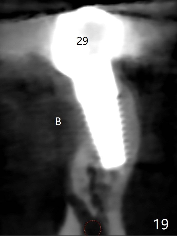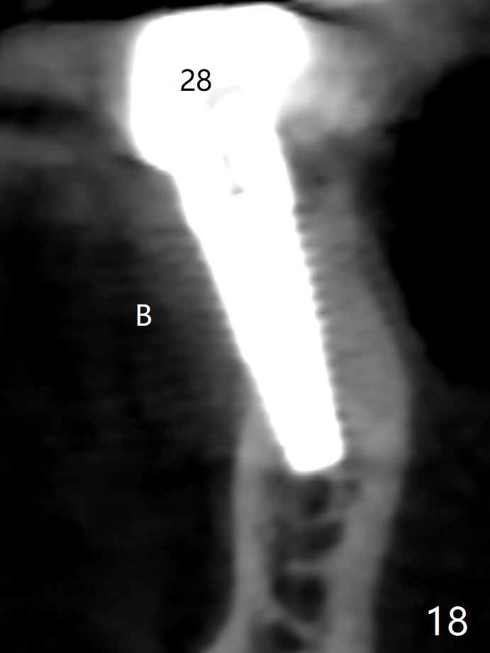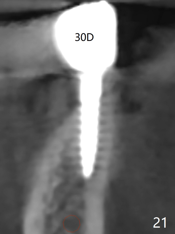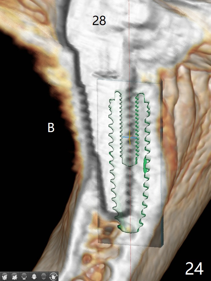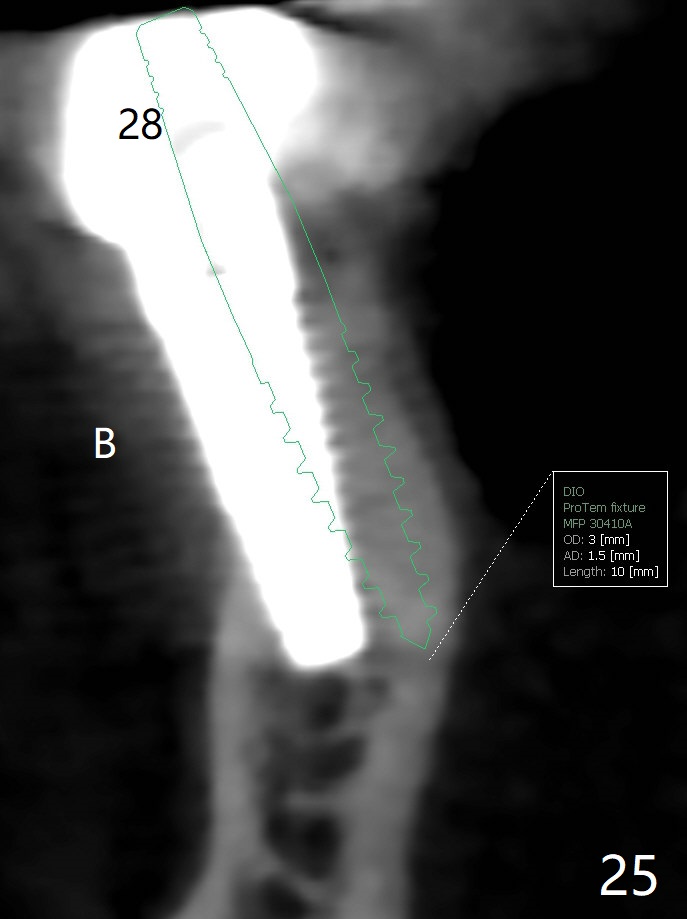 The edentulous ridge at #30 is narrow (Fig.1). After ridge reduction, osteotomy is initiated with 1.2 mm drill for 10 mm; the mesial osteotomy is to be changed (Fig.2 red line). Using a 1.2 mm drill placed in the distal osteotomy (Fig.3 D), the mesial osteotomy changes in trajectory with subsequent placement of a 2.5x10(4) mm 1-piece implant. Since the mesial implant is high in occlusion, the cuff of the distal implant is changed to be 2 mm (Fig.4 (shorter black line)). Panoramic X-ray is taken to show no violation of the Inferior Alveolar Canal (Fig.5 red dashed line). These two 1-piece implants are slightly lingually placed (Fig.6). The crestal bone around the implants resorbs without thread exposure 5 months postop (Fig.7). Impression is taken for a splinted crown (Fig.8-12). There is no metal show around the 2.5 mm 1-piece implants 6 months postop (advantage) vs. that at #28 and 29 (Fig.13). Bitewing is taken post cementation to determine whether residual cement is present (Fig.14). There is periodic swelling and pain in the lower right quadrant 2 years post cementation (Fig.15). In fact periimplantitis appears to have developed at #28 (Fig.16) with loss of the buccal bone (Fig.17,18). The buccal bone loss is less at #29 (Fig.19) and #20 (Fig.23) and no at #30 mesial and distal implants (Fig.20,21). A much smaller implant will be placed lingually at #28 immediate (Fig.24,25).