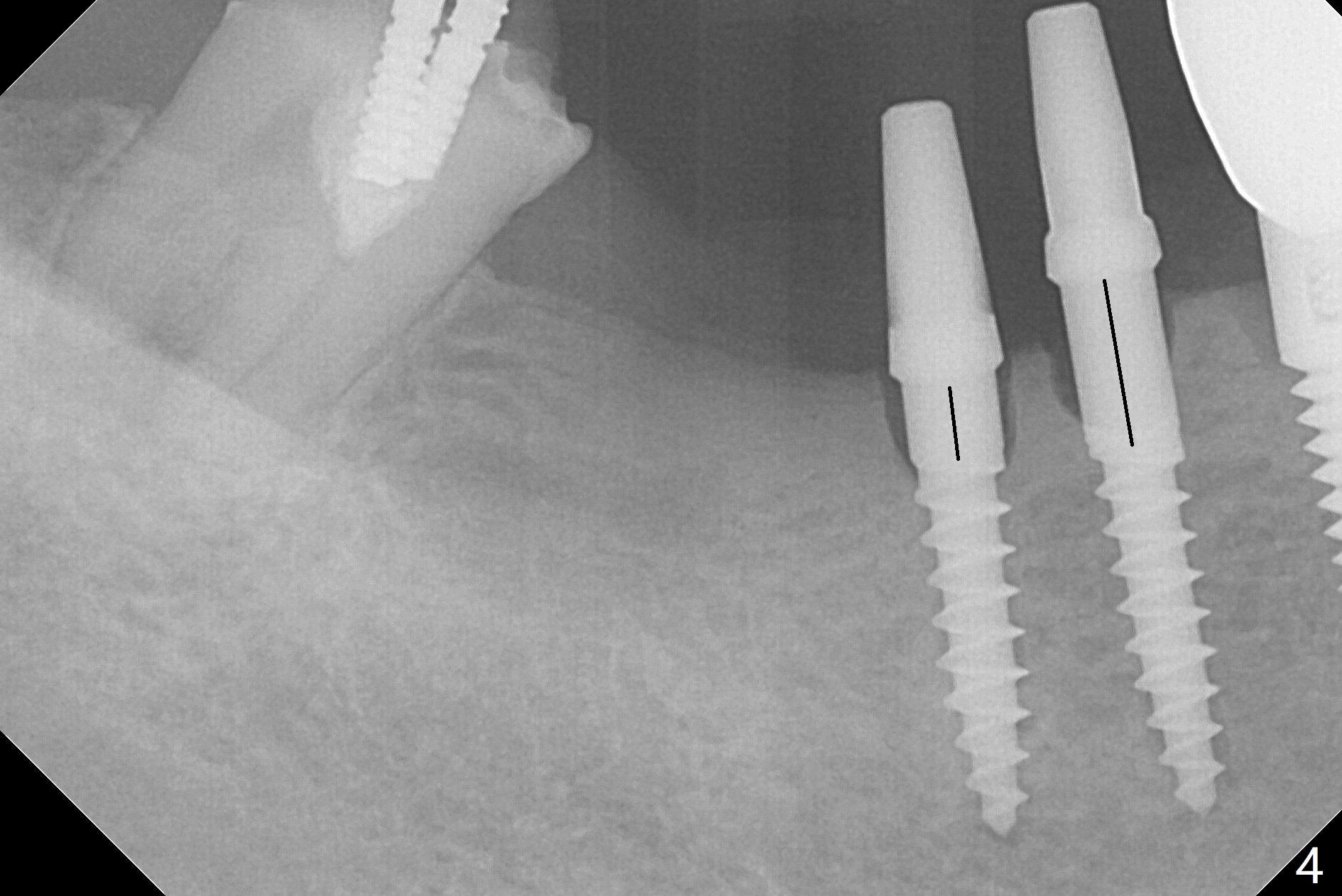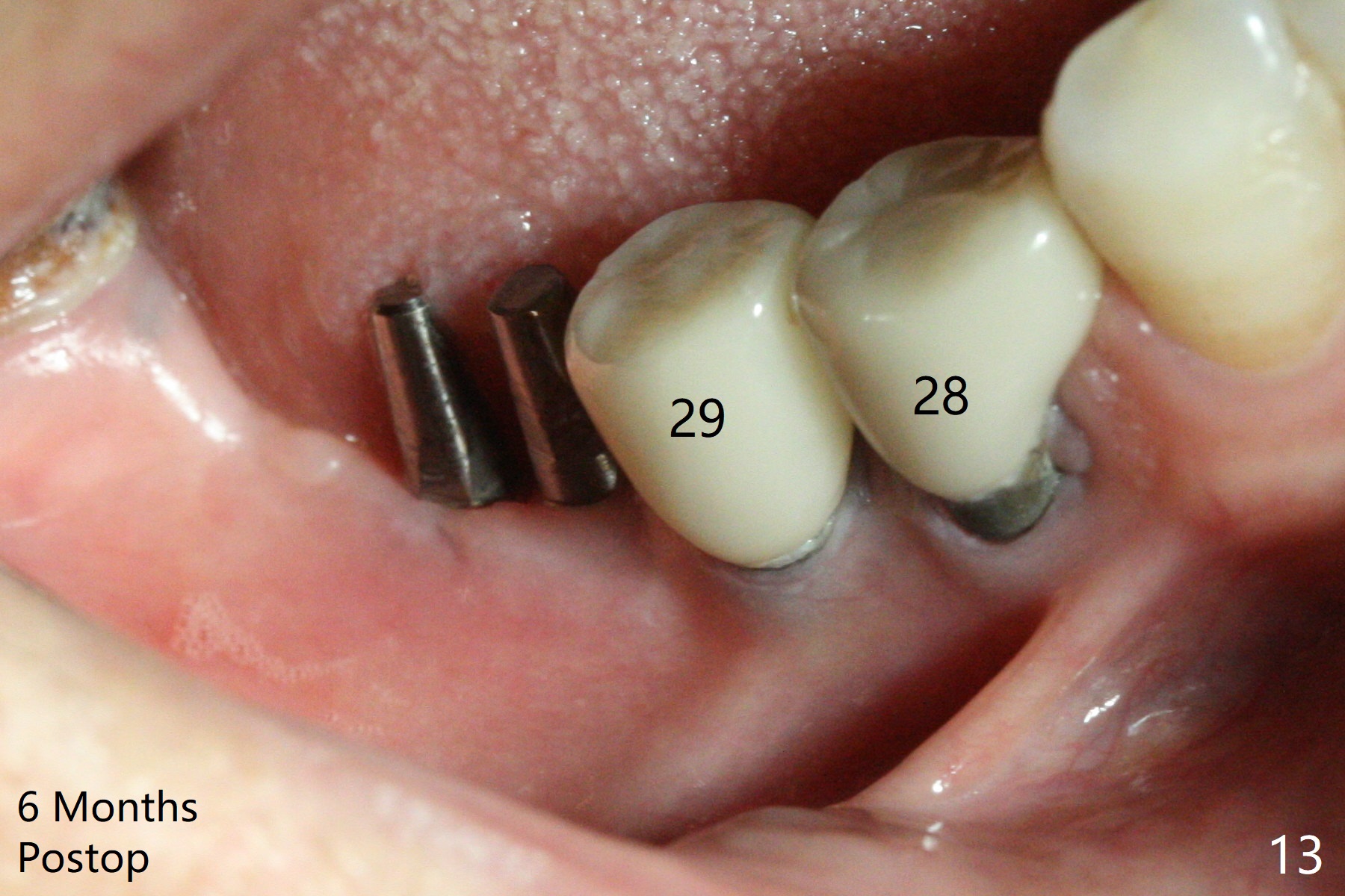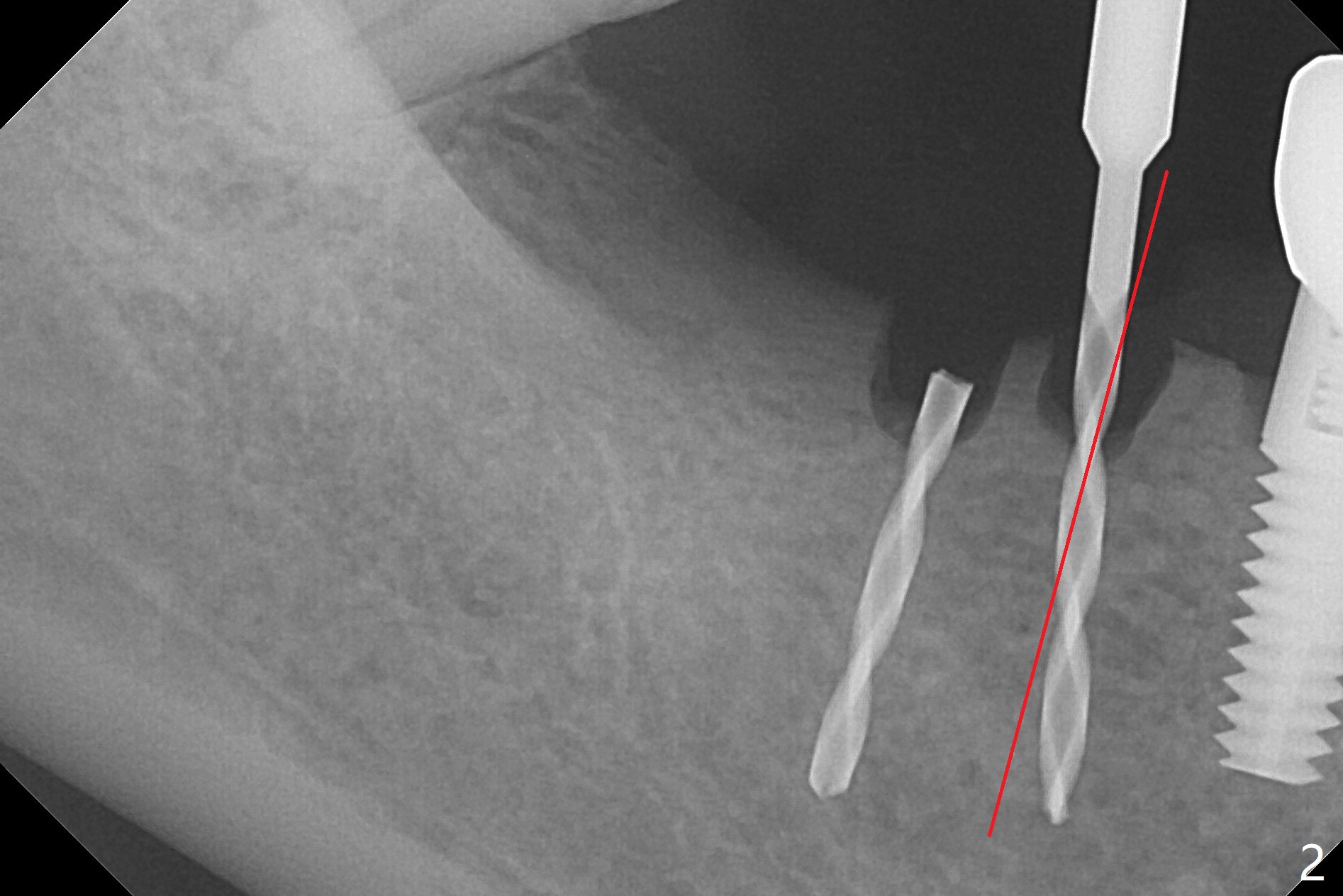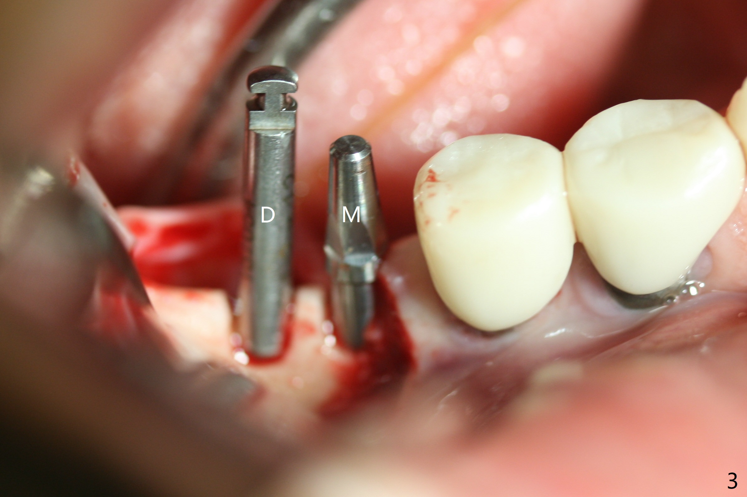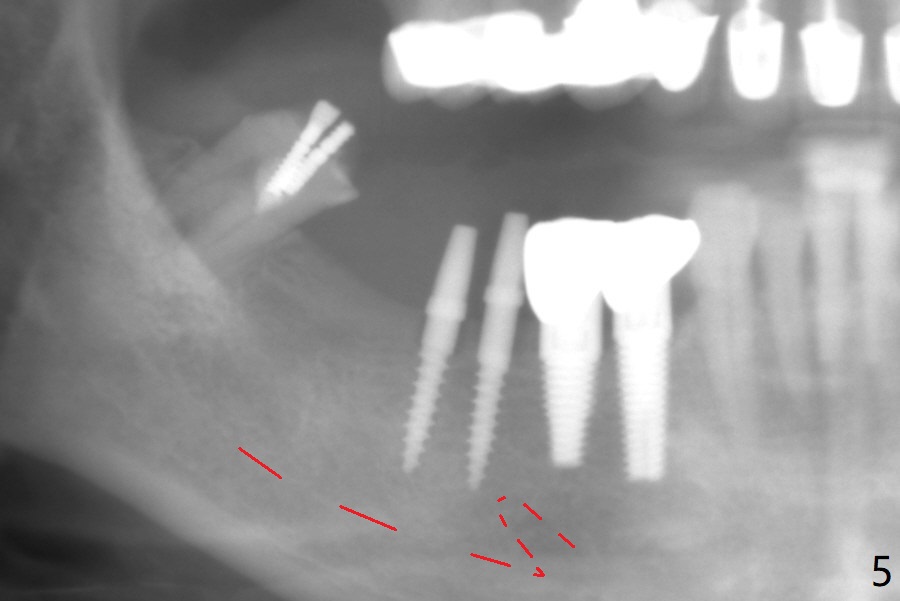 The edentulous ridge at #30 is narrow (Fig.1). After ridge reduction, osteotomy is initiated with 1.2 mm drill for 10 mm; the mesial osteotomy is to be changed (Fig.2 red line). Using a 1.2 mm drill placed in the distal osteotomy (Fig.3 D), the mesial osteotomy changes in trajectory with subsequent placement of a 2.5x10(4) mm 1-piece implant. Since the mesial implant is high in occlusion, the cuff of the distal implant is changed to be 2 mm (Fig.4 (shorter black line)). Panoramic X-ray is taken to show no violation of the Inferior Alveolar Canal (Fig.5 red dashed line). These two 1-piece implants are slightly lingually placed (Fig.6). The crestal bone around the implants resorbs without thread exposure 5 months postop (Fig.7). Impression is taken for a splinted crown (Fig.8-12). There is no metal show around the 2.5 mm 1-piece implants 6 months postop (advantage) vs. that at #28 and 29 (Fig.13). Bitewing is taken post cementation to determine whether residual cement is present (Fig.14). There is periodic swelling and pain in the lower right quadrant 2 years post cementation (Fig.15). In fact periimplantitis appears to have developed at #28 (Fig.16) with loss of the buccal bone (Fig.17,18). The buccal bone loss is less at #29 (Fig.19) and #20 (Fig.23) and no at #30 mesial and distal implants (Fig.20,21). A much smaller implant will be placed lingually at #28 immediate (Fig.24,25).