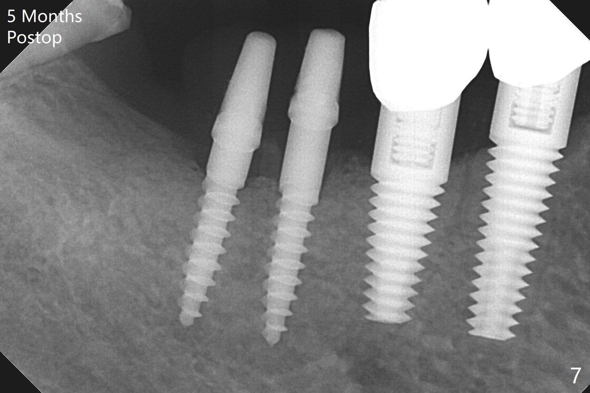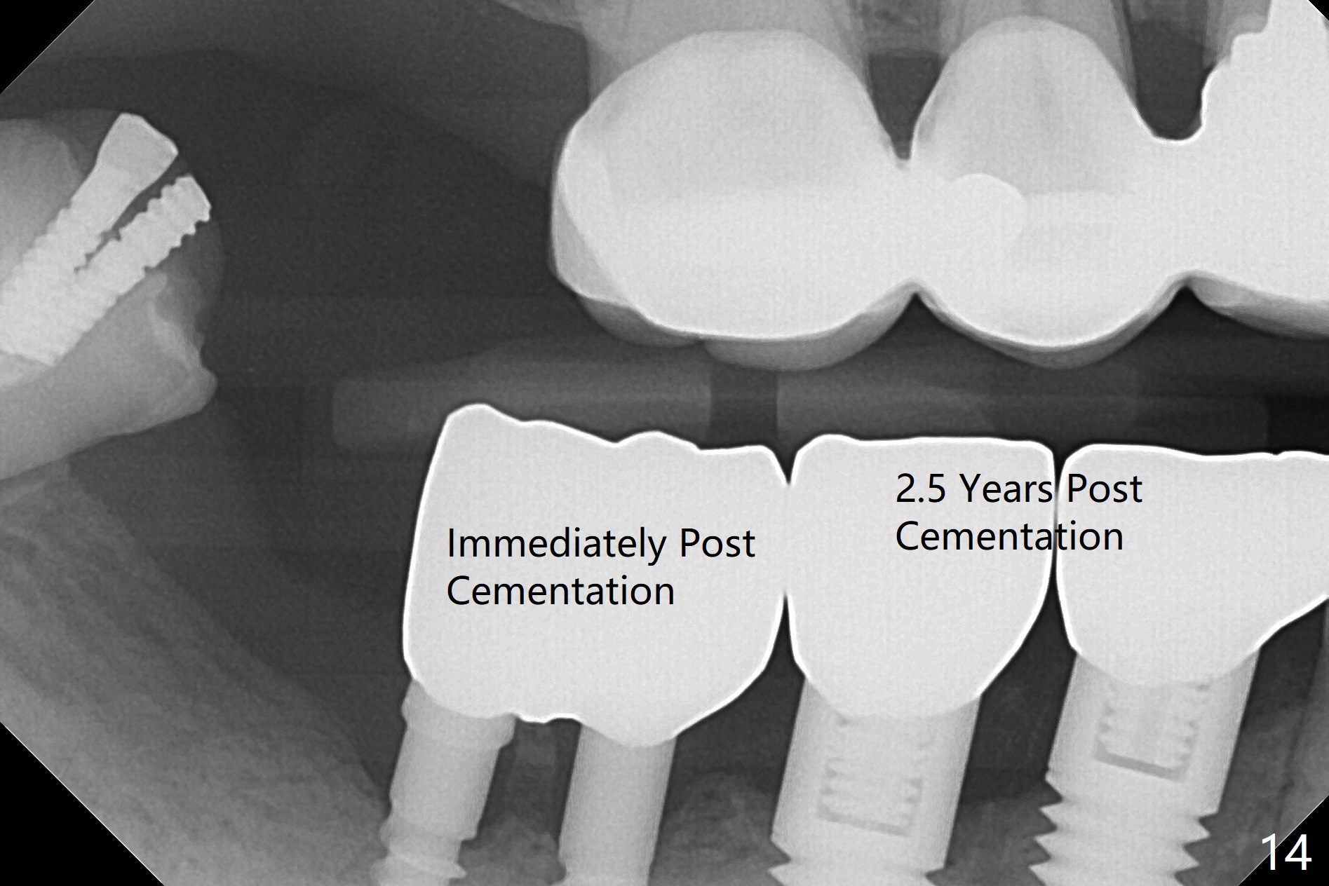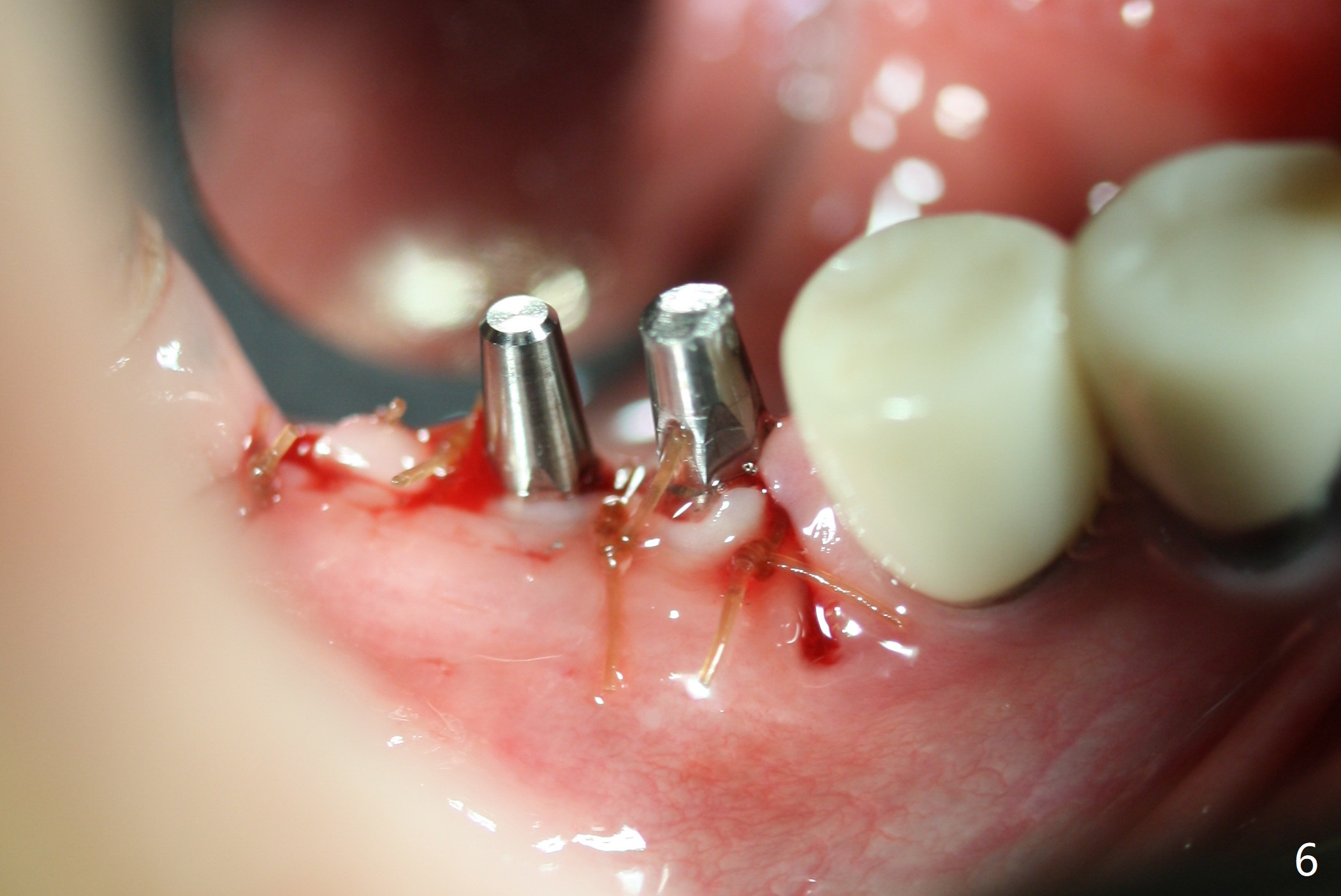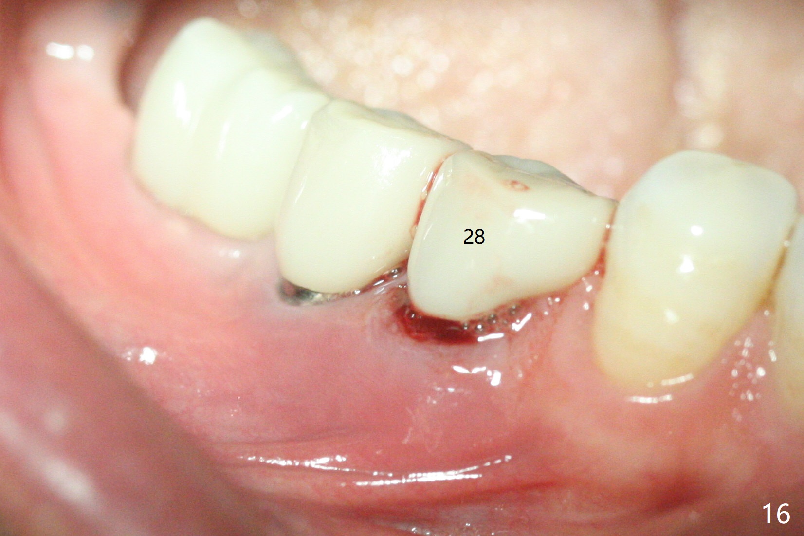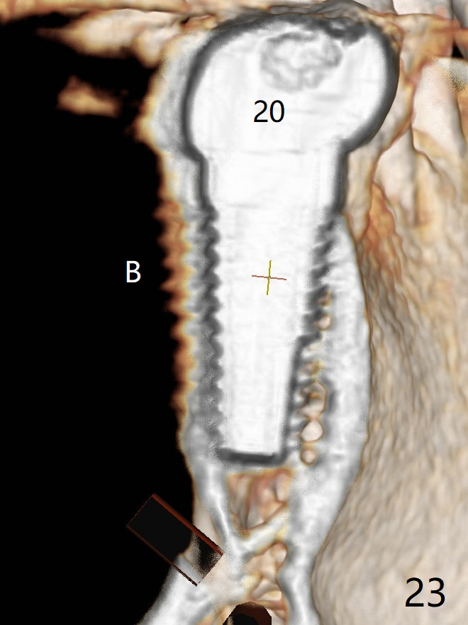 The edentulous ridge at #30 is narrow (Fig.1). After ridge reduction, osteotomy is initiated with 1.2 mm drill for 10 mm; the mesial osteotomy is to be changed (Fig.2 red line). Using a 1.2 mm drill placed in the distal osteotomy (Fig.3 D), the mesial osteotomy changes in trajectory with subsequent placement of a 2.5x10(4) mm 1-piece implant. Since the mesial implant is high in occlusion, the cuff of the distal implant is changed to be 2 mm (Fig.4 (shorter black line)). Panoramic X-ray is taken to show no violation of the Inferior Alveolar Canal (Fig.5 red dashed line). These two 1-piece implants are slightly lingually placed (Fig.6). The crestal bone around the implants resorbs without thread exposure 5 months postop (Fig.7). Impression is taken for a splinted crown (Fig.8-12). There is no metal show around the 2.5 mm 1-piece implants 6 months postop (advantage) vs. that at #28 and 29 (Fig.13). Bitewing is taken post cementation to determine whether residual cement is present (Fig.14). There is periodic swelling and pain in the lower right quadrant 2 years post cementation (Fig.15). In fact periimplantitis appears to have developed at #28 (Fig.16) with loss of the buccal bone (Fig.17,18). The buccal bone loss is less at #29 (Fig.19) and #20 (Fig.23) and no at #30 mesial and distal implants (Fig.20,21). A much smaller implant will be placed lingually at #28 immediate (Fig.24,25).