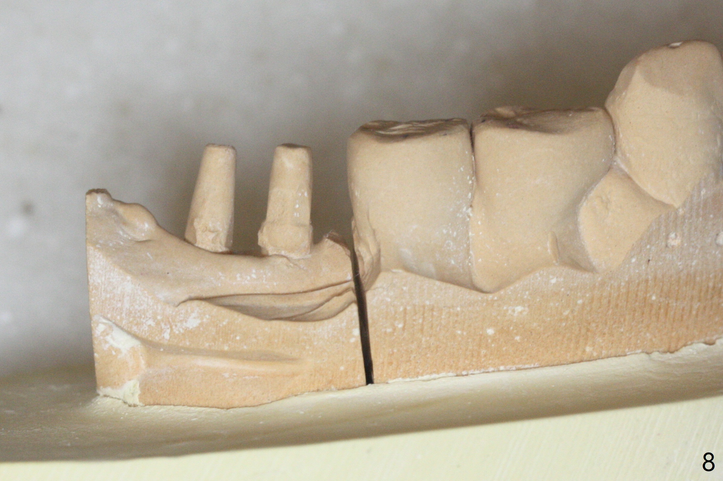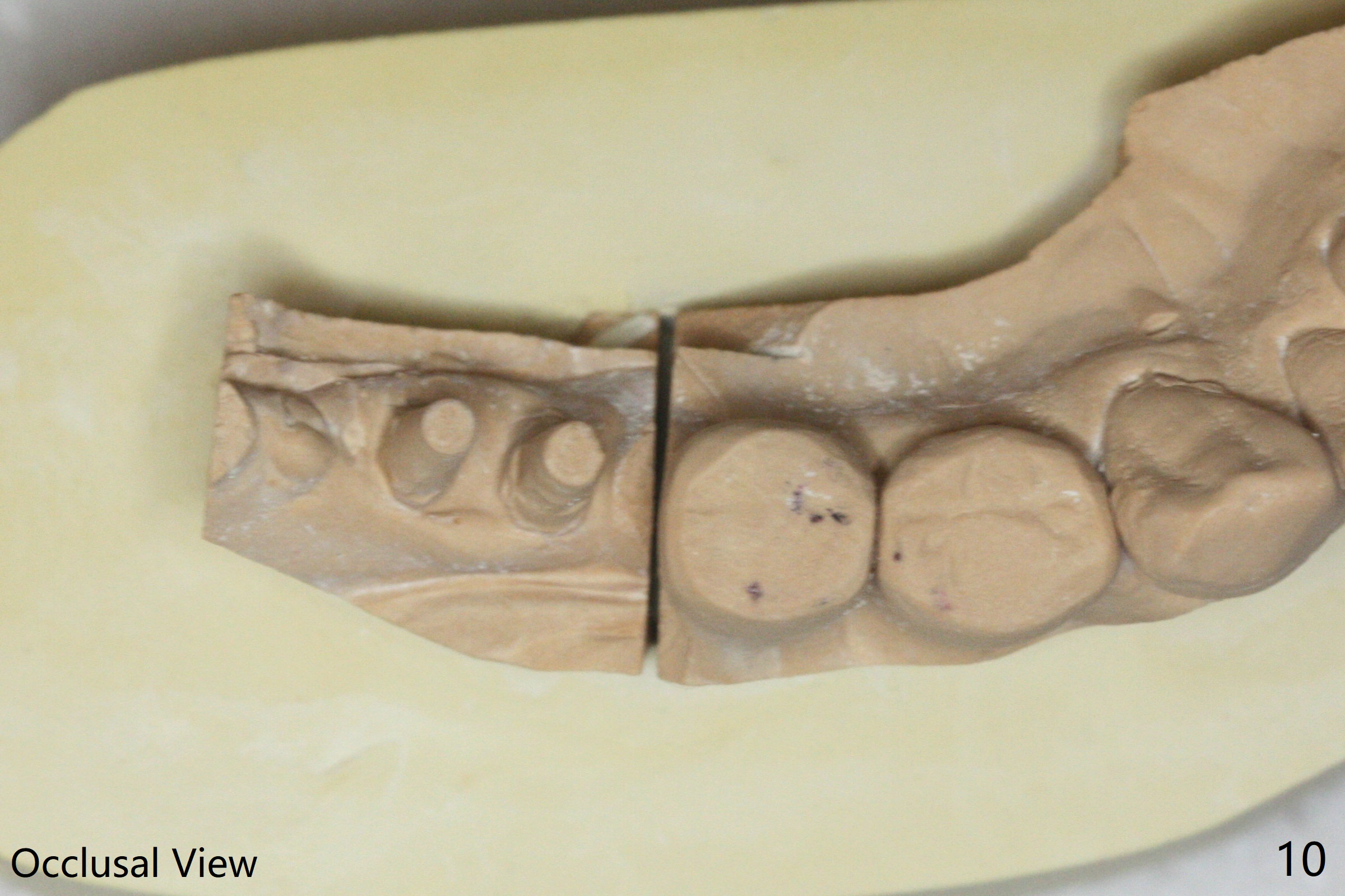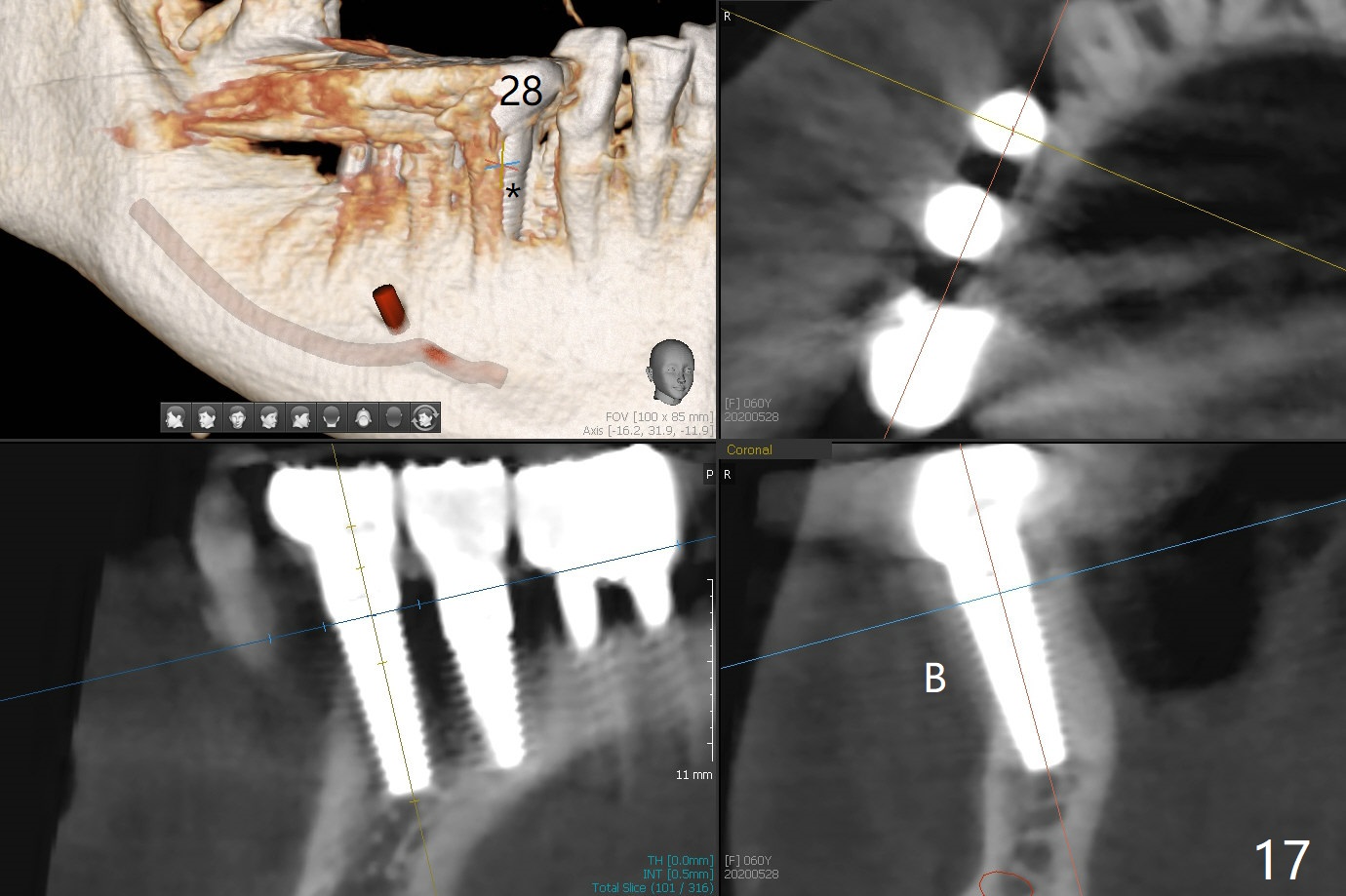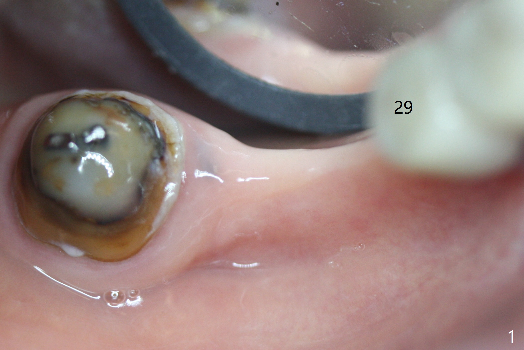 The edentulous ridge at #30 is narrow (Fig.1). After ridge reduction, osteotomy is initiated with 1.2 mm drill for 10 mm; the mesial osteotomy is to be changed (Fig.2 red line). Using a 1.2 mm drill placed in the distal osteotomy (Fig.3 D), the mesial osteotomy changes in trajectory with subsequent placement of a 2.5x10(4) mm 1-piece implant. Since the mesial implant is high in occlusion, the cuff of the distal implant is changed to be 2 mm (Fig.4 (shorter black line)). Panoramic X-ray is taken to show no violation of the Inferior Alveolar Canal (Fig.5 red dashed line). These two 1-piece implants are slightly lingually placed (Fig.6). The crestal bone around the implants resorbs without thread exposure 5 months postop (Fig.7). Impression is taken for a splinted crown (Fig.8-12). There is no metal show around the 2.5 mm 1-piece implants 6 months postop (advantage) vs. that at #28 and 29 (Fig.13). Bitewing is taken post cementation to determine whether residual cement is present (Fig.14). There is periodic swelling and pain in the lower right quadrant 2 years post cementation (Fig.15). In fact periimplantitis appears to have developed at #28 (Fig.16) with loss of the buccal bone (Fig.17,18). The buccal bone loss is less at #29 (Fig.19) and #20 (Fig.23) and no at #30 mesial and distal implants (Fig.20,21). A much smaller implant will be placed lingually at #28 immediate (Fig.24,25).