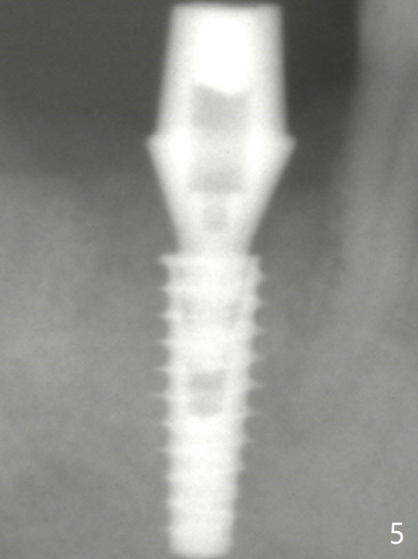 The definitive IBS implant (5x13 mm) is placed with 50 Ncm; a 6.5x5.7(4) mm abutment is placed with allograft filling the gap (* and arrow).