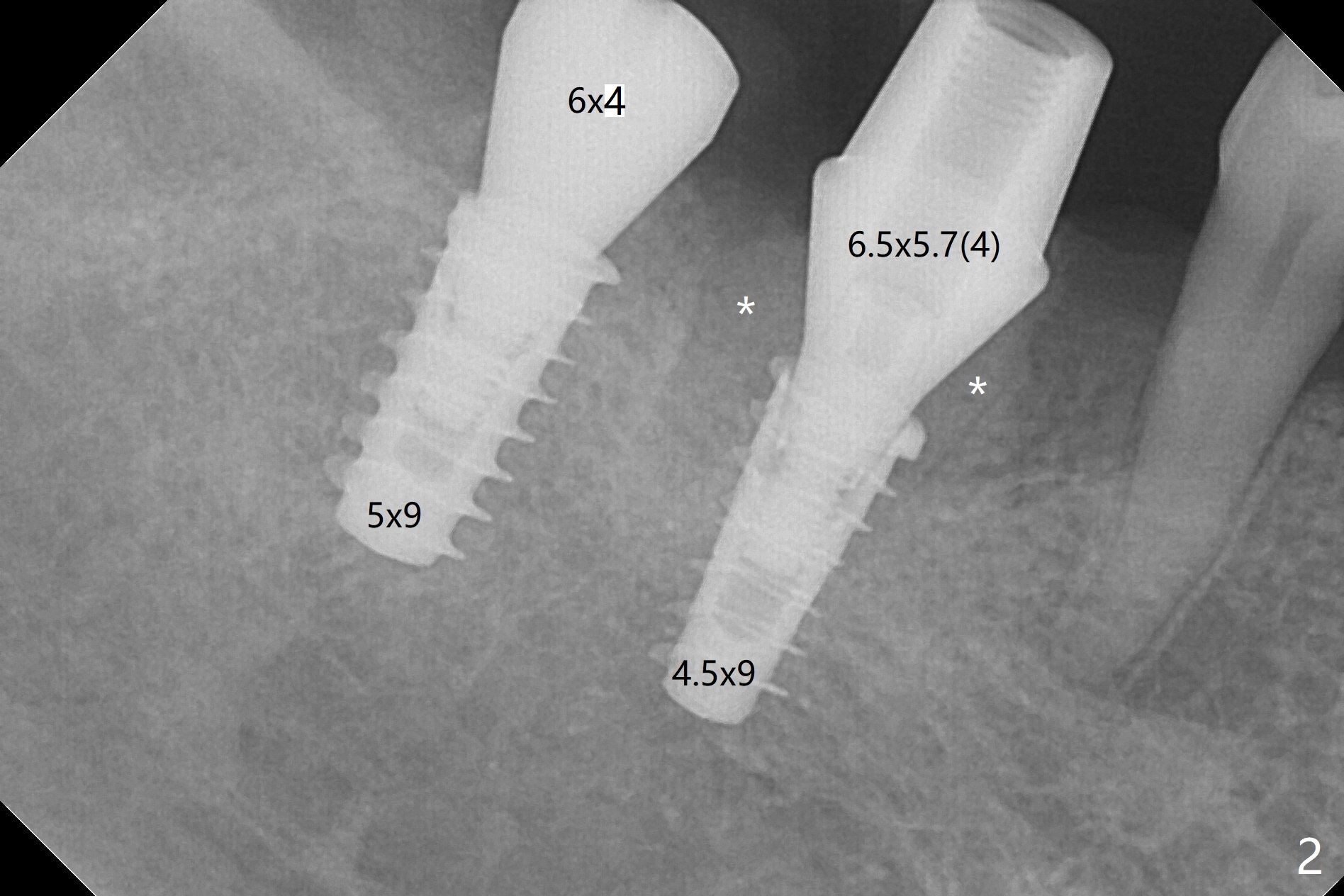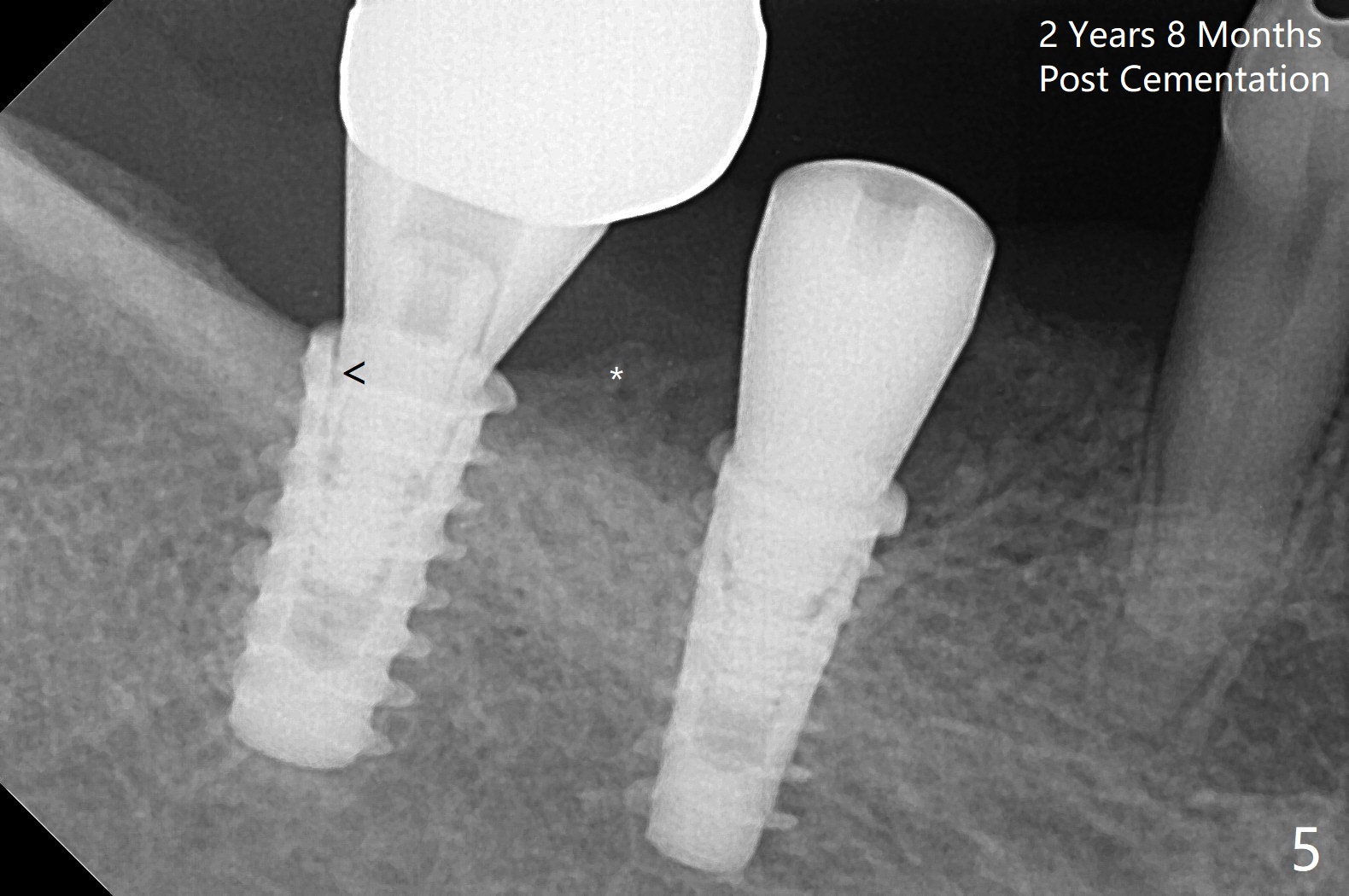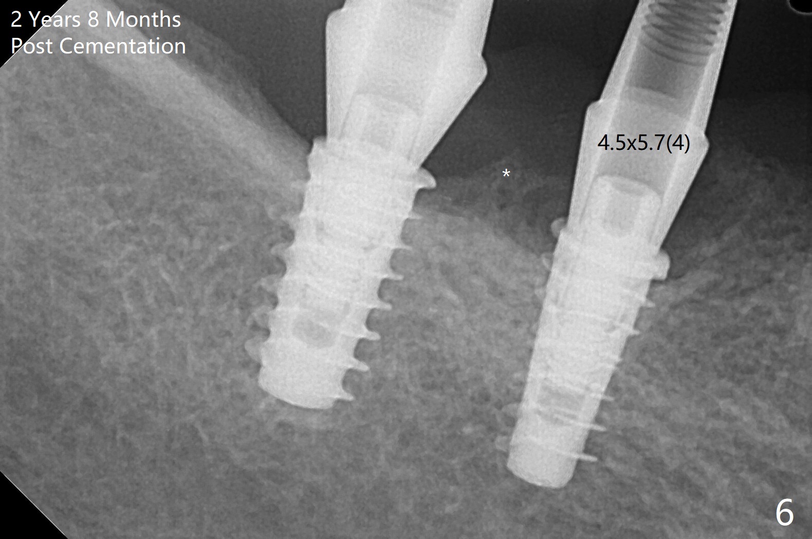 Following osteotomy, 4.5x11 and 5x9 mm dummy implants are placed at the sites of #30 and 31, respectively (Fig.1). Due to limited inventory of Magicore and patient's in-cooperation, FC implants (4.5x9 and 5x9 mm) are placed (Fig.2). A healing abutment (6x4 mm) is placed at #31 because of low torque (overprep), while a pair abutment (6.5x5.7(4) mm) is placed at #30. Vera Graft is placed with autogenous bone (*). The implant/abutment ratio at #30 is unfavorable. If the implant turns out to be loose, immediate implant should be larger in the future. Note bone growth, especially at #30, 2.5 and 4 months postop (Fig.3,4). In fact the abutments are incompletely seated. The crown of #30 is loose 2 years 8 months post cementation, while the abutment at #31 remains incompletely seated (Fig.5). The latter is completely reseated after separating the crown, while a smaller one is seated at #30 (Fig.6) due to use of a small healing abutment earlier (Fig.5). A good piece of news is the presence of the bone between the implants (Fig.5,6 *), which contributes to interimplant papilla. Return to Lower Molar Immediate Implant, Prevent Molar Periimplantitis (Protocols, Table), IBS77, 2-5 Xin Wei, DDS, PhD, MS 1st edition 09/22/2017, last revision 12/01/2020