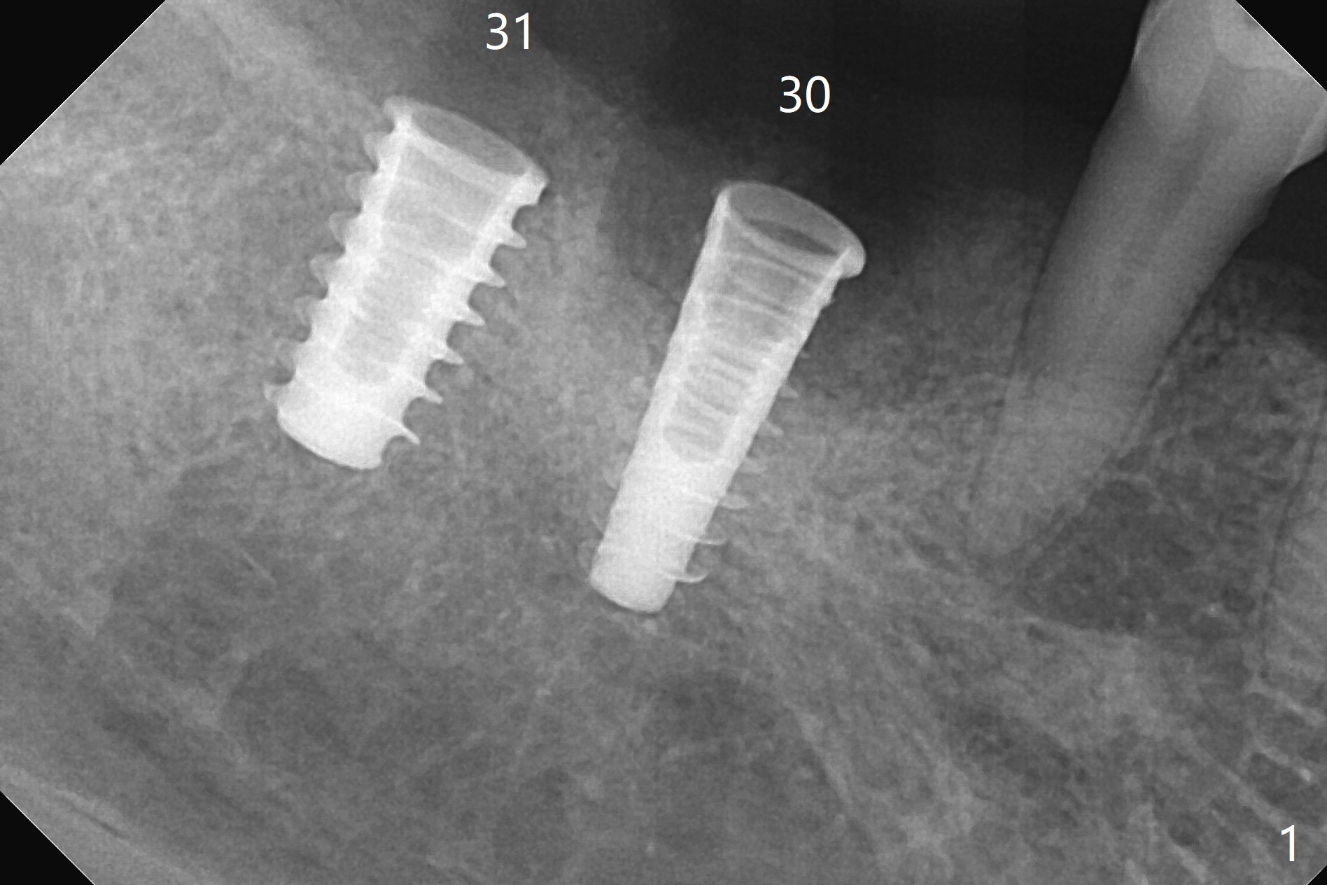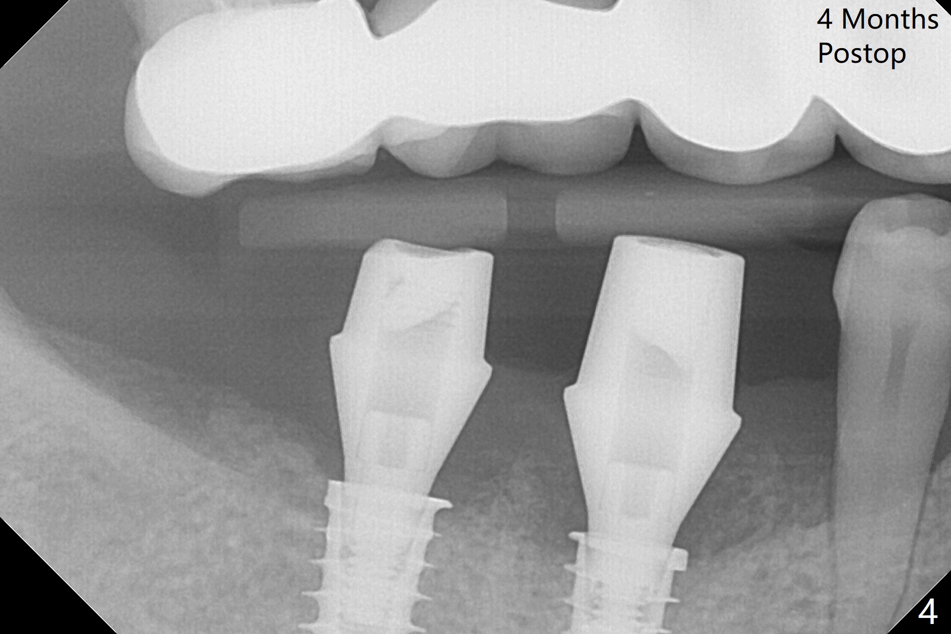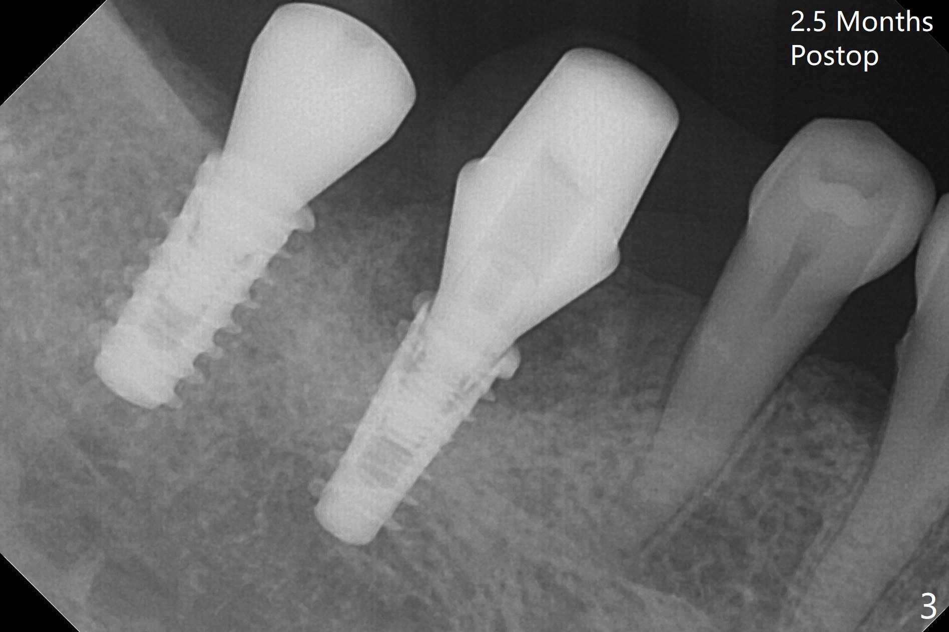 Following osteotomy, 4.5x11 and 5x9 mm dummy implants are placed at the sites of #30 and 31, respectively (Fig.1). Due to limited inventory of Magicore and patient's in-cooperation, FC implants (4.5x9 and 5x9 mm) are placed (Fig.2). A healing abutment (6x4 mm) is placed at #31 because of low torque (overprep), while a pair abutment (6.5x5.7(4) mm) is placed at #30. Vera Graft is placed with autogenous bone (*). The implant/abutment ratio at #30 is unfavorable. If the implant turns out to be loose, immediate implant should be larger in the future. Note bone growth, especially at #30, 2.5 and 4 months postop (Fig.3,4). In fact the abutments are incompletely seated. The crown of #30 is loose 2 years 8 months post cementation, while the abutment at #31 remains incompletely seated (Fig.5). The latter is completely reseated after separating the crown, while a smaller one is seated at #30 (Fig.6) due to use of a small healing abutment earlier (Fig.5). A good piece of news is the presence of the bone between the implants (Fig.5,6 *), which contributes to interimplant papilla. Return to Lower Molar Immediate Implant, Prevent Molar Periimplantitis (Protocols, Table), IBS77, 2-5 Xin Wei, DDS, PhD, MS 1st edition 09/22/2017, last revision 12/01/2020