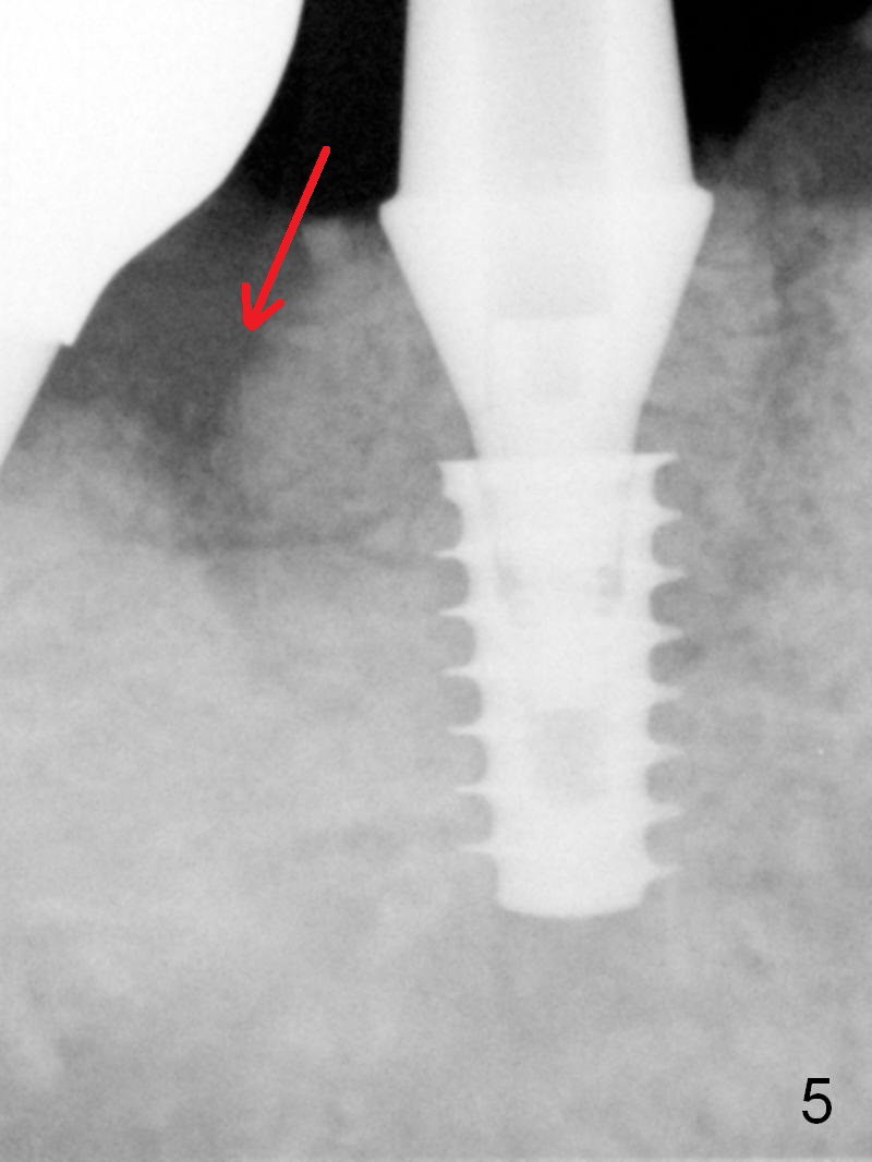 A 5x9 mm implant is placed with packing abundant allograft (.5-1.5 mm) and Osteogen; it appears that 3 to 4 threads (fins) of the implant are engaged to the native bone for primary stability (>40 Ncm). Later more bone graft is placed distally (Fig.5 arrow). Abutment: 6.5x5.5(4) mm.