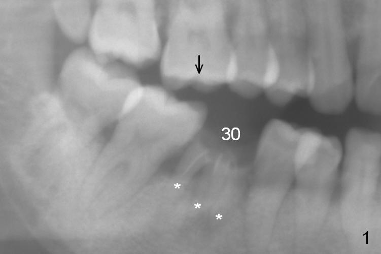A 37-year-old woman is afraid of dentistry and procrastinates implant restoration at #30 (Fig.1). The opposing tooth is supraerupted (arrow) and warrants occlusal adjustment for #30 immediate provisional. Since there are 3 roots associated with #30 (*), the septum should be tripod, where osteotomy will be established after Clindamycin socket application. Primary stability of the immediate implant is further enhanced by the bone height. It is expected to gain ~ 6 mm in the native bone (Fig.2 blue line). As long as the osteotomy is slightly longer than the 2nd molar, there is minimal chance to involve the superior border of the Inferior Alveolar Canal (red dashed line). Magic Split and Expanders are to be used in combination with drills if necessary. Photograph the septum before and after osteotomy.