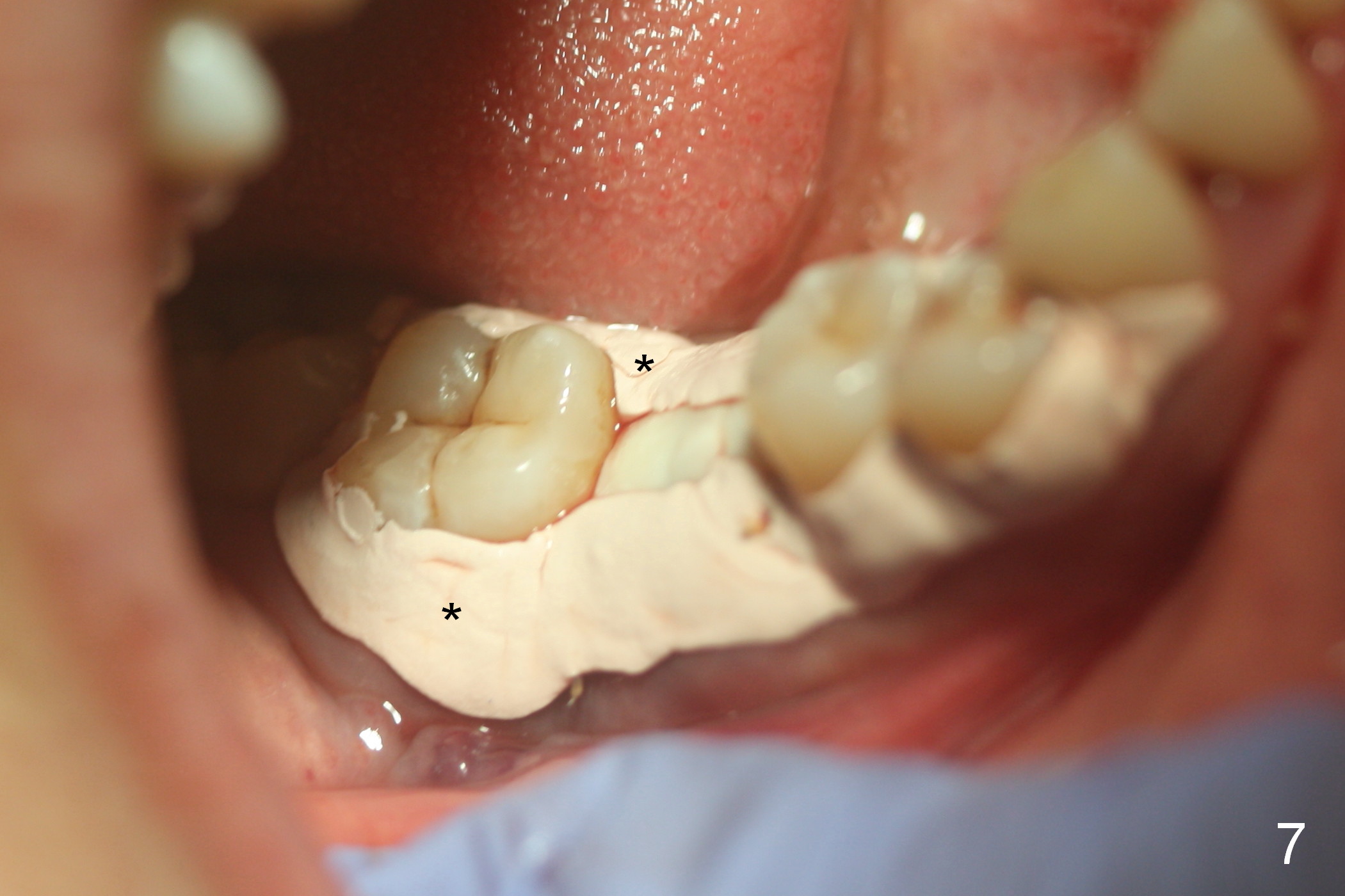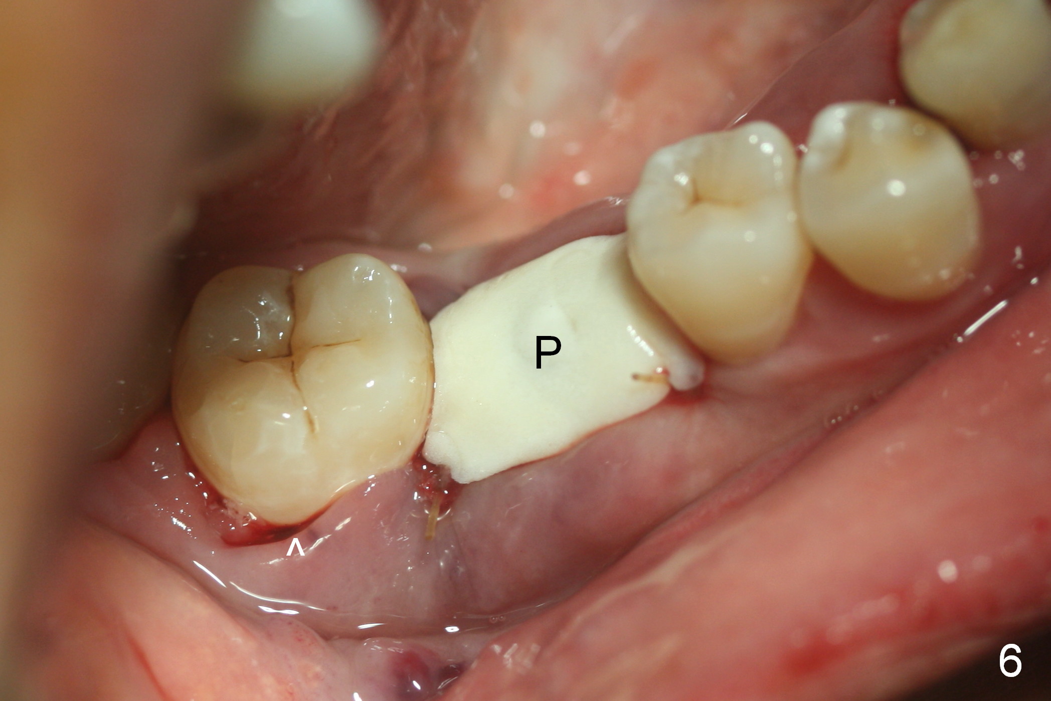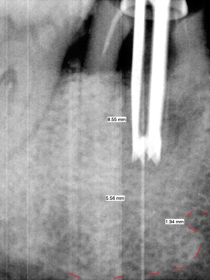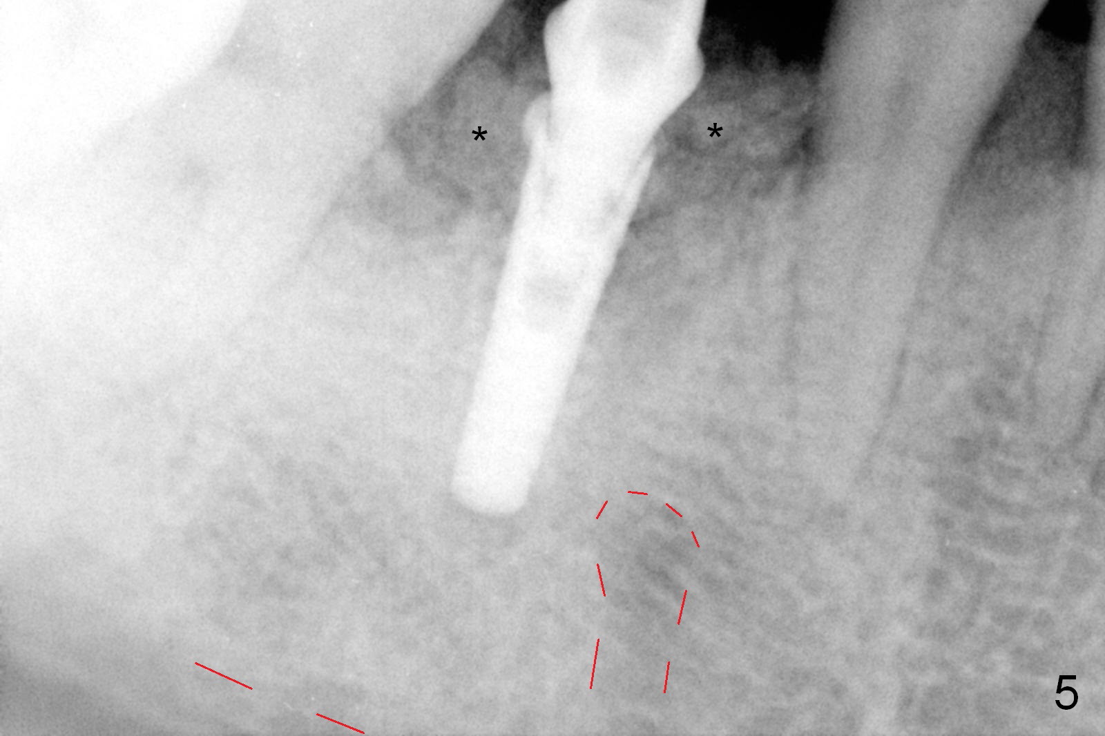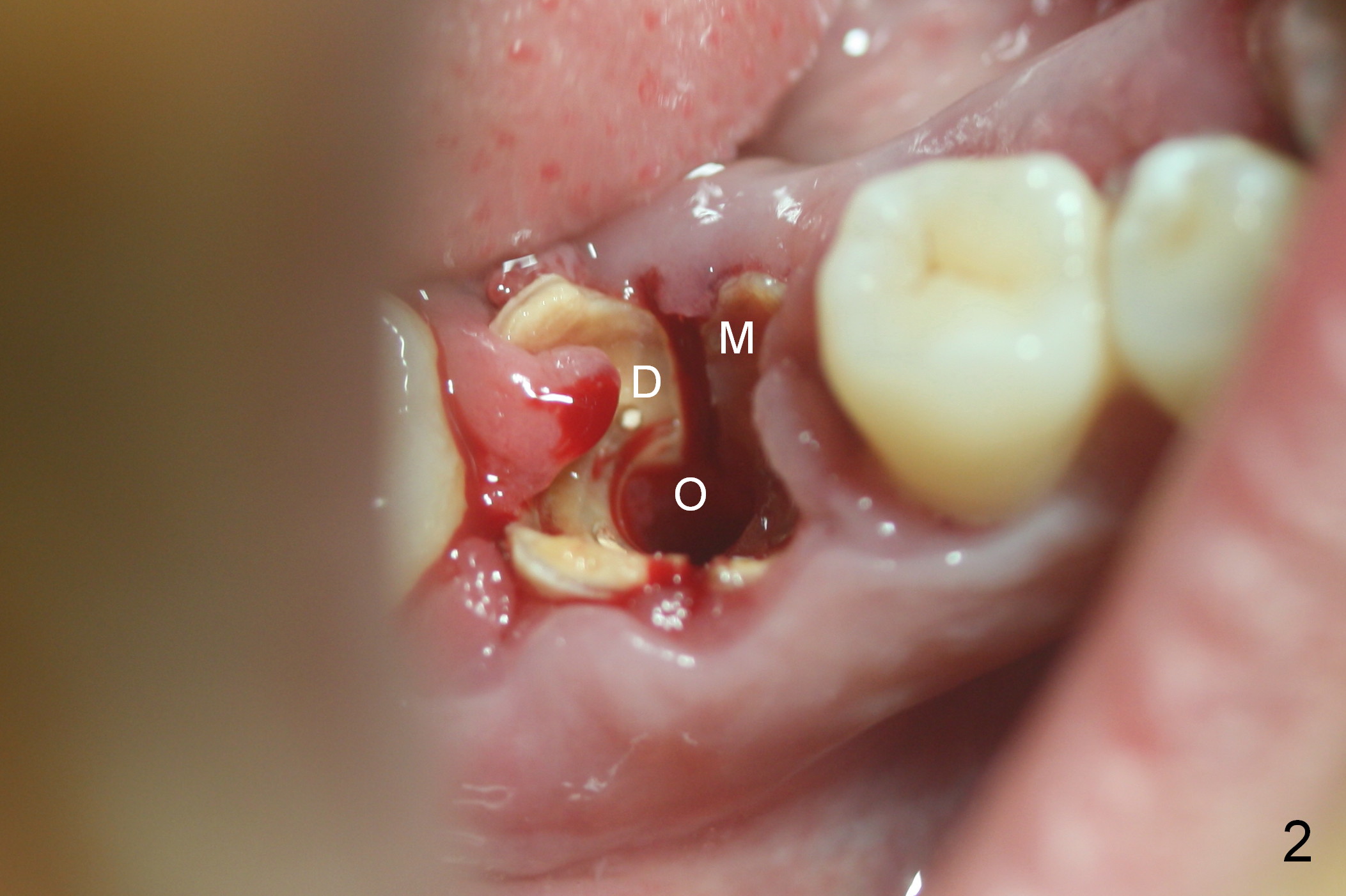 After cleaning the root surface with a surgical curette, a 1.6 mm pilot drill is used to start osteotomy (O) between the mesial (M) and distal (D) roots, followed by a marking bur and 3.8 mm Magic drill 13 mm deep (Fig.1,2). Following root removal, the 3.8 mm drill is reused for 11 mm (Fig.3). After deepening the osteotomy for another 2 mm, a 4.5x13 mm implant is placed with insertion torque of 50 Ncm, followed by allograft (*, .5-2 mm) and a 5x4(2) mm abutment (Fig.4,5). An immediate provisional is fabricated to close the socket (Fig.6 P (lock in)). The detached buccal gingiva (Fig.6 *) is kept in place by applying periodontal dressing (Fig.7 *). Red dashed lines in Fig.1, 3, 5 represents the superior border of the Inferior Alveolar Canal and Mental Foramen.