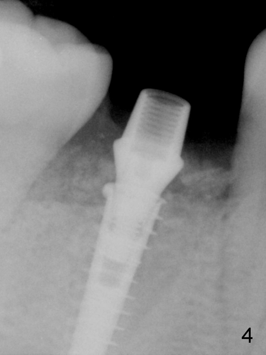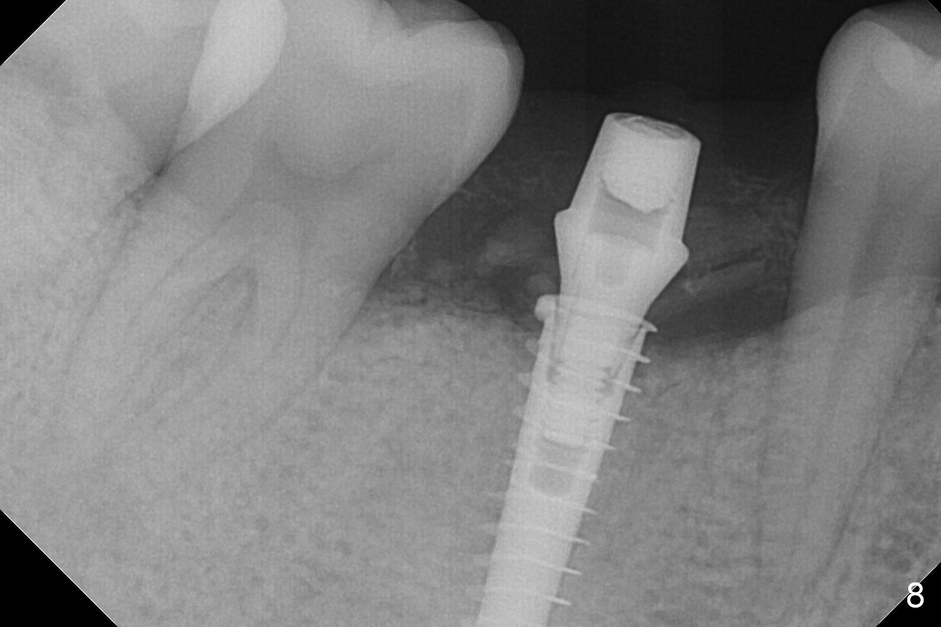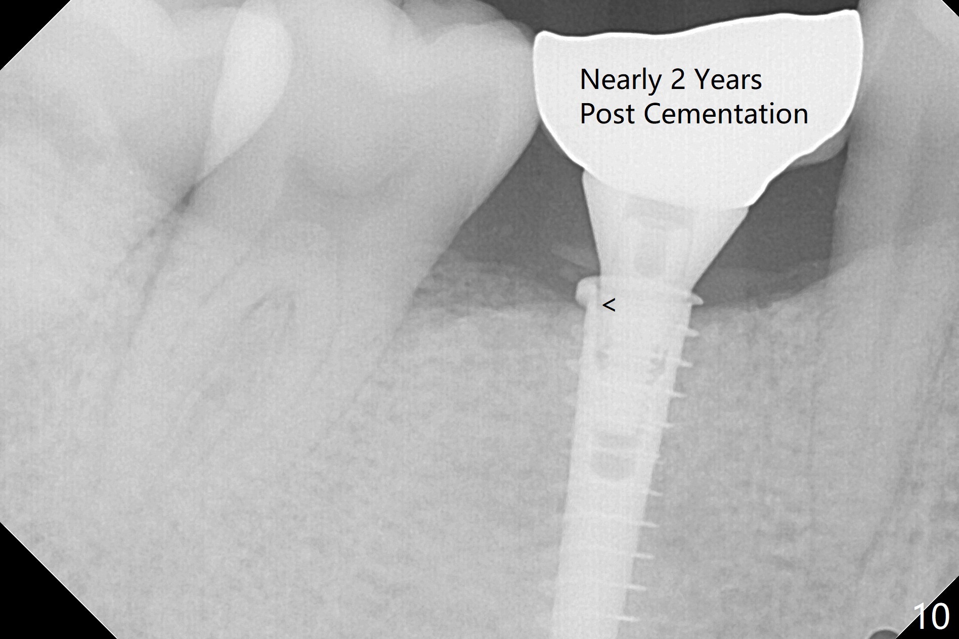 The patient returns 5.5 months postop for final restoration. The implant appears to have osteointegrated (Fig.8). When the locked in provisional is removed, the gingiva bleeds (Fig.9). She will return in 2 weeks. The abutment remains incompletely seated nearly 2 years post cementation (Fig.10).