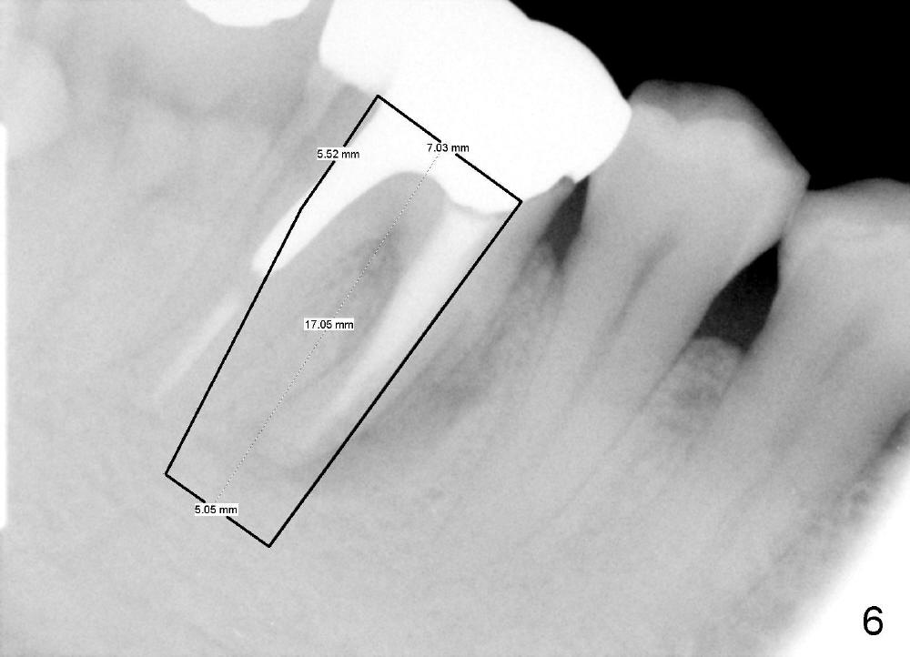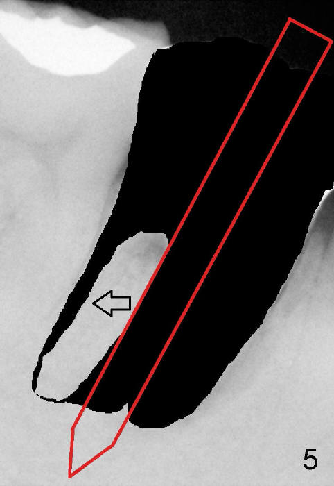 Section the septum mesiodistally with thin osteotomes so that drills and/or rounded osteotomes (Fig.4 red long arrow) will stay in the middle or mesial portion of the septum, while a part of the septum is being pushed distally (open arrow). When larger drills or osteotomes (Fig.5 thicker red long arrow) are being used, more of the septum is being pushed distally (open arrow). A 7x17 mm implant is expected to be placed in the middle of the septum or slightly into the mesial socket (Fig.6). Where does this implant end up?
