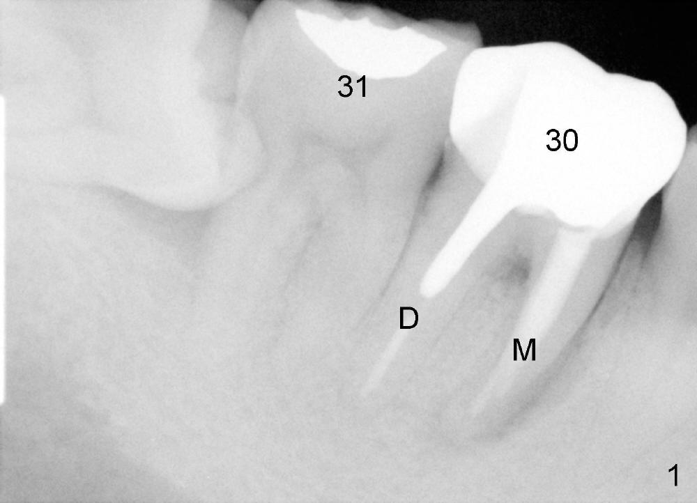 A 40-year-old man presents to clinic with chief complaint of pain in the lower right 1st molar. Exam reveals a fistula in the mesiobuccal area. PA shows a large radiolucency associated with the mesial root. Where should an immediate implant be placed?