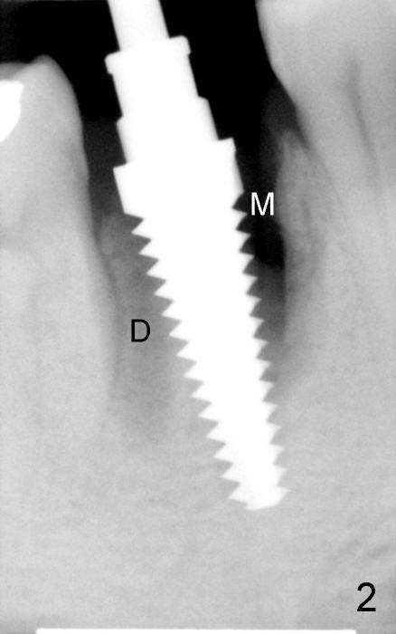 In this case, the root fracture is associated with dense bone (type II). Primary stability is easily achieved. In addition, apical to the original sockets, the implant has five of bony walls, whereas the rest portion two (buccal and lingual). Therefore, do not miss the opportunity of immediate implant.