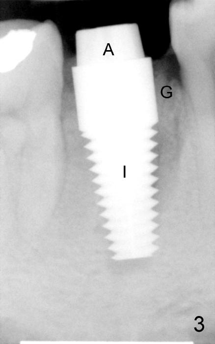 The patient returns for extraction and immediate implant after 7 days of oral Amoxicillin. There is a deep pocket mesiolingually in addition to the mesiobuccal fistula (Fig.1 <). The metal crown and then the tooth are sectioned. The crack of the mesial root is confirmed during extraction. The coronal portion of the mesiobuccal plate is defective, corresponding to the fistula. Both the mesial and distal sockets are large with a thin septum in between. Osteotomy is established at the base of the septum, slightly toward the mesial socket, as evidenced by a 5x20 mm tap in place (Fig.2). Finally, a 7x17 mm implant is placed (Fig.3 I; A: abutment; G: bone graft). The insertion torque is more than 60 Ncm.