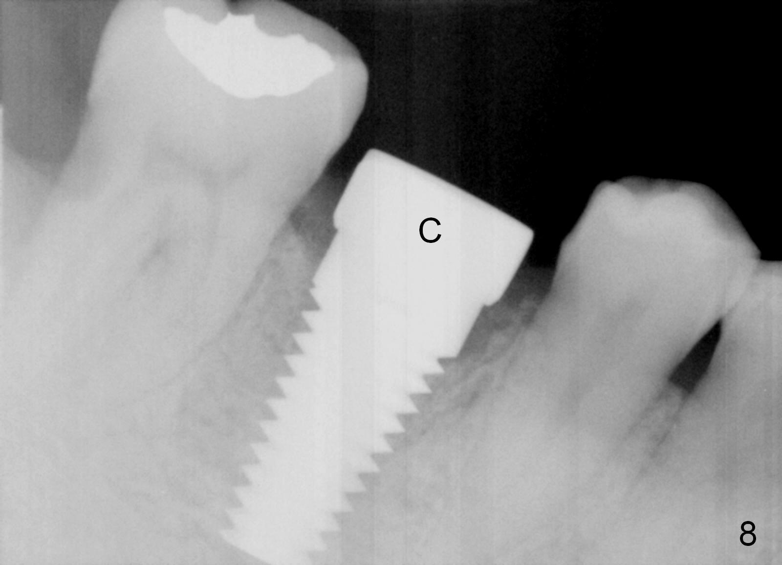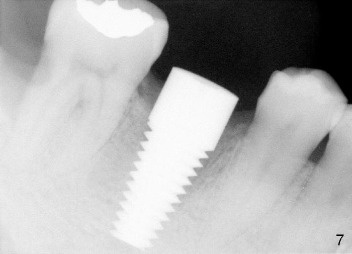 Three weeks postop, the gingiva is healthy around the implant (Fig.5 I). There is no symptom or sign of the infection (>, as compared to Fig.1). The abutment has accomplished its transient function (A, the perio dressing having dislodged) and is subsequently removed (Fig.6, to reduce micromovement of the implant and cheek and tongue bite). The 7 mm implant (I) does not look too big in its new home (alveolus). Four months postop, the mesial socket appears to have normal bony trabecular patterns (Fig.7, as compared to Fig.3).