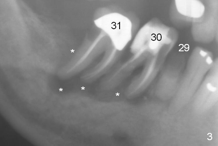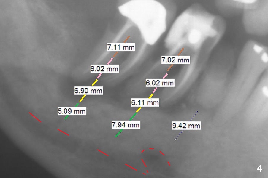 A 71-year-old man had poor dentition 4 years ago (Fig.1). Since then severe bone loss has occurred at the teeth #2 (Fig.2 *), 30 and 31 (Fig.3 *). An original plan is to place implants at #29 and 31 and fabricate a 3-unit bridge. Since the bone height at #31 is limited, primary stability may be questionable. It is advantageous to place 3 implants at #29-31. As the bone loss is severe and the sockets at #30 and 31 are long (Clindamycin), a fairly long portion of the implants at #30 and 31 will be not covered by the native bone (Fig.4 yellow line: 6-7 mm, bare) in spite of using 6 mm cuff (pink) of 7 mm abutments (brown). Use initial drill from DIO Sinus Master Kit with 5 mm stopper at #31 (green line), followed by insertion of a marked parallel pin. Use regular drills with stoppers of 10 and 8 mm at #29 and 30 (green line). Continue osteotomy at #31 with round drills (2.8 and 3.6 mm) with shorter stopper to avoid injury to the underlying Inferior Alveolar Canal (red dashed line). Pack allograft well around the implants at #30 and 31 before placing abutments to reduce periimplantitis and insert collagen plug around the abutments to prevent loss of the bone graft underneath. The last method to secure the bone graft is a retentive, splinted provisional.