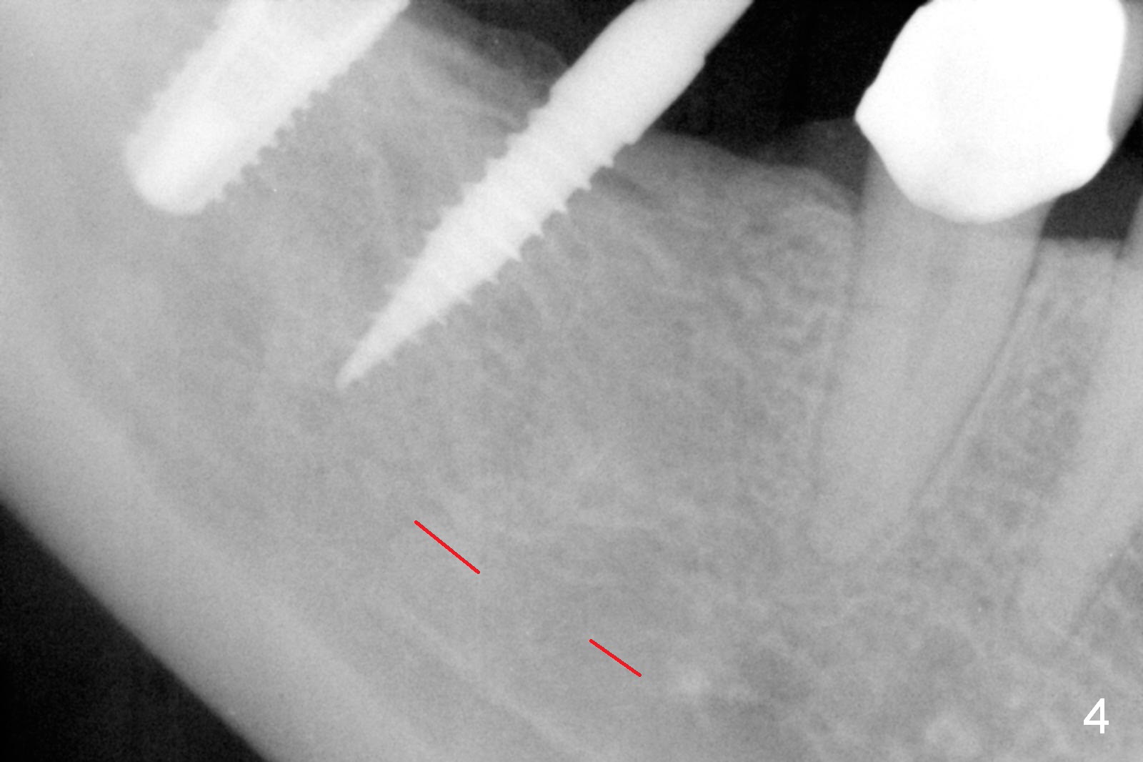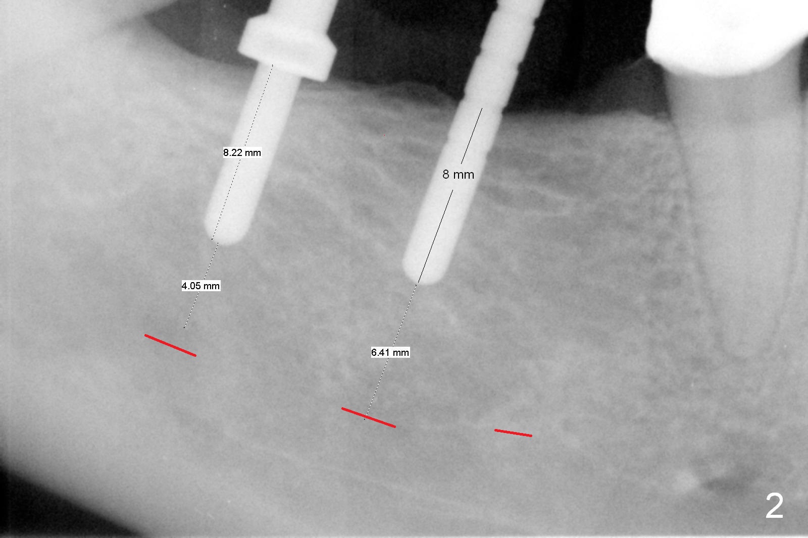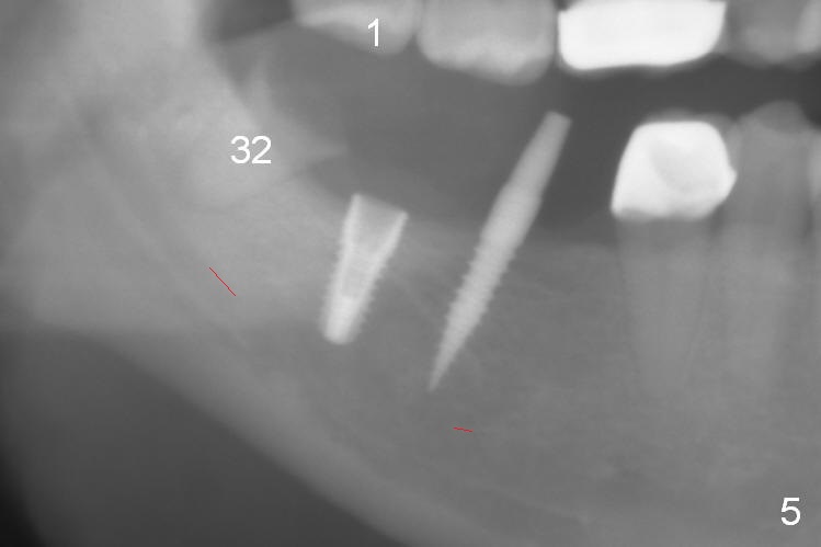 A preop photo shows different shape of pontics at #30 and 31 (Fig.1 <), suggesting different width of the edentulous ridge. Two of 8 mm parallel pins are inserted for position and trajectory (Fig.2 (red dashed line: the superior border of the Inferior Alveolar Canal). When they are removed from the osteotomy sites, the narrow ridge at #30 is shown (Fig.3). A 3x12 mm 1-piece implant is placed at #30, while a 4.5x10 mm 2-piece one at #31 (Fig.4,5). It appears that it is necessary to place an implant at #32, since the tooth #1 is present (Fig.5). The suggestion is rejected by the patient due to finance. After extraction of the tooth #32 and insertion of collagen plug, an immediate splinted provisional is fabricated to cover the #32 socket as well (Fig.6). The provisional is modified (to remove the portion that covers #32 socket) 3-4 weeks postop.