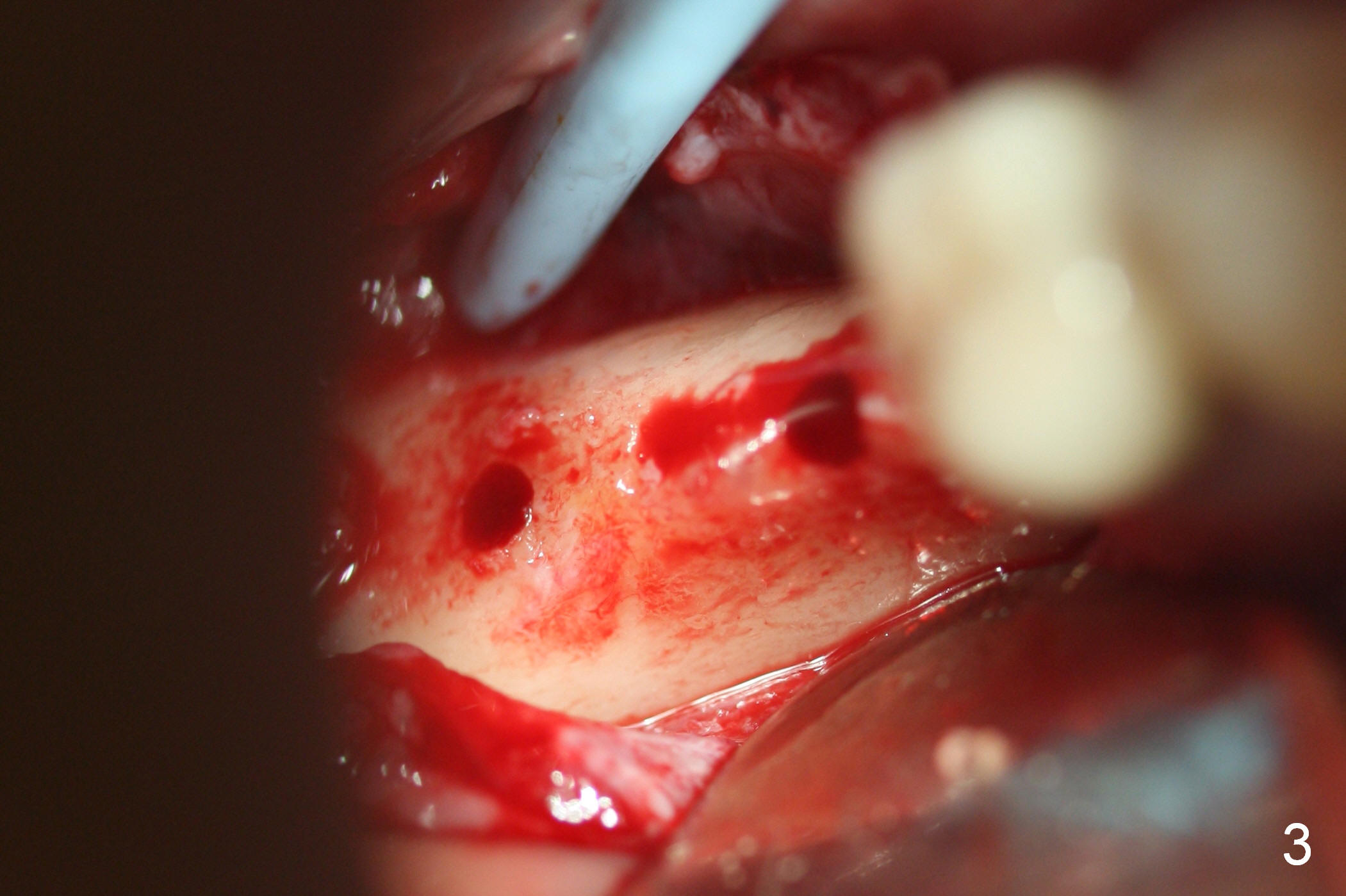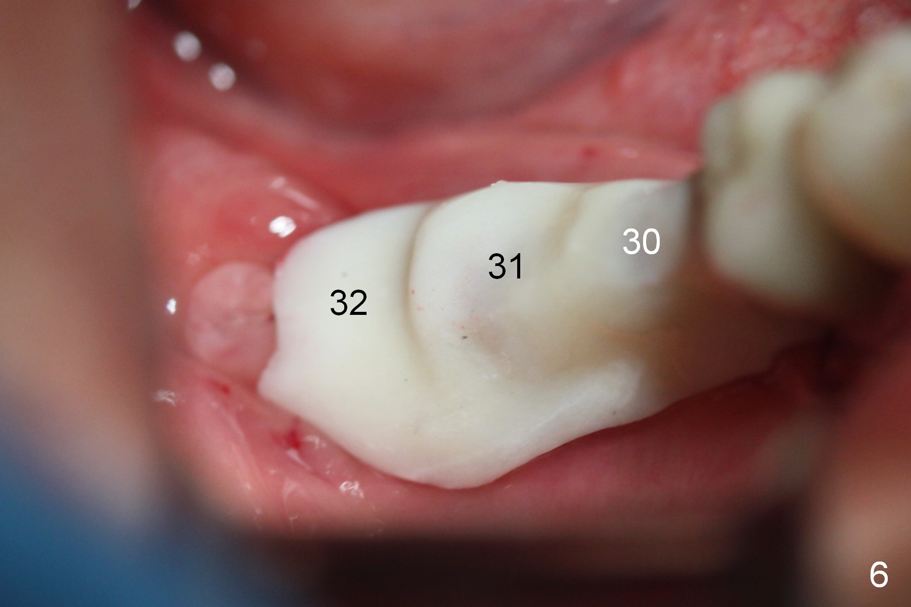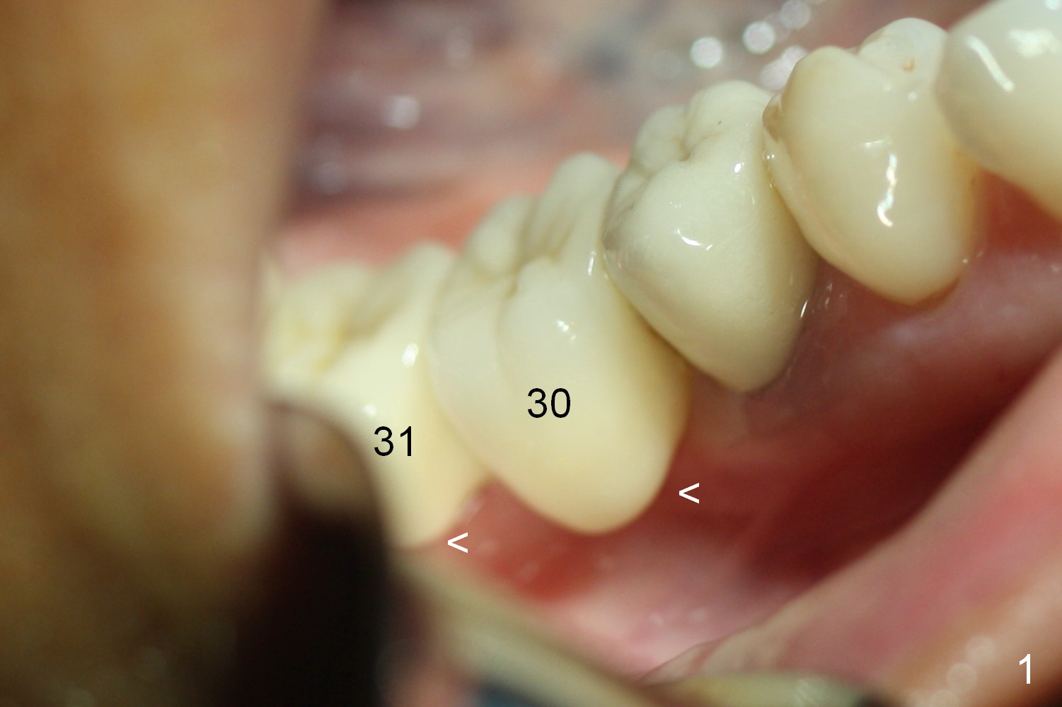 A preop photo shows different shape of pontics at #30 and 31 (Fig.1 <), suggesting different width of the edentulous ridge. Two of 8 mm parallel pins are inserted for position and trajectory (Fig.2 (red dashed line: the superior border of the Inferior Alveolar Canal). When they are removed from the osteotomy sites, the narrow ridge at #30 is shown (Fig.3). A 3x12 mm 1-piece implant is placed at #30, while a 4.5x10 mm 2-piece one at #31 (Fig.4,5). It appears that it is necessary to place an implant at #32, since the tooth #1 is present (Fig.5). The suggestion is rejected by the patient due to finance. After extraction of the tooth #32 and insertion of collagen plug, an immediate splinted provisional is fabricated to cover the #32 socket as well (Fig.6). The provisional is modified (to remove the portion that covers #32 socket) 3-4 weeks postop.