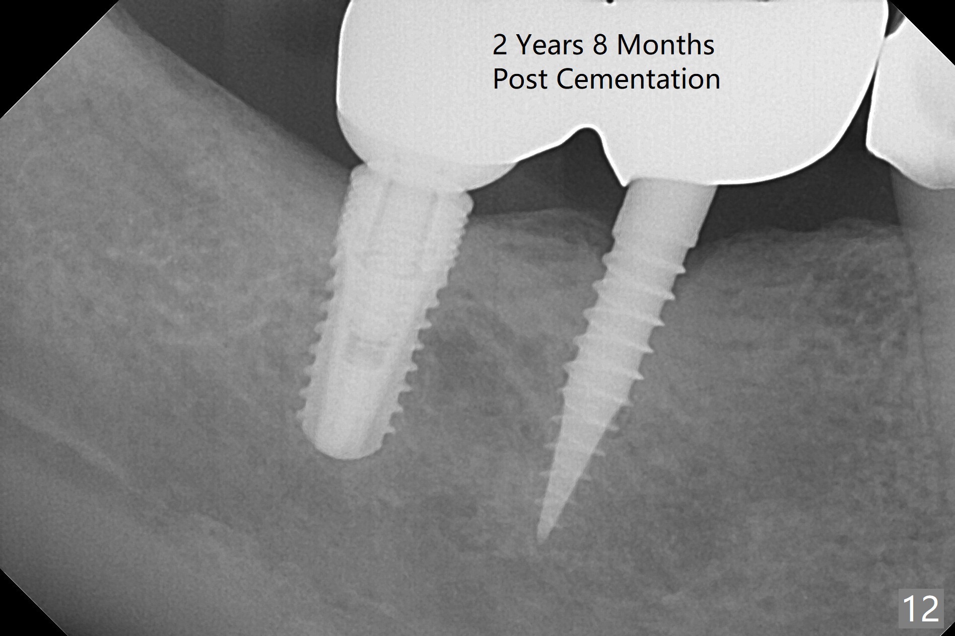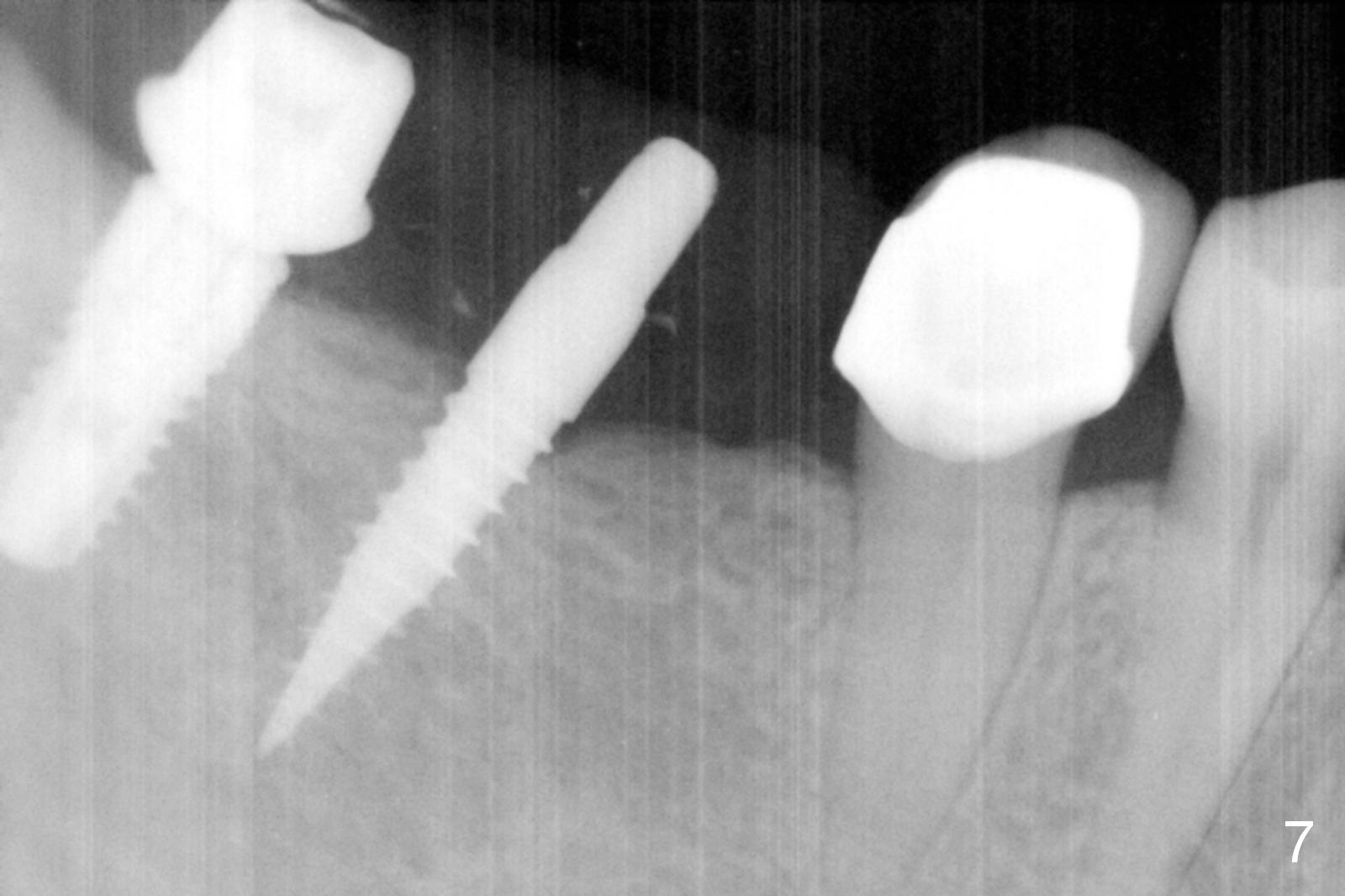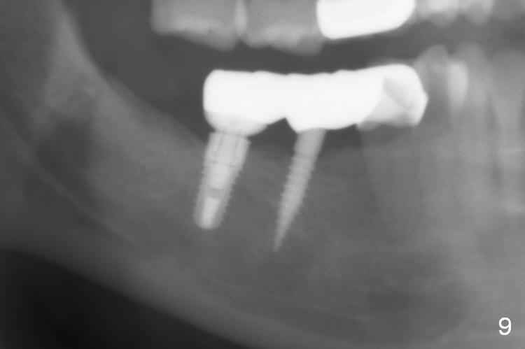 The patient returns for final restoration 3 months postop; bone resorption around the 1-piece implant is minimal (Fig.7). The definitive restoration is also splinted. The latter is further justified when the implant at #30 is found to be distal prior to cementation (Fig.8 *). It appears that implant spacing at the root level is more critical than parallelism, as compared to Fig.7. Let us improve this aspect. Bone loss around the implants remains minimal 7 months post cementation (Fig.9). It is the same 1 year 8 months post cementation (Fig.10), as compared to a cantilever FPD on the other side (Fig.11). The bone density around the implants at #30 and 31 increases 2 year 8 months post cementation (Fig.12).
