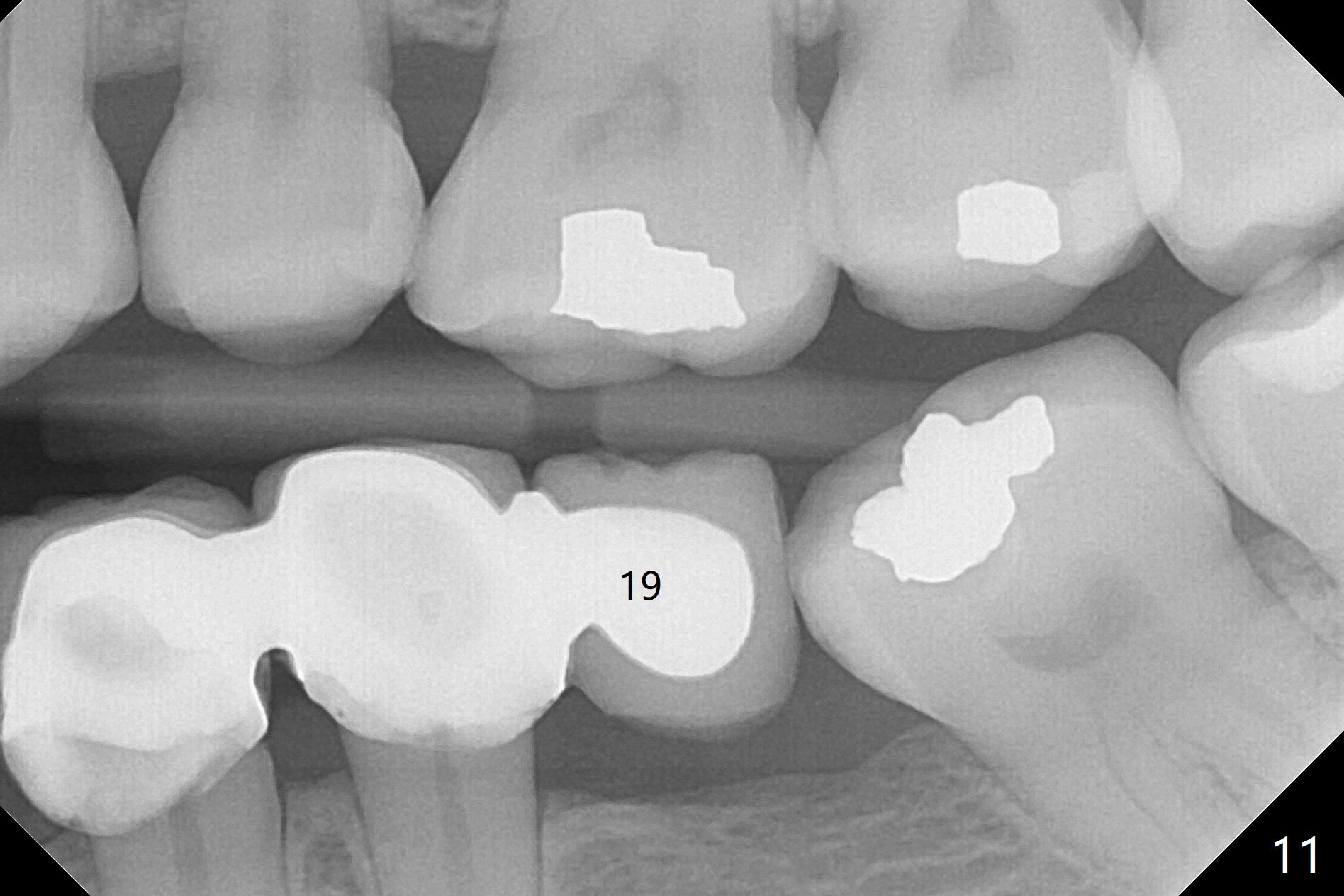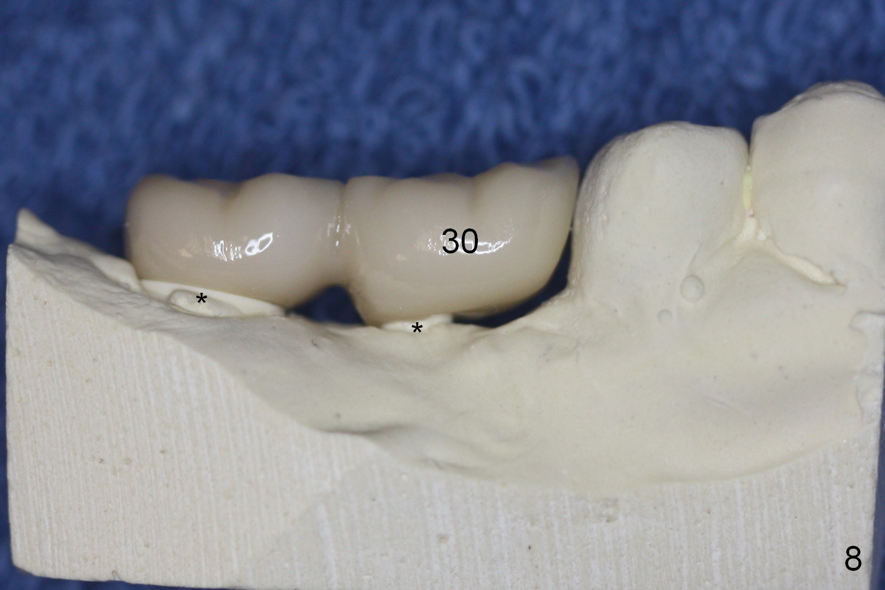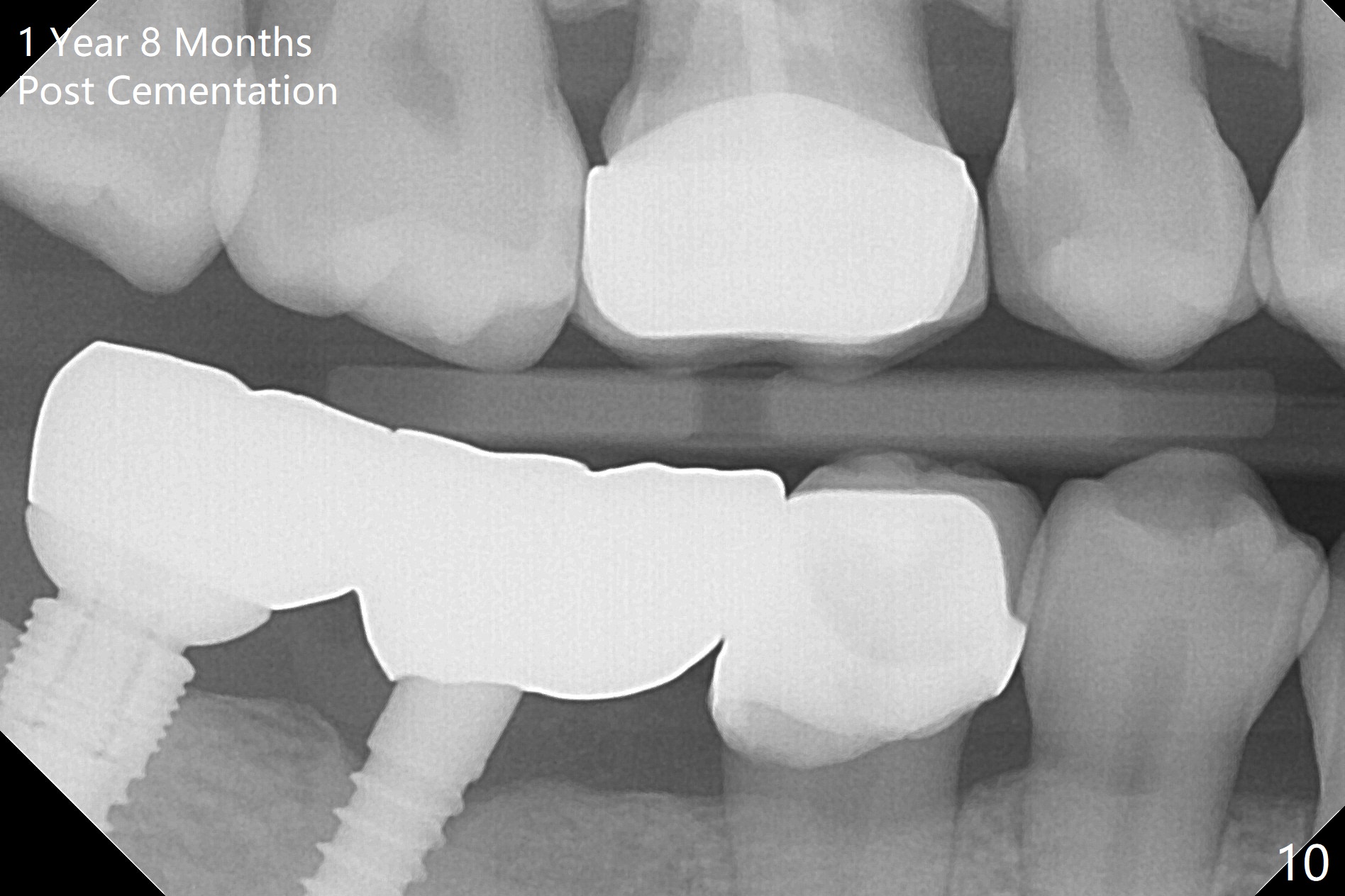 The patient returns for final restoration 3 months postop; bone resorption around the 1-piece implant is minimal (Fig.7). The definitive restoration is also splinted. The latter is further justified when the implant at #30 is found to be distal prior to cementation (Fig.8 *). It appears that implant spacing at the root level is more critical than parallelism, as compared to Fig.7. Let us improve this aspect. Bone loss around the implants remains minimal 7 months post cementation (Fig.9). It is the same 1 year 8 months post cementation (Fig.10), as compared to a cantilever FPD on the other side (Fig.11). The bone density around the implants at #30 and 31 increases 2 year 8 months post cementation (Fig.12).