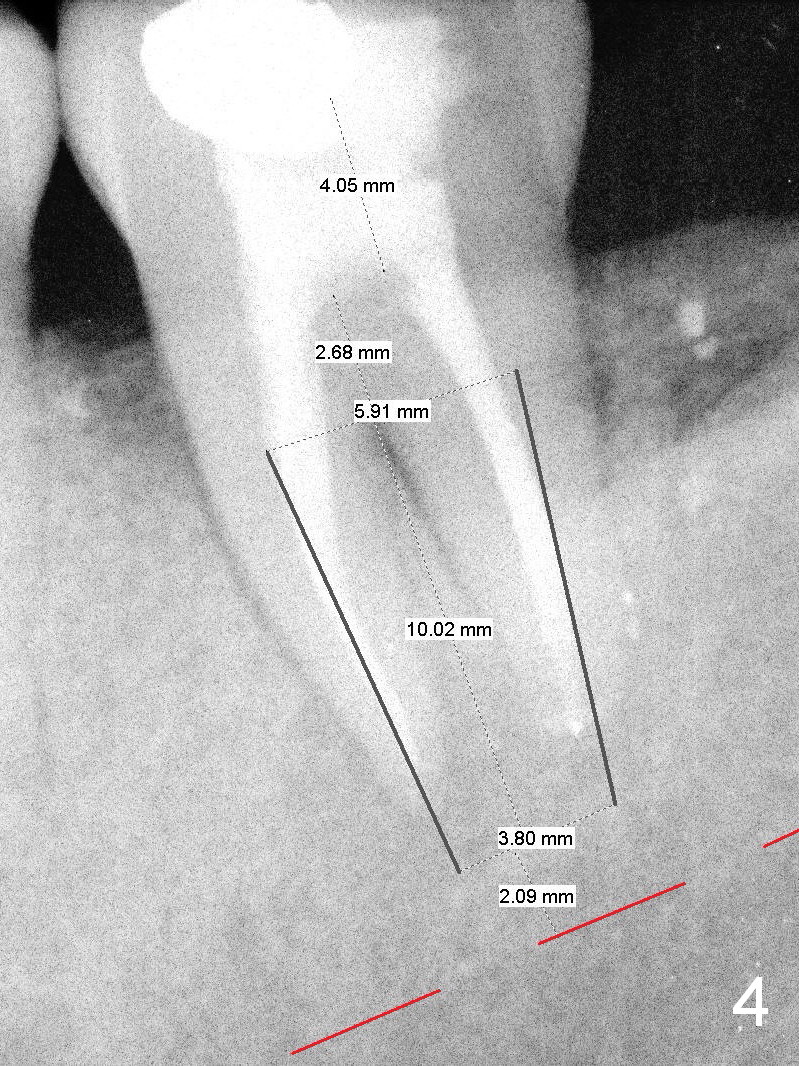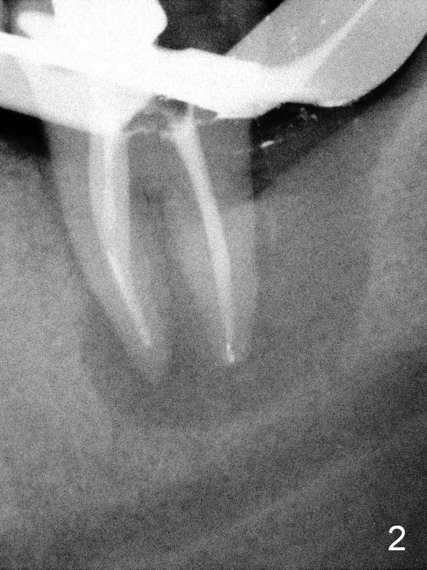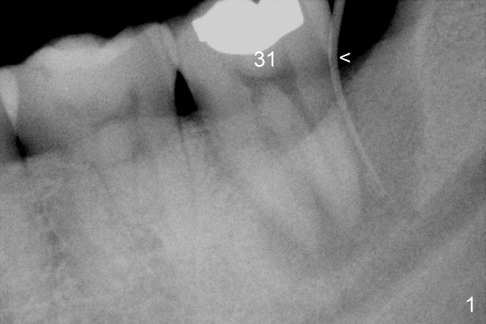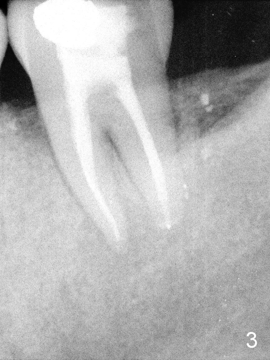 A 55-year-old man must be a dental phobic. With a fistula (Fig.1 <) and large radiolucency associated with the lower left 2nd molar, he postponed root canal therapy for 2 years and 8 months (Fig.2). Later he refused to have crown for the tooth. Three years and 5 months later, the radiolucency seems to have been resolved (Fig.3), but the tooth has fractured with buccal infection. The patient is unwilling to accept treatment of extraction (no antibiotic socket treatment) and immediate implant (Fig.4).
