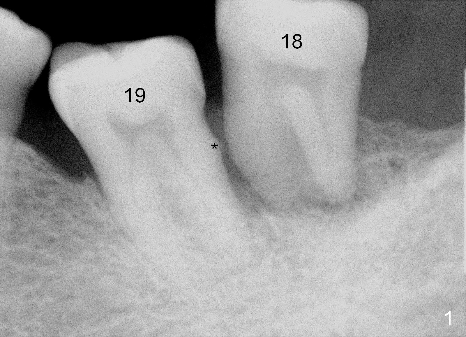 Measures of infection control include pre- and post-op oral antibiotic and Chlorhexidine mouth rinse. Intra-op measures consist of sterile surgical field, intra- and extra-oral sterilization, removal of granulation tissue, application of antibiotic to the socket and copious irrigation. The distal root surface of #19 may have calculus and plaque (Fig.1 *). Scaling & root planing is to be done, followed by application of Emdogain and placement of bone graft.