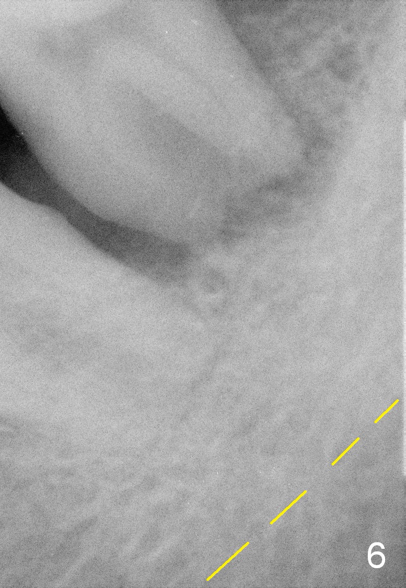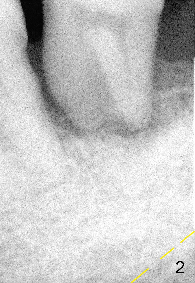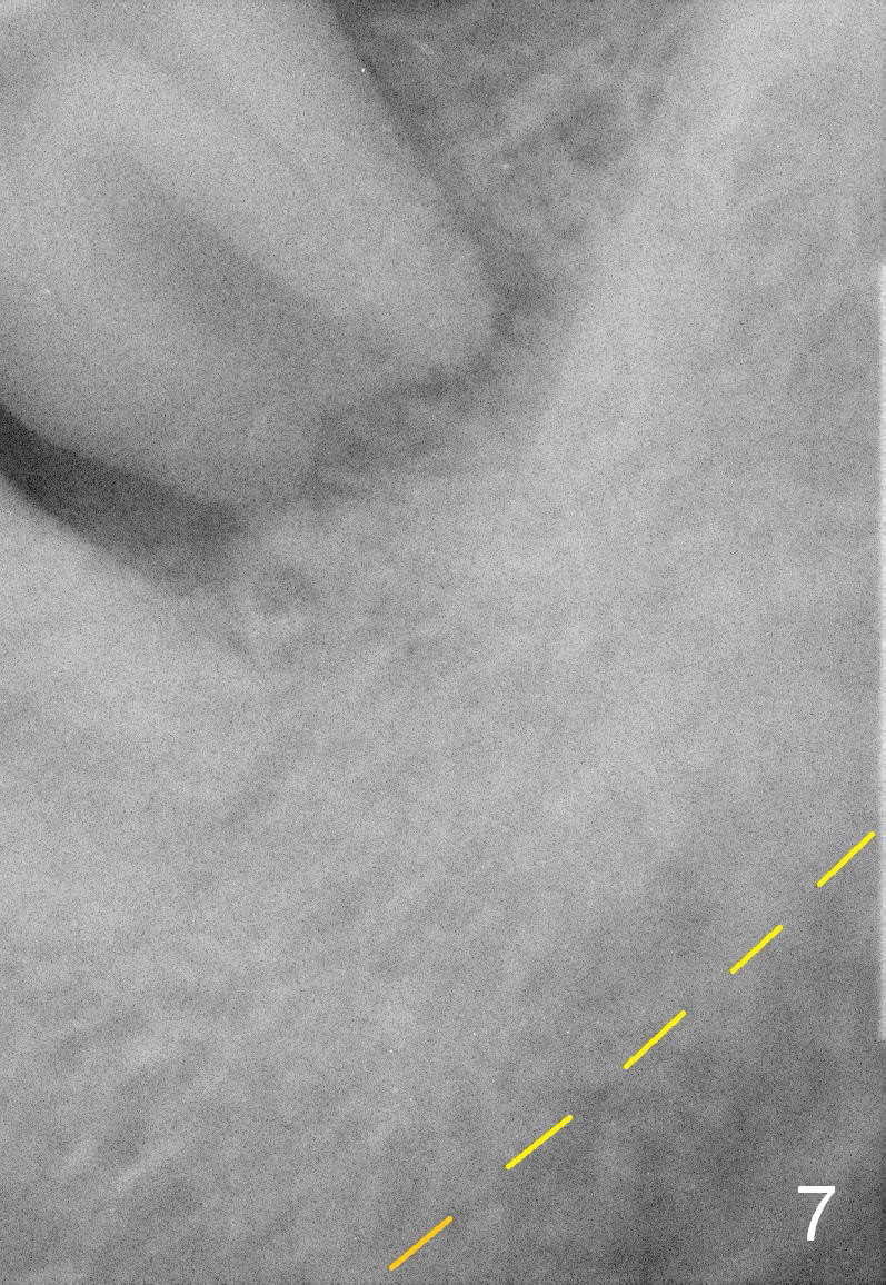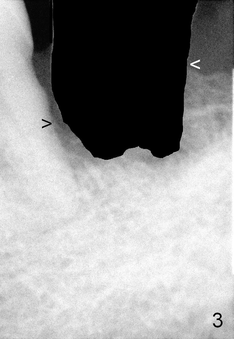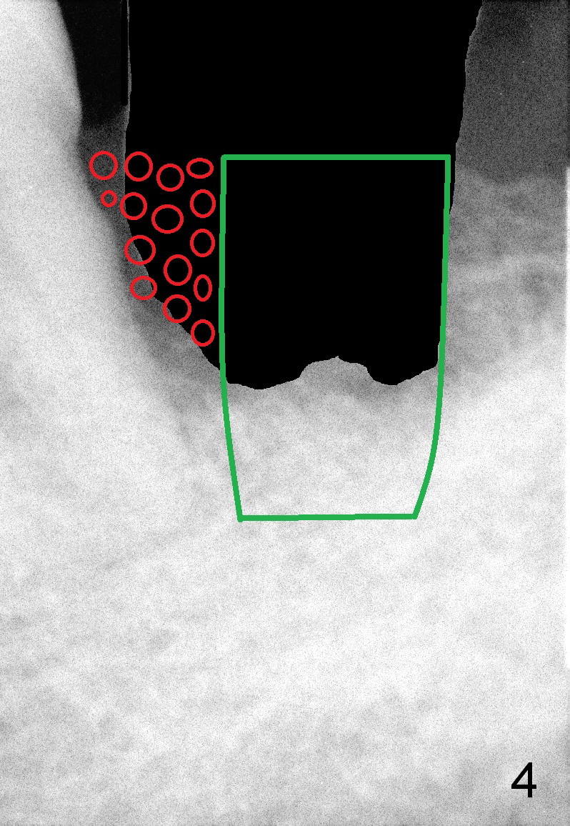 A 63-year-old man has periodontitis. The tooth #18 (probably 17) has mobility III (Fig.1). Three more PAs are taken with deeper placement of #2 sensor (Fig.2,6,7) to show the upper border of the Inferior Alveolar Canal (yellow dashed lines). The affected tooth has severe bone loss, especially mesially (Fig.2,3 (arrowheads)). No matter whether bone (Fig.4) or gingiva (Fig.5)-level implant is placed, the threads should be covered circumferentially by bone, native or grafted (red circles). In Fig.5, the threads are apical to black arrowheads, whereas the rough surface, which should be also contacted by bone, is the lower half above the black arrowheads.