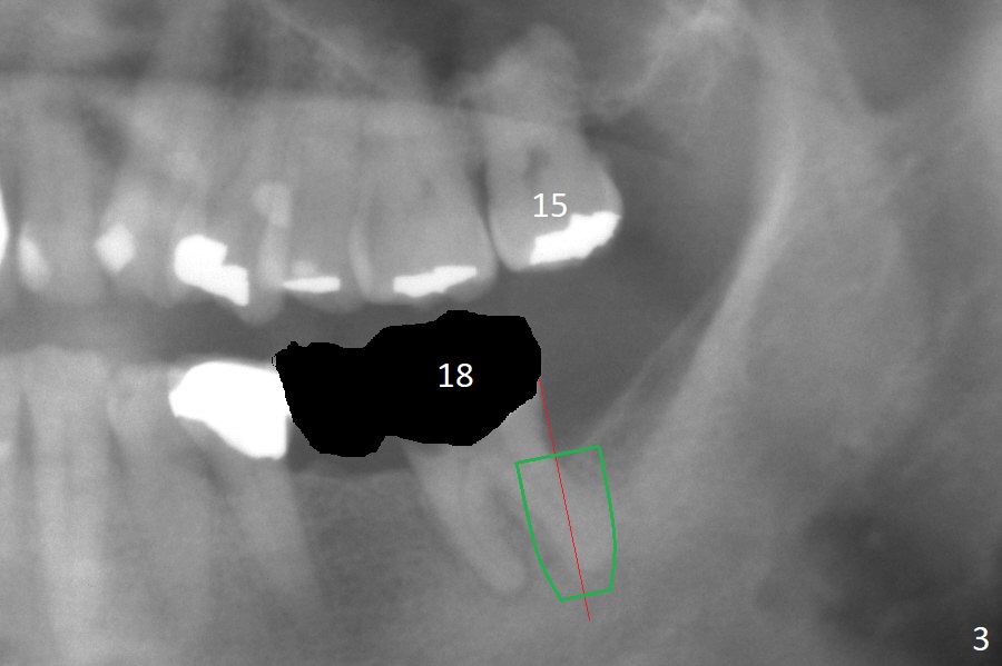 After extraction of the residual root at #18 (Fig.1), the septum is narrow, while the distal socket seems to be the most appropriate site for implant placement (Fig.2 (M: mesial)). In fact the implant needs to tilt slightly distally (relative to the original trajectory of the distal socket, Fig.3 green) to occlude with the opposing tooth. The implant at #19 could be placed more mesially (Fig.4 (*: Vera Graft)).