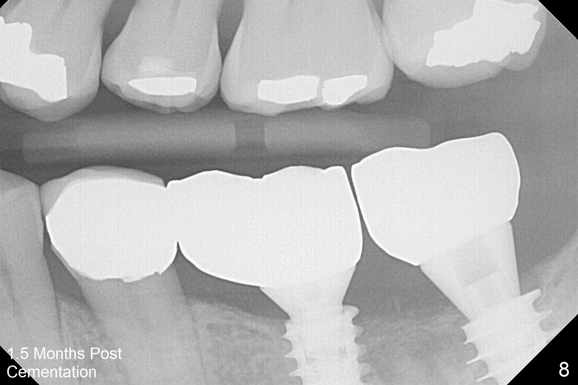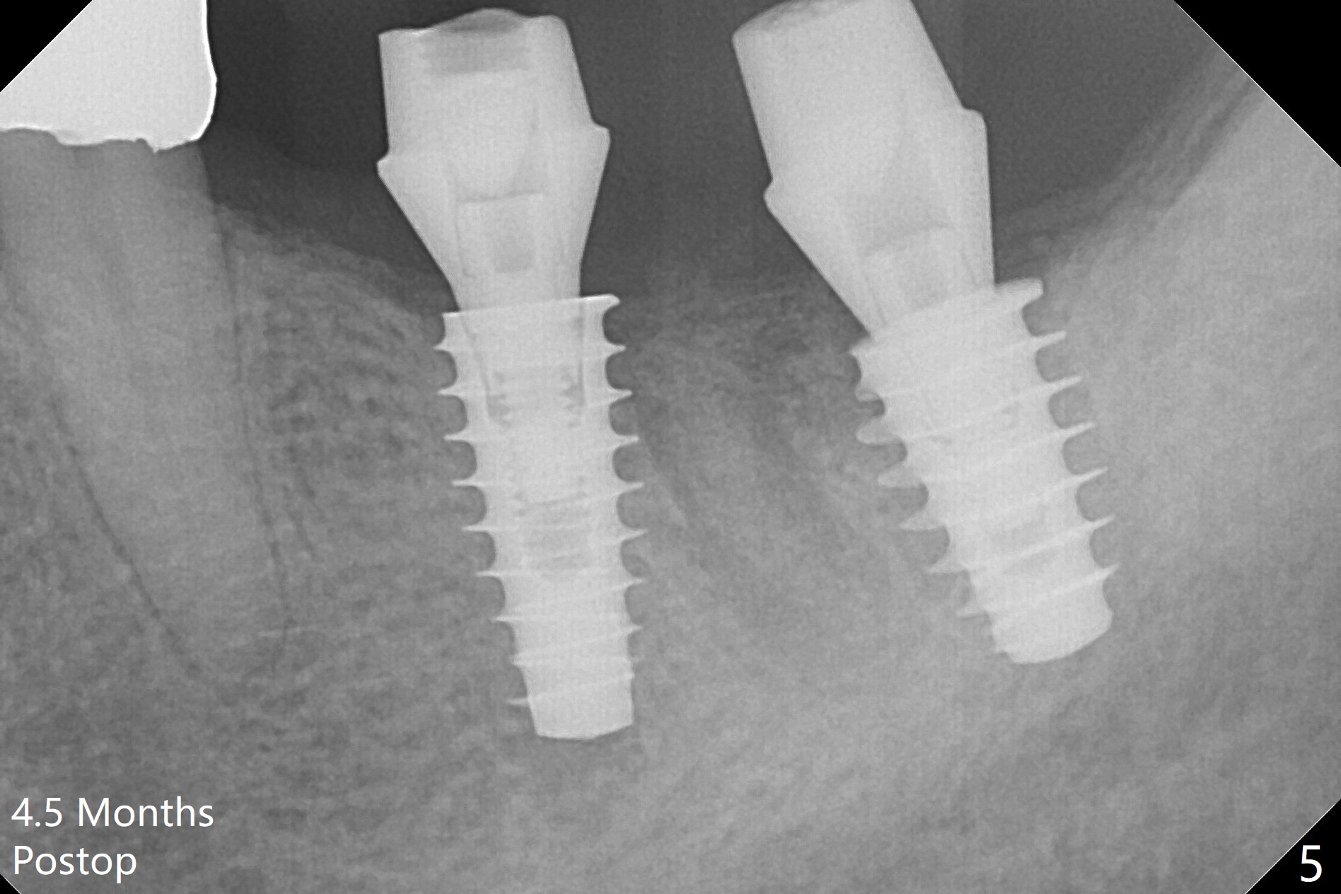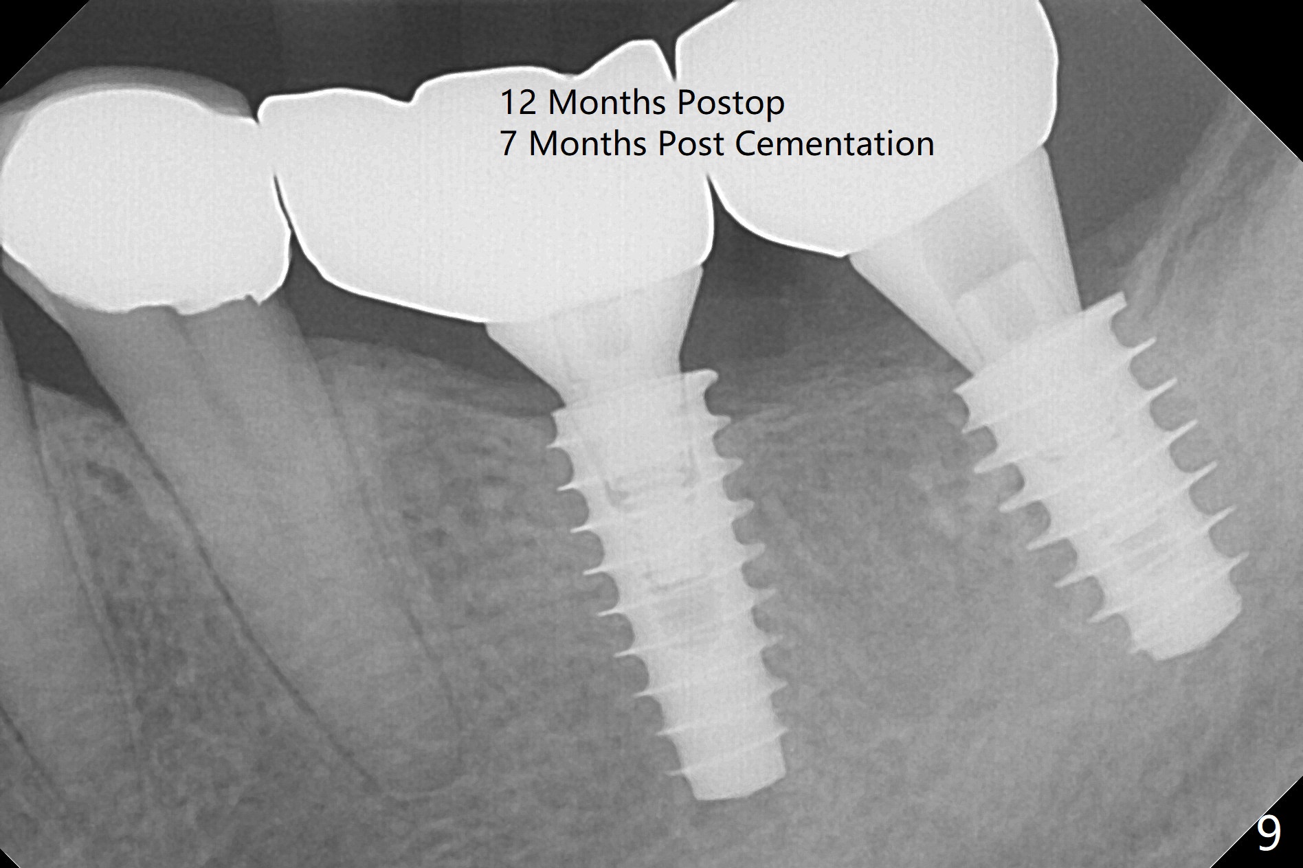 A drawback of placing an implant in the distal socket of the 2nd lower molar is closer to the Inferior Alveolar Canal. The implants seem to have osteointegrated 4.5 months postop (Fig.5). While the ridge at #19 appears to be wider than preop (as compared to Fig.1), that at #18 seems to be atrophic 5 months postop (Fig.6 * (1 week post cementation)). The distal implant placement at #19 may increase possibility of abutment screw loosening during functioning (Fig.7 *). When the patient returns for periodic exam 1.5 months post cementation, loose contact between the implant crowns is noted (Fig.8). The bony trabeculae form between the 2 implants crestally 12 months postop, i.e., 7 months post cementation (Fig.9). The loose contact between the 2 implants is corrected 14 months post cementation.
