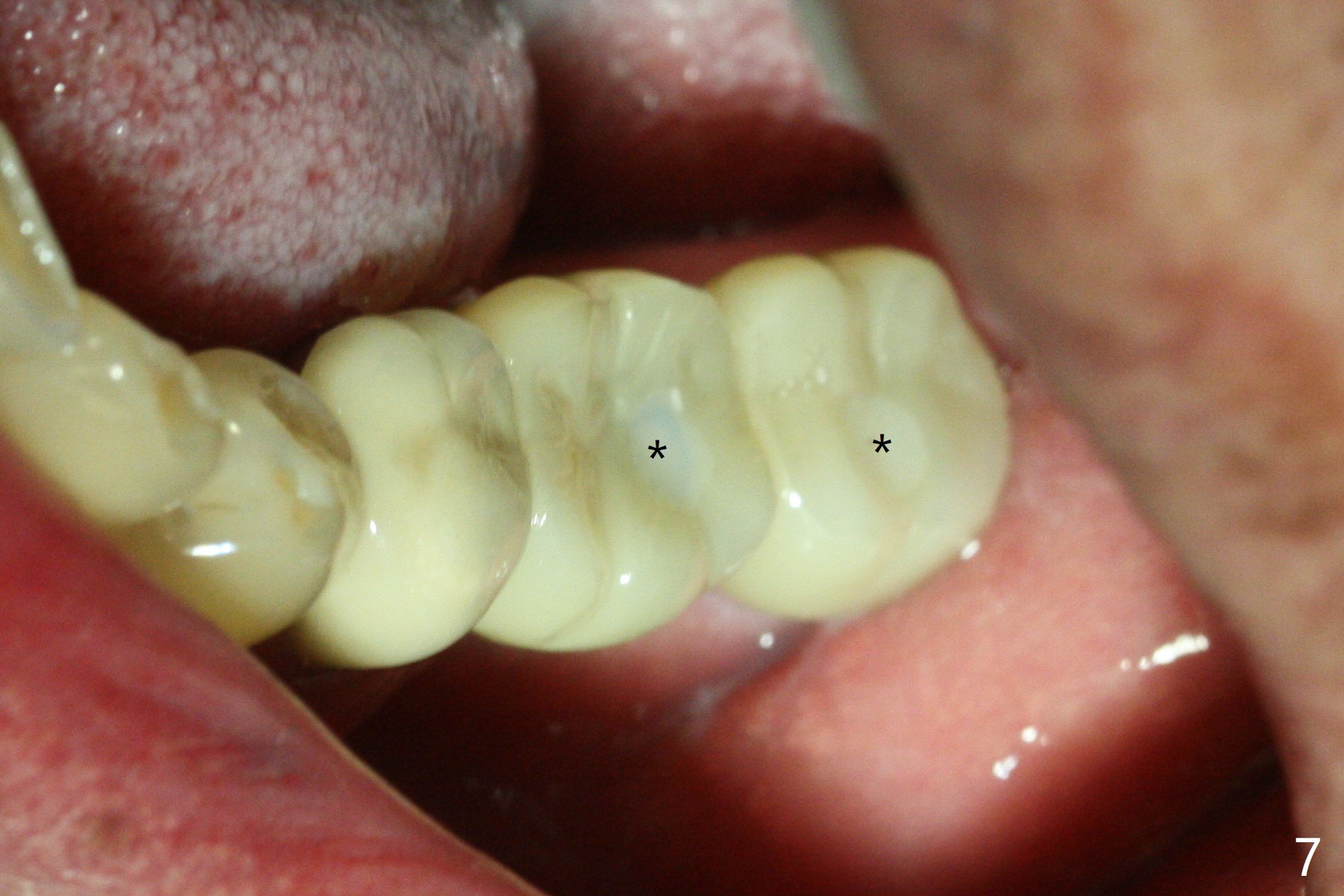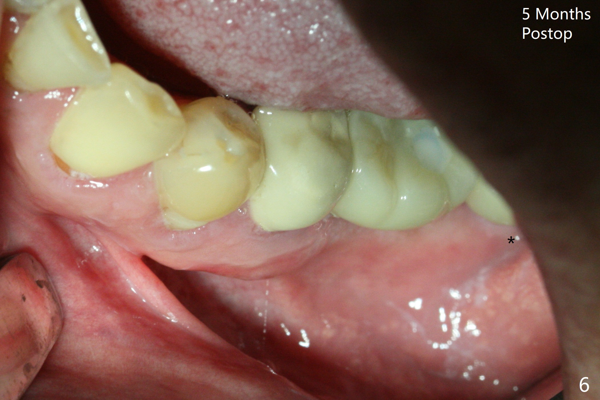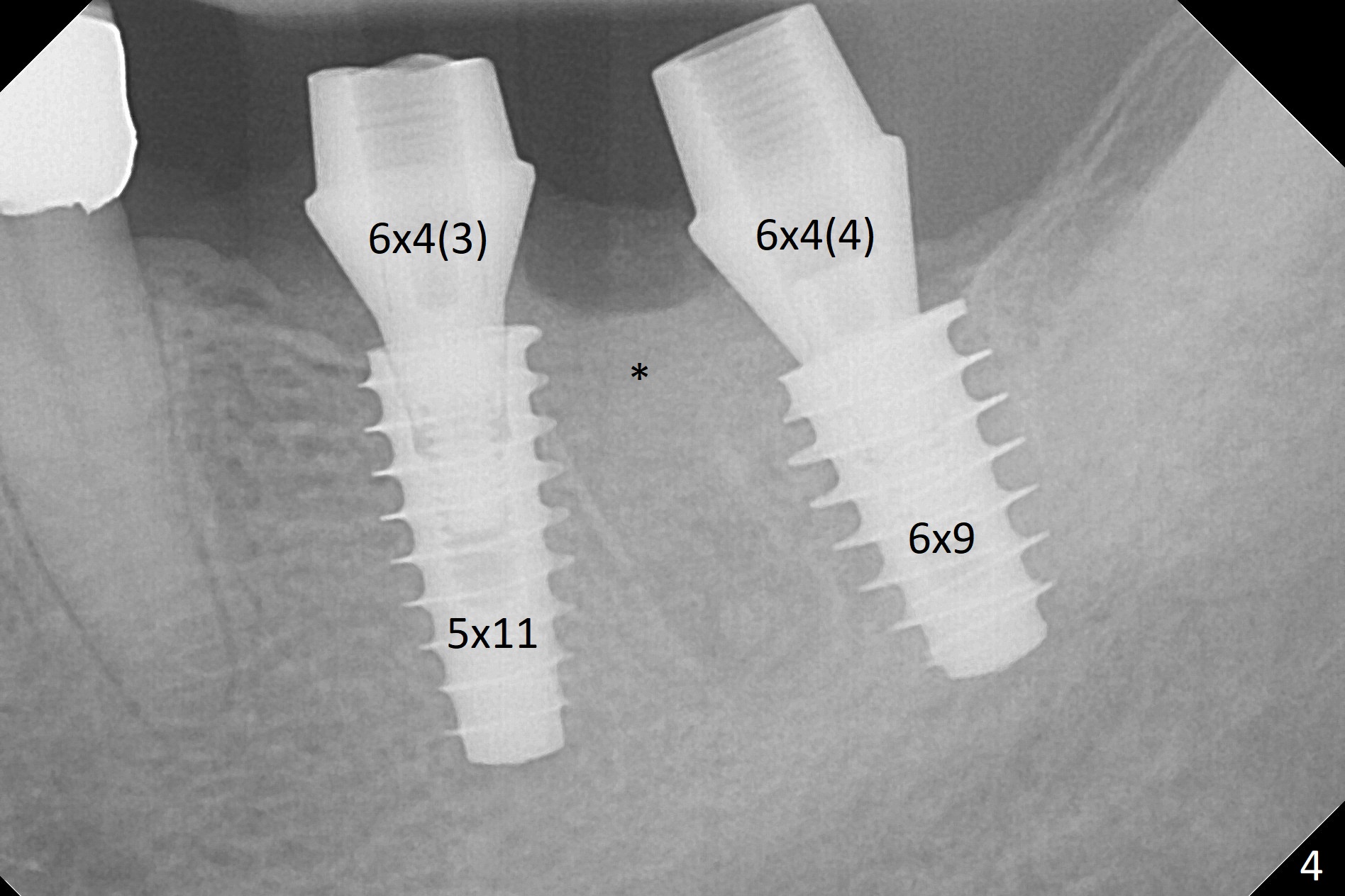 A drawback of placing an implant in the distal socket of the 2nd lower molar is closer to the Inferior Alveolar Canal. The implants seem to have osteointegrated 4.5 months postop (Fig.5). While the ridge at #19 appears to be wider than preop (as compared to Fig.1), that at #18 seems to be atrophic 5 months postop (Fig.6 * (1 week post cementation)). The distal implant placement at #19 may increase possibility of abutment screw loosening during functioning (Fig.7 *). When the patient returns for periodic exam 1.5 months post cementation, loose contact between the implant crowns is noted (Fig.8). The bony trabeculae form between the 2 implants crestally 12 months postop, i.e., 7 months post cementation (Fig.9). The loose contact between the 2 implants is corrected 14 months post cementation.
