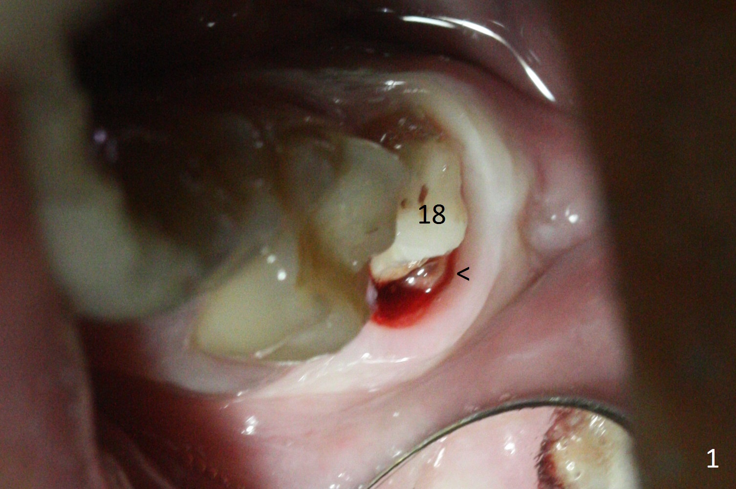 The crown at #18 dislodges; there is buccal subgingival caries (Fig.1 <). The gingiva is blanched after intraligamental injection. In fact intraop hemorrhage is substantially reduced.