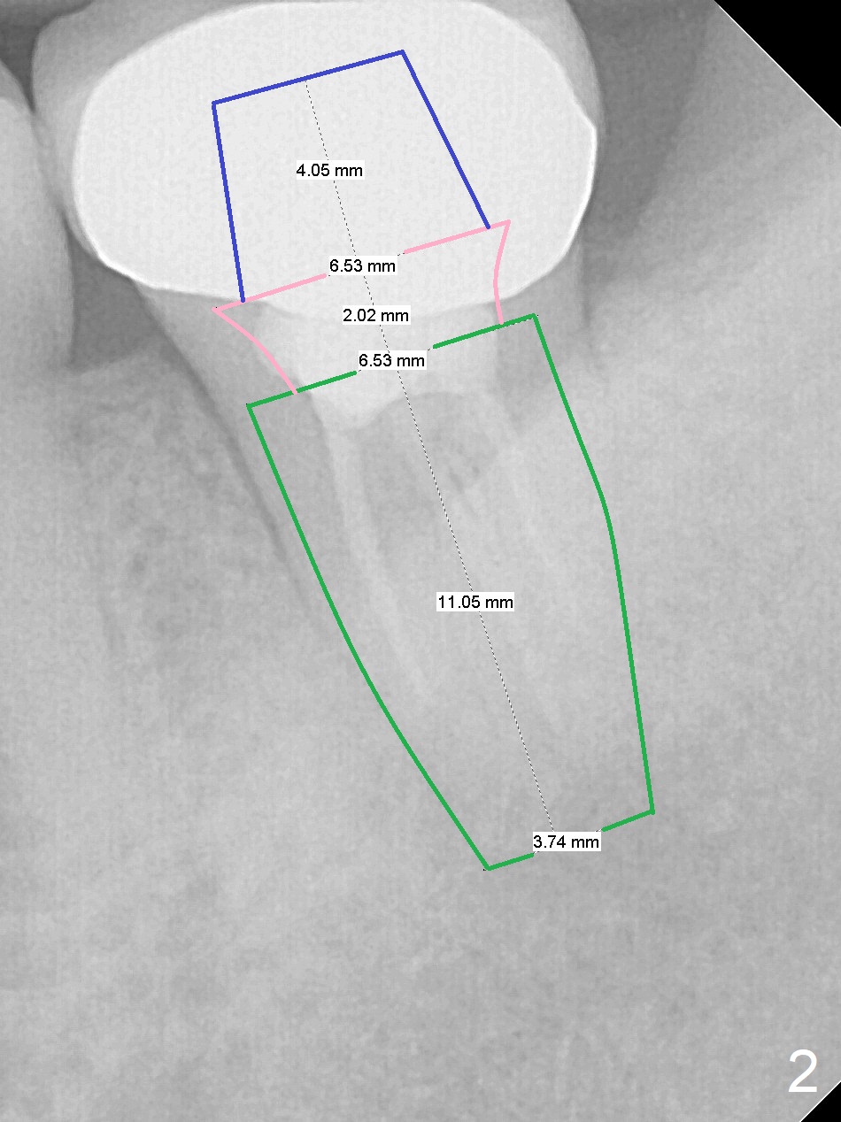 A 32-year-old woman has a buccal fistula after RCT (Fig.1). She would like to have extraction and implant to eradicate the lesion. In addition, there appear to be several canals which need to be retreated. Since the Inferior Alveolar Canal (IAC) is indistinct, osteotomy and implant placement will be confined 1-2 mm beyond the socket after debridement (Fig.2). Take the 1st intraop PA as early as possible (after use of 2 mm Bicon drill with extension and insertion of marked parallel pin). Osteotomy is buccal (if the buccal plate defect is not severe), as the IAC is lingual at this site. Also consider initiate osteotomy in the mesial slope of the socket. Prepare Sinus Master Kit for possible use of its short stoppers (2-6 mm).