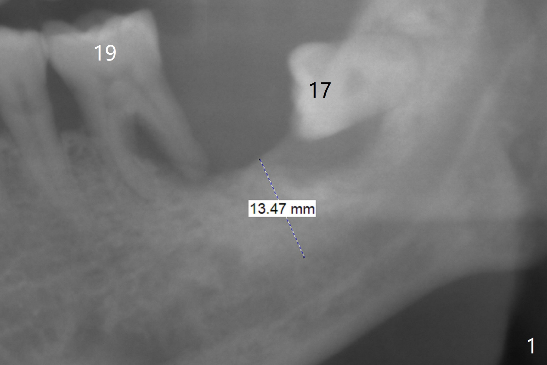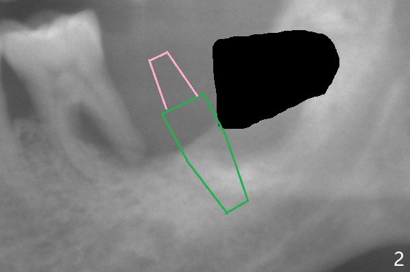 A 65-year-old man agrees to have an implant at #18 immediately after #17 extraction because of abutment screw loosening at #30. But the patient refuses #19 extraction. Since there is severe vertical bone loss at #18 (Fig.1), the implant should be as large as possible and tissue-level (Fig.2, 5 or 6x14 mm). The abutment is expected to be 5 mm long. After implant osteointegration, the abutment should be cemented with Panavia V5. To control infection at #19 temporarily, scale and place Arestin.